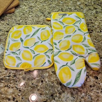 An assortment of kitchen accessories that includes a stainless steel strainer, plastic mixing bowl, handheld strainers and a Taylor scale that powered on when turned on. Additionally, there are Cuisinart pot holders, three cork trivets and two aprons. The large strainer measures approximately 10"D x 5". Shipping available 1514 / 1517 sold -