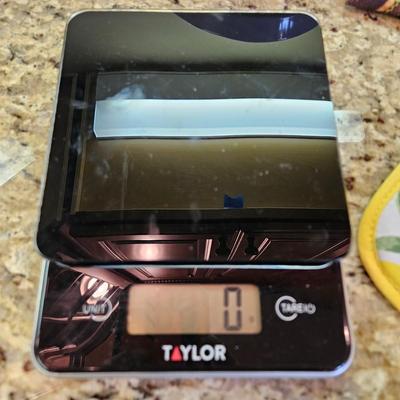 An assortment of kitchen accessories that includes a stainless steel strainer, plastic mixing bowl, handheld strainers and a Taylor scale that powered on when turned on. Additionally, there are Cuisinart pot holders, three cork trivets and two aprons. The large strainer measures approximately 10"D x 5". Shipping available 1513 / 1517 sold -