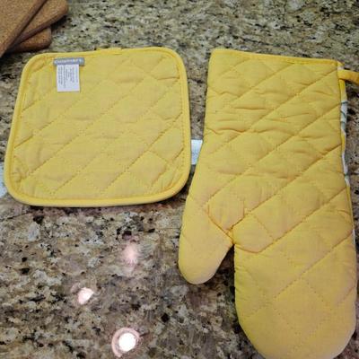 An assortment of kitchen accessories that includes a stainless steel strainer, plastic mixing bowl, handheld strainers and a Taylor scale that powered on when turned on. Additionally, there are Cuisinart pot holders, three cork trivets and two aprons. The large strainer measures approximately 10"D x 5". Shipping available 1511 / 1517 sold -