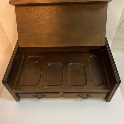 A Price Import - Japan. Vintage storage box. Vintage Wooden Valet Box | Nautical Storage Box | Wood Valet Tray with Jewelry Drawer. Vintage wooden valet box has sailing ships with metal anchor clasps (hinges) on top and a ship steering wheel medallion on the front. This nautical theme storage box opens at the top to a valet tray and the front has a jewelry drawer. The valet has 4 slots for a watch, pocket change, etc and the drawer below has 7 slots lined in red velour. It is in good vintage condition. 10 / 721 -