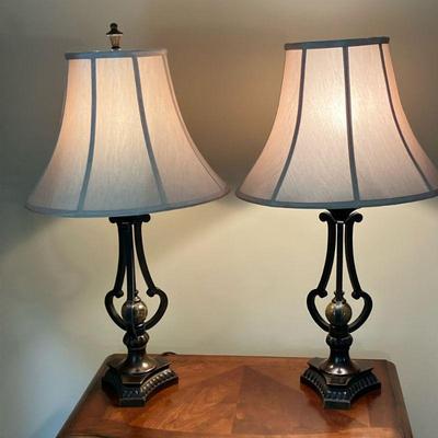 (4pc) Table Lamps & Candles | Includes: Painted black metal battery operated lamp, Glass Cylinder electric lamp with metal surround, Distressed paint wooden pedestal candle holder and Glass cylinder candle holder in basket with eucalyptus wreath surround. - l. 5” x w. 5” x h. 18.5” w/Sh in (Glass Cylinder Lamp) 27 / 92 -