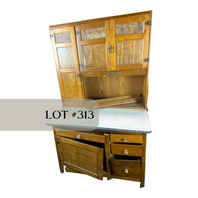 SELLERS Birch and Oak Hoosier. Counter pulls out, but needs some oil. Nice flour dispenser. Slag glass inserts in the doors. //::\\ Please see photos for details and condition. No attempt has been made to hide any imperfections. All items listed in this auction are warehouse items, and need to be cleaned. A majority of the items need restoration as well. All items are sold AS IS and WITHOUT GUARANTEE. If you are uncertain about an item, DO NOT BID. Due to the nature of this online auction in-person inspection is HIGHLY recommended. All Sales are FINAL. Pick Up Times are FIRM. Please confirm with your own schedule that you can pick up in the scheduled times listed in the Terms and Conditions. Any questions please message the auctioneer. DO NOT Contact The Harp Gallery. 2930 / 4745 sold -