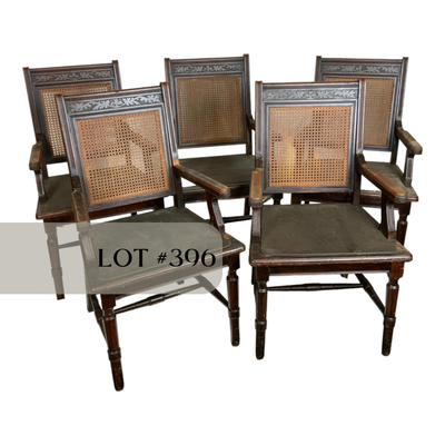 Set of 5 Caned Back Leather Seat Chairs. A really nice set! //::\\ Please see photos for details and condition. No attempt has been made to hide any imperfections. All items listed in this auction are warehouse items, and need to be cleaned. A majority of the items need restoration as well. All items are sold AS IS and WITHOUT GUARANTEE. If you are uncertain about an item, DO NOT BID. Due to the nature of this online auction in-person inspection is HIGHLY recommended. All Sales are FINAL. Pick Up Times are FIRM. Please confirm with your own schedule that you can pick up in the scheduled times listed in the Terms and Conditions. Any questions please message the auctioneer. DO NOT Contact The Harp Gallery. 3605 / 4745 sold -