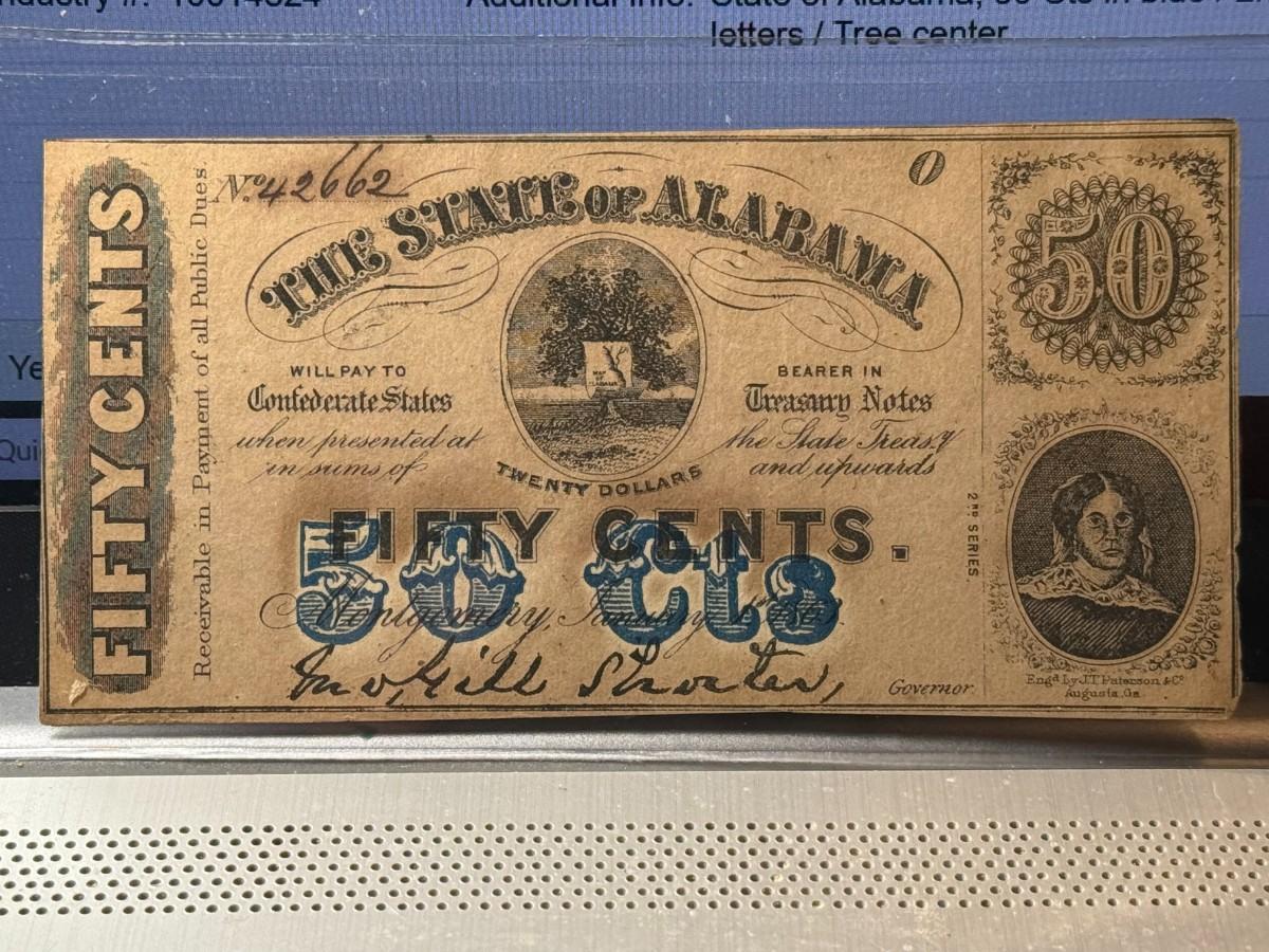 1863 50 Cents Alabama, Montgomery State of Alabama, 50 Cents in Blue / 2nd SERIES in Small Letters / Tree Center as Pictured. $5 DOMESTIC SHIPPING.