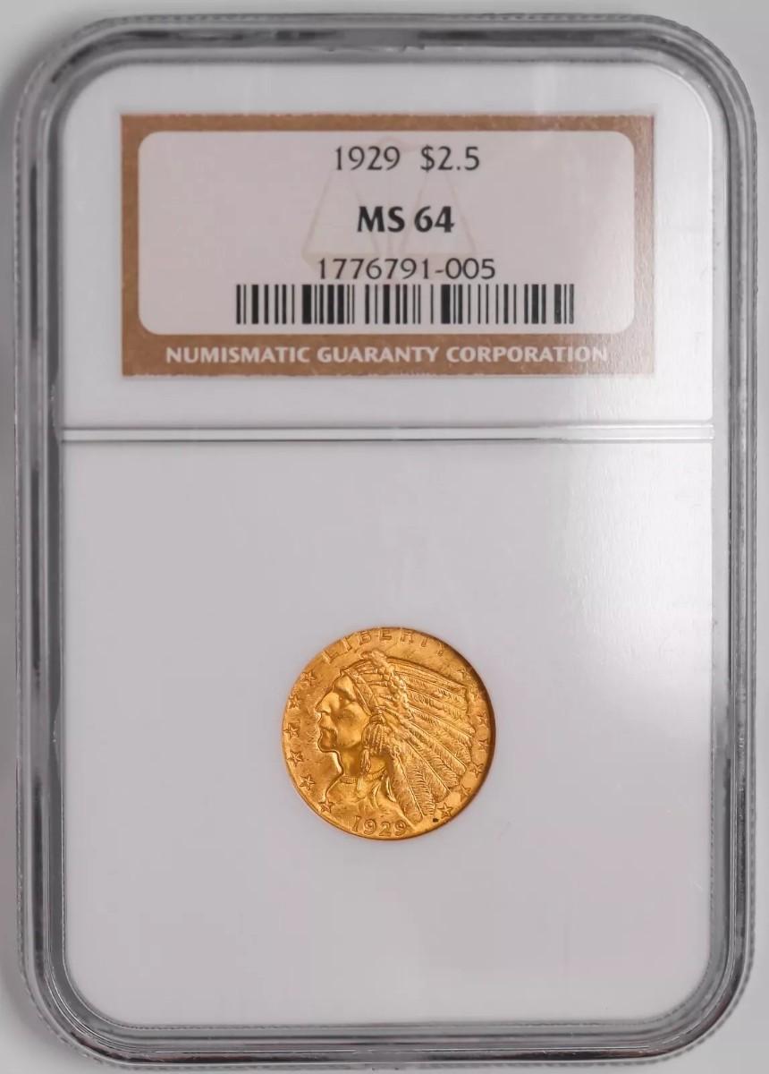 1929 $2.5 Dollar Gold Indian Head Liberty Quarter Eagle Coin NGC MS-64