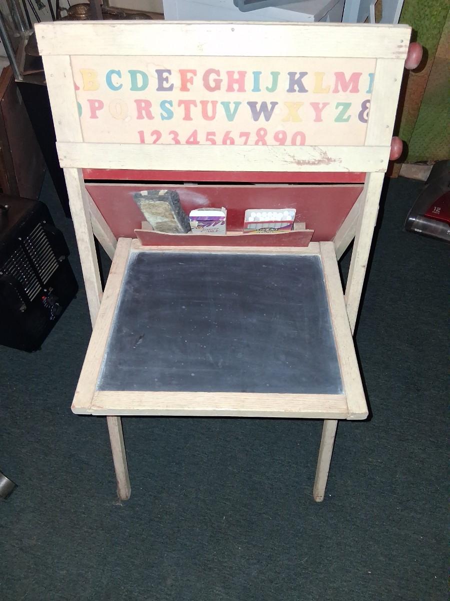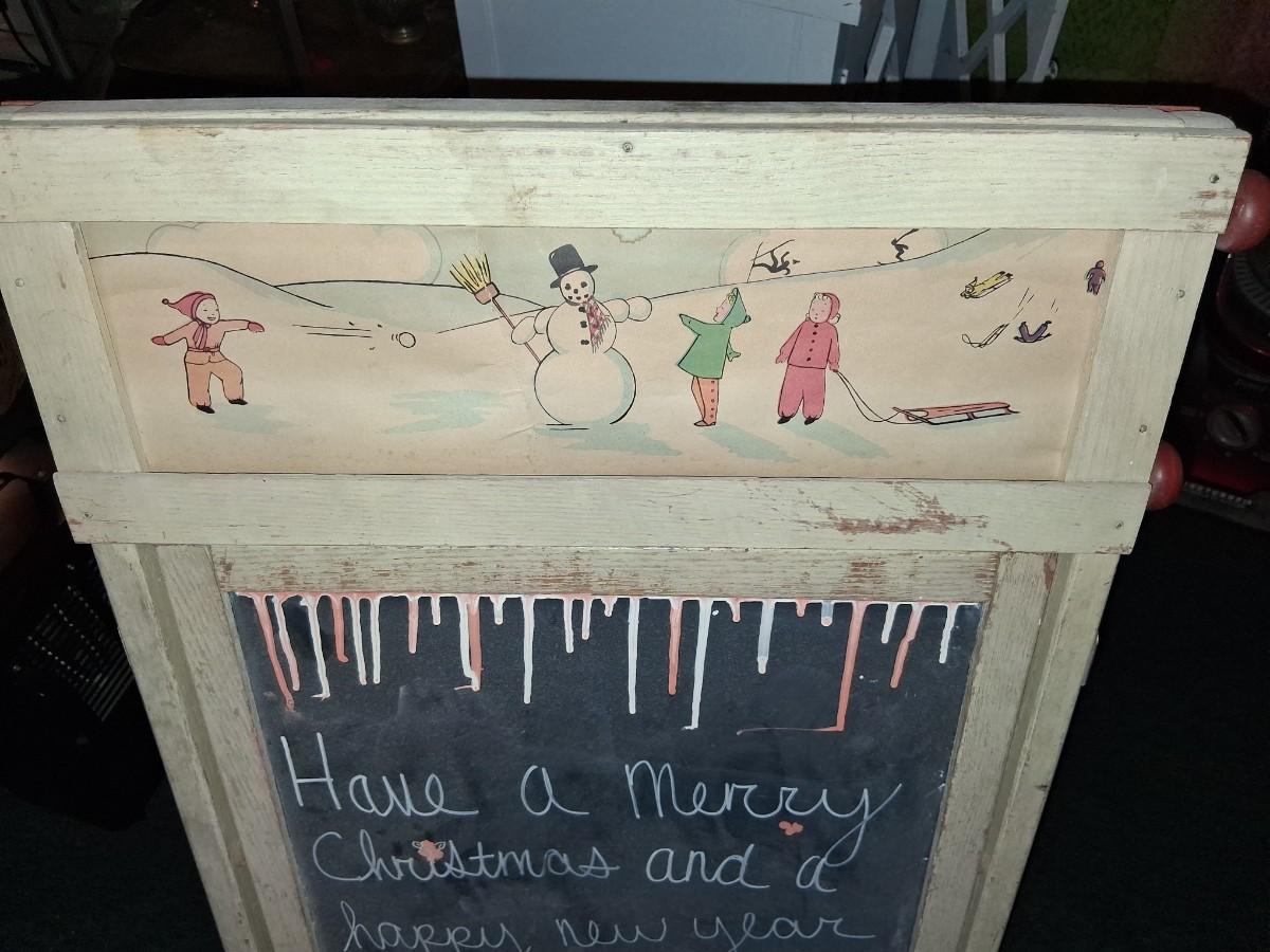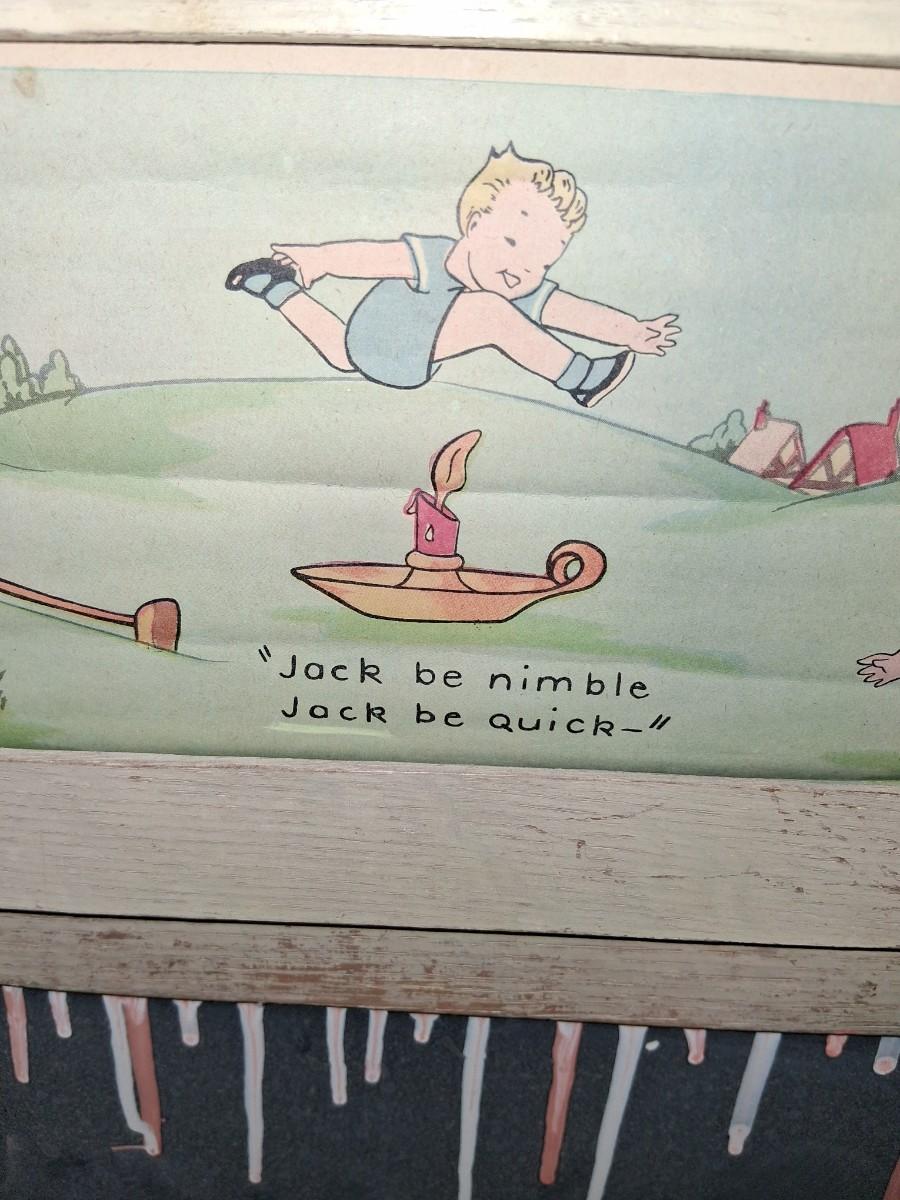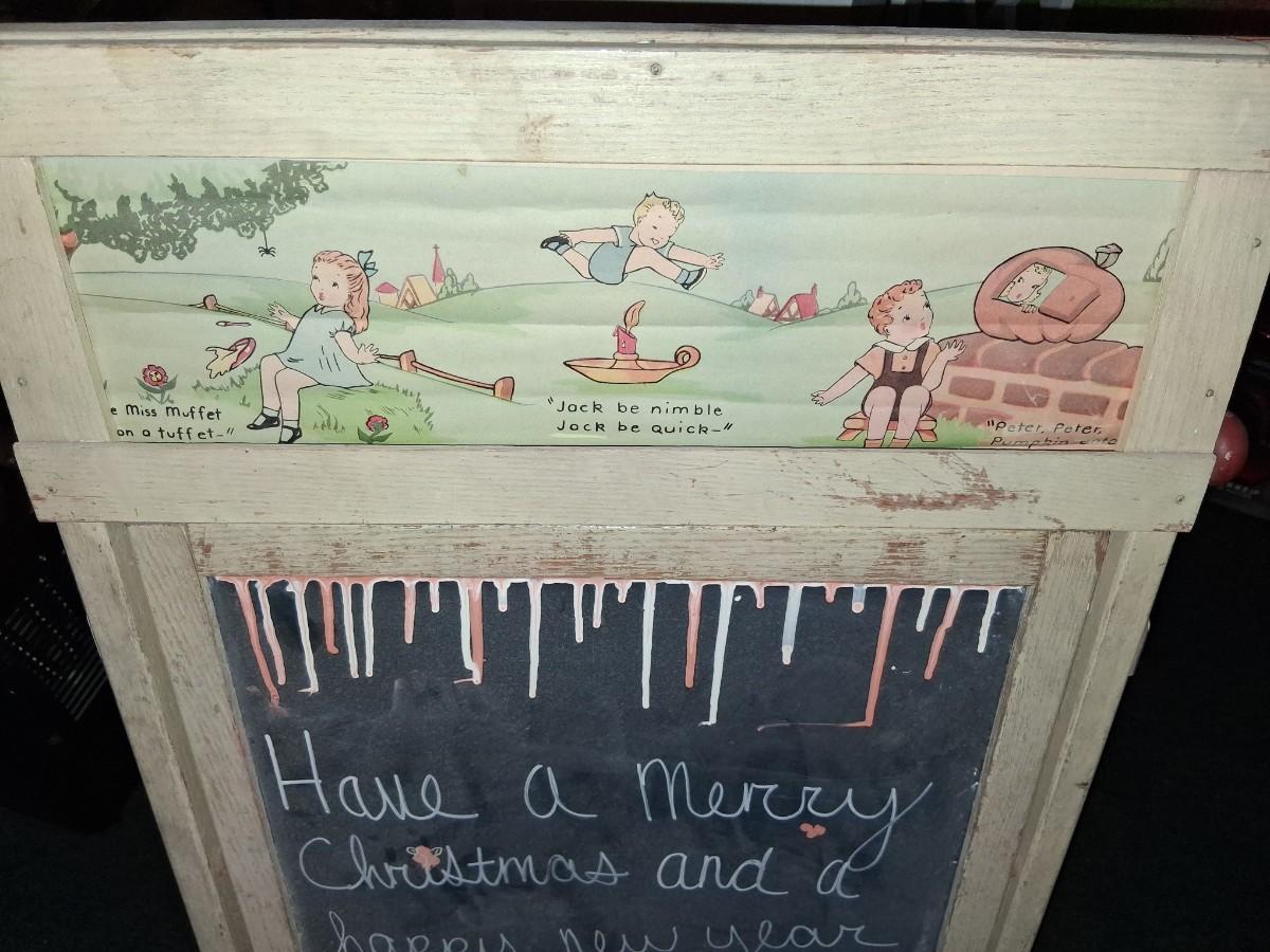 This Easel has rarely had the pictures turned very often. The artwofk on this desk is in excellent condition. One picture has folding & some discoloration from being the last picture on the roll & not being turned. Complete with eraser & chalk. Slate is in great condition. Rollers turn easily. The Artwork includes nursery rhymes, letters, numbers, & more.