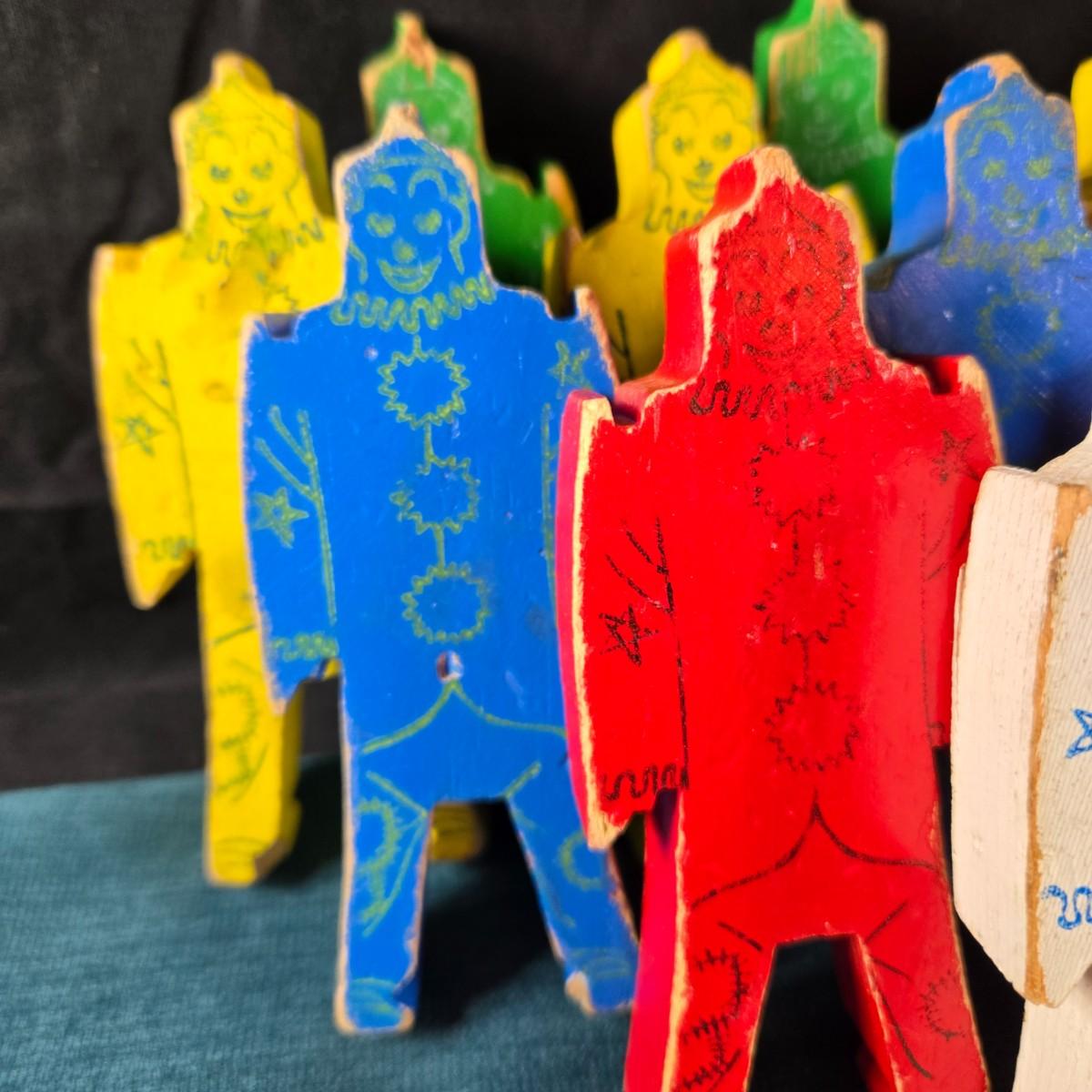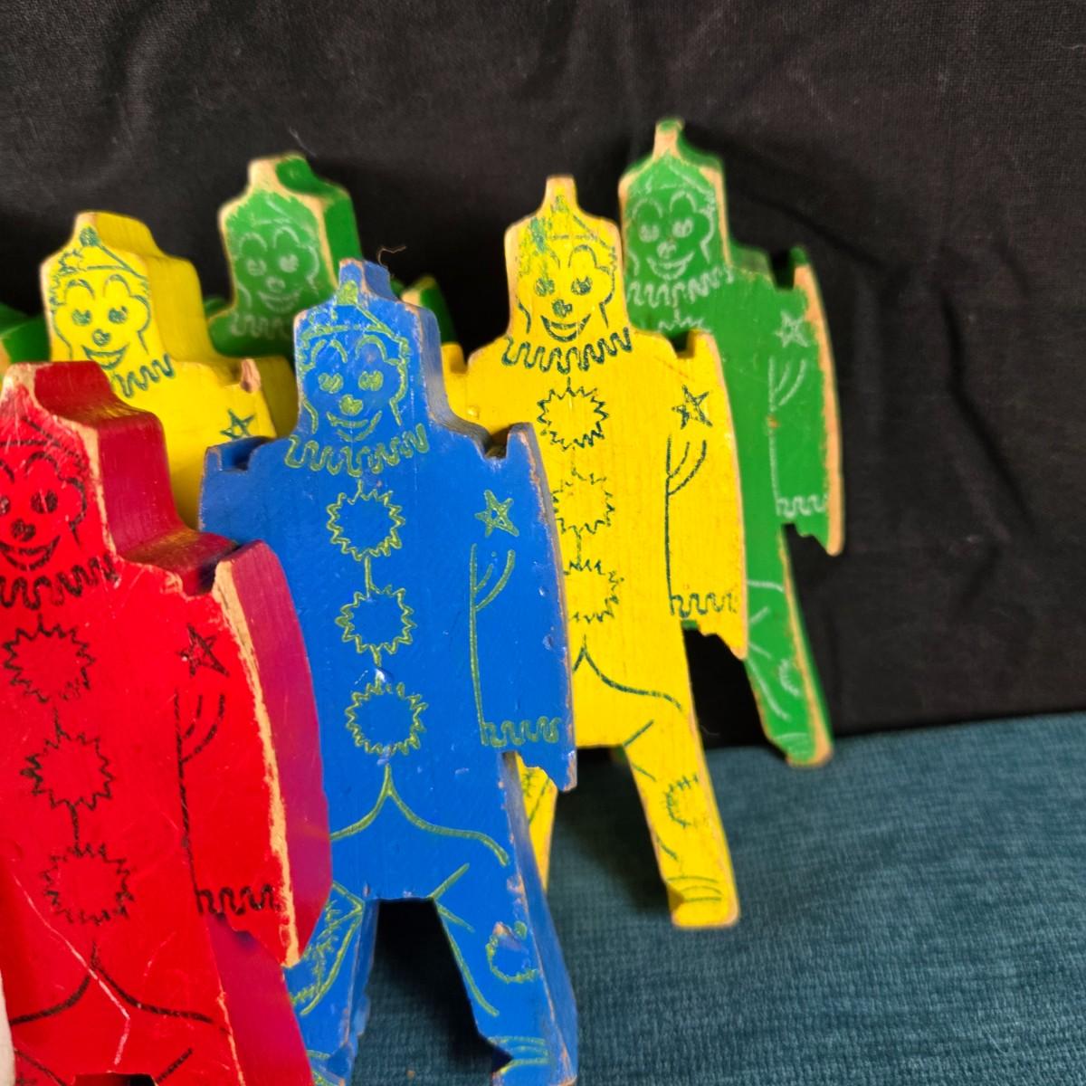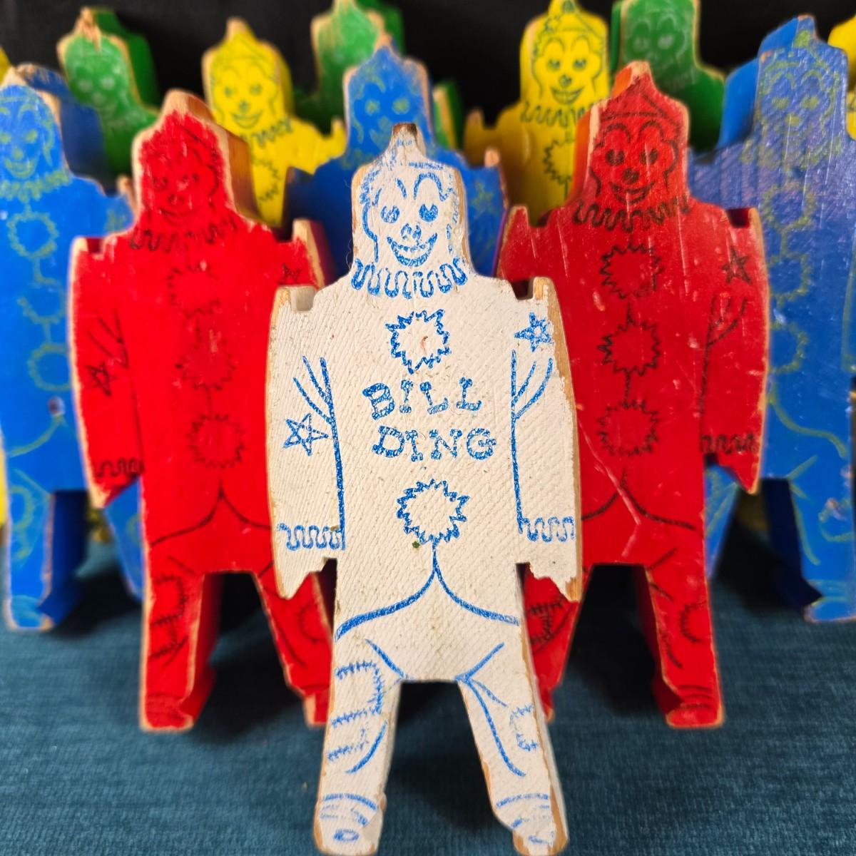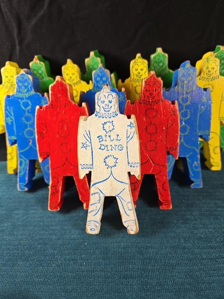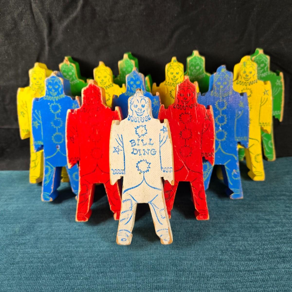 This auction lot is for a 1940's Bill Ding Wooden Building Set. This large set of 14 wooden Bill Ding building pieces includes the rare White Bill Ding himself. It definitely was loved and played with, but with that in mind, all pieces are complete - just a bit worn. Such a great historical toy. Excellent for shelf display.