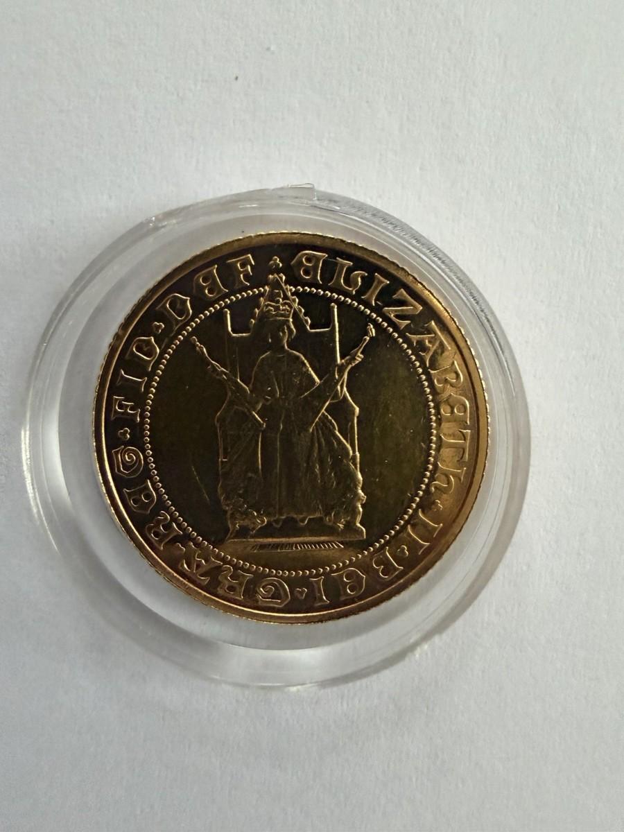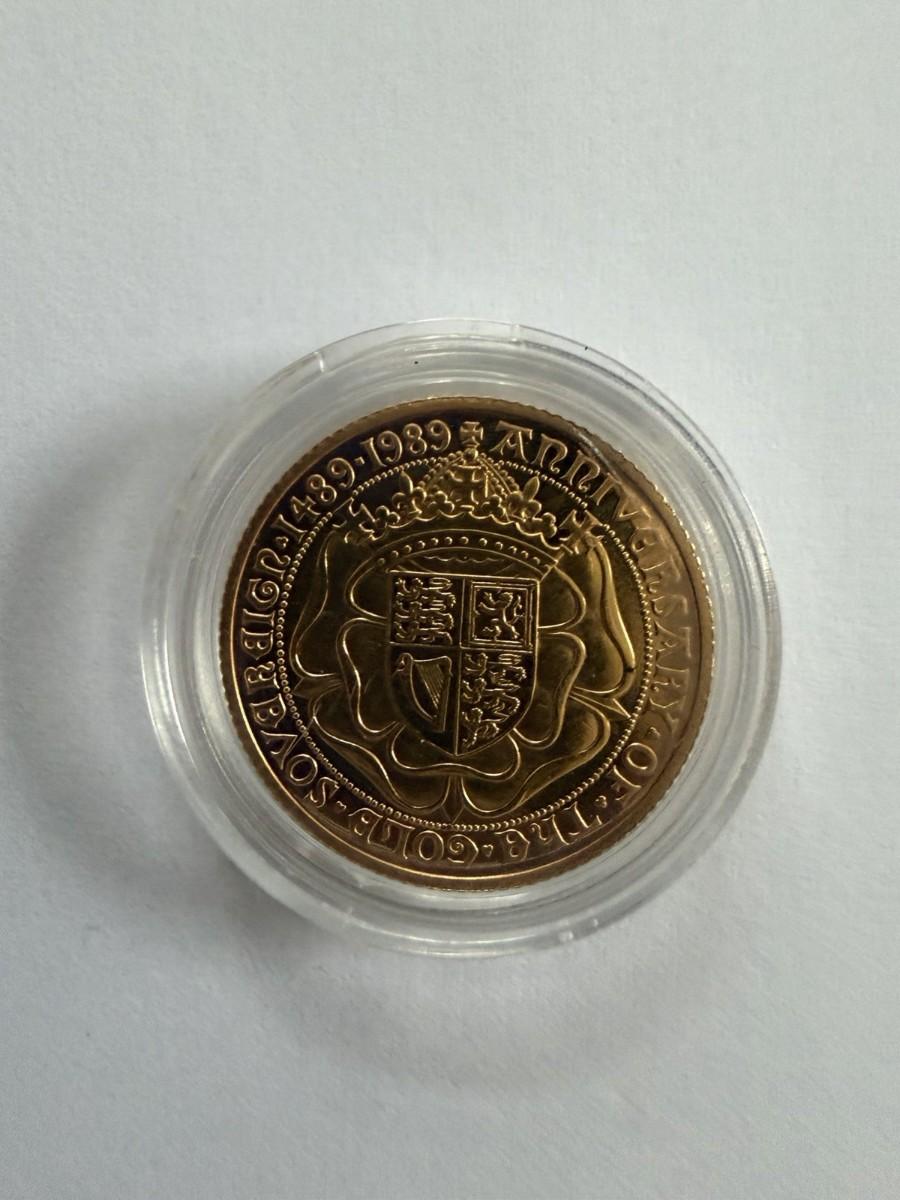 The product is a 1989 Gold Proof Full Sovereign coin commemorating the 500th anniversary of the Sovereign. This coin is housed in a capsule for safekeeping and display. It is a rare and valuable collectible piece for coin enthusiasts and collectors interested in British numismatics from the 1980s. The design of the coin likely features intricate detailing and a high level of craftsmanship, making it a prized addition to any collection.