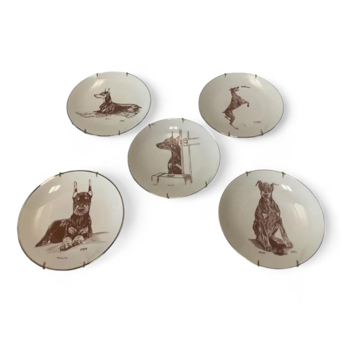 This 1992 Doberman Pinscher decorative plate from Laurelwood Lehigh Valley is a limited edition masterpiece with only 200 plates ever made. The plate features an exquisite depiction of the Doberman Pinscher highlighting its noble stature sleek coat and intense intelligent gaze. The artwork is rendered in vibrant lifelike colors that bring out the breeds elegance and strength set against a beautifully designed background.