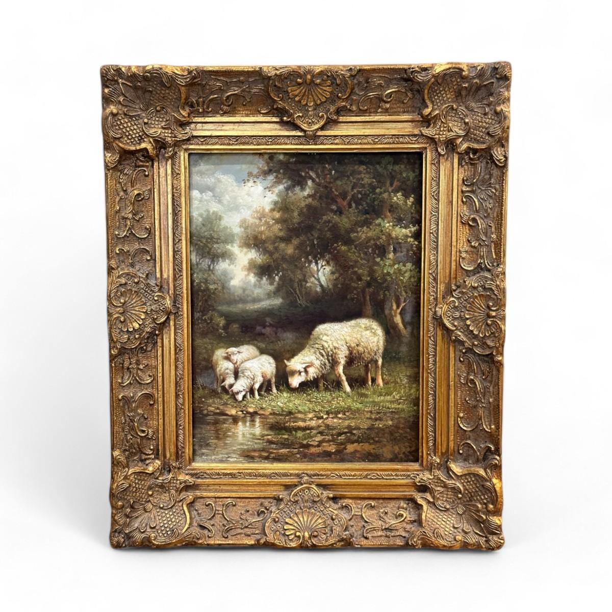 This 19th-century pastoral landscape captures the serene beauty of rural life, with a gentle flock of sheep grazing peacefully in the foreground. Rolling hills, lush greenery, and soft, natural light imbue the scene with tranquility, evoking the simple charm of the countryside. The artist’s careful use of color and brushwork highlights the earthy tones of nature and the soft, fluffy texture of the sheep’s wool..