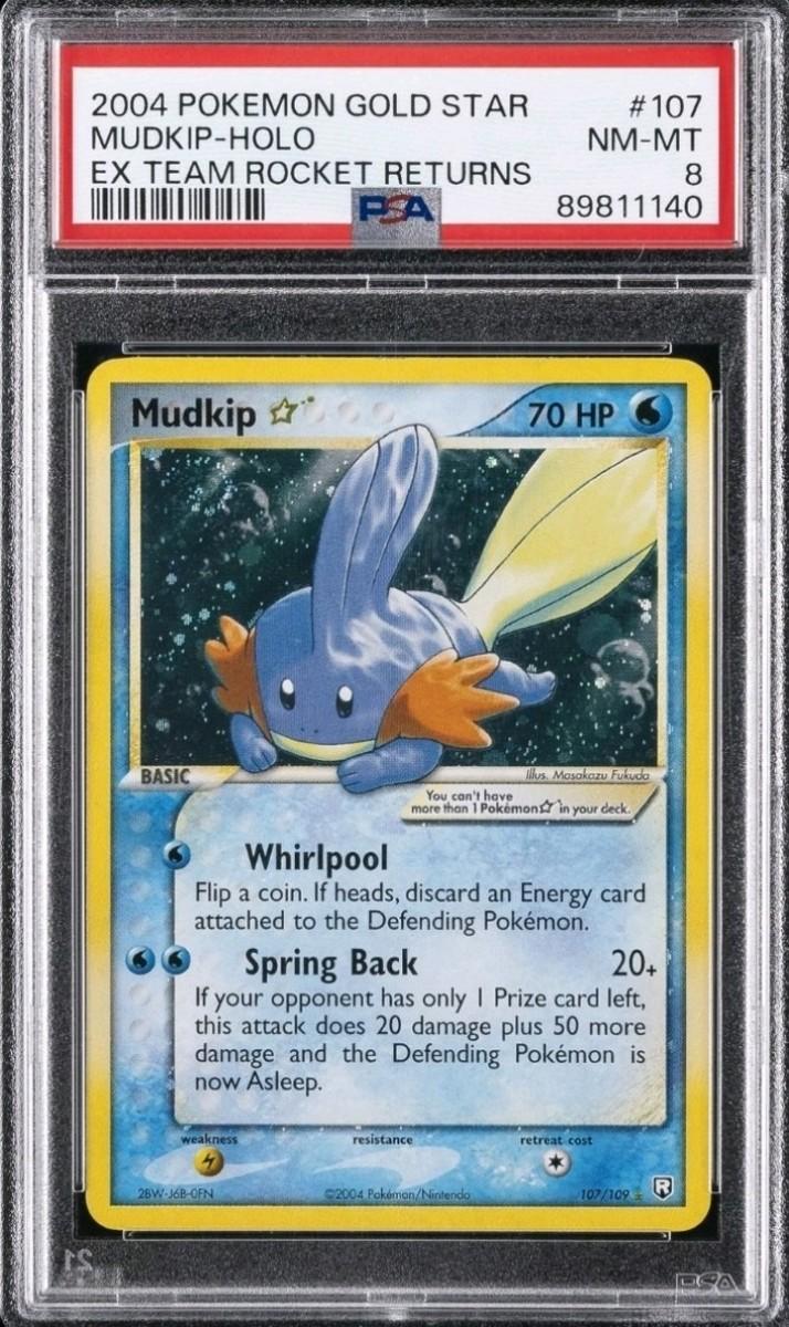 Details: Set: EX Team Rocket Returns | Year: 2004 | Card Number: 107 | Character: Mudkip | Rarity: Gold Star | Finish: Holo | Grade: PSA 8 | Grader: Professional Sports Authenticator (PSA) | Game: Pokémon TCG | Country of Origin: Japan | Autographed: No