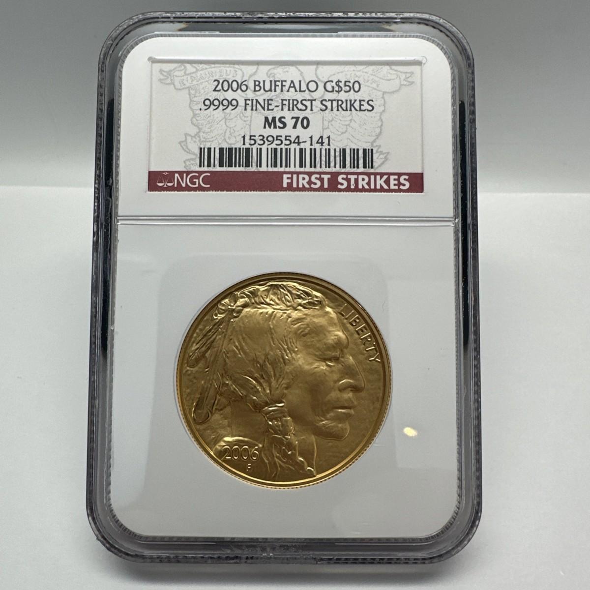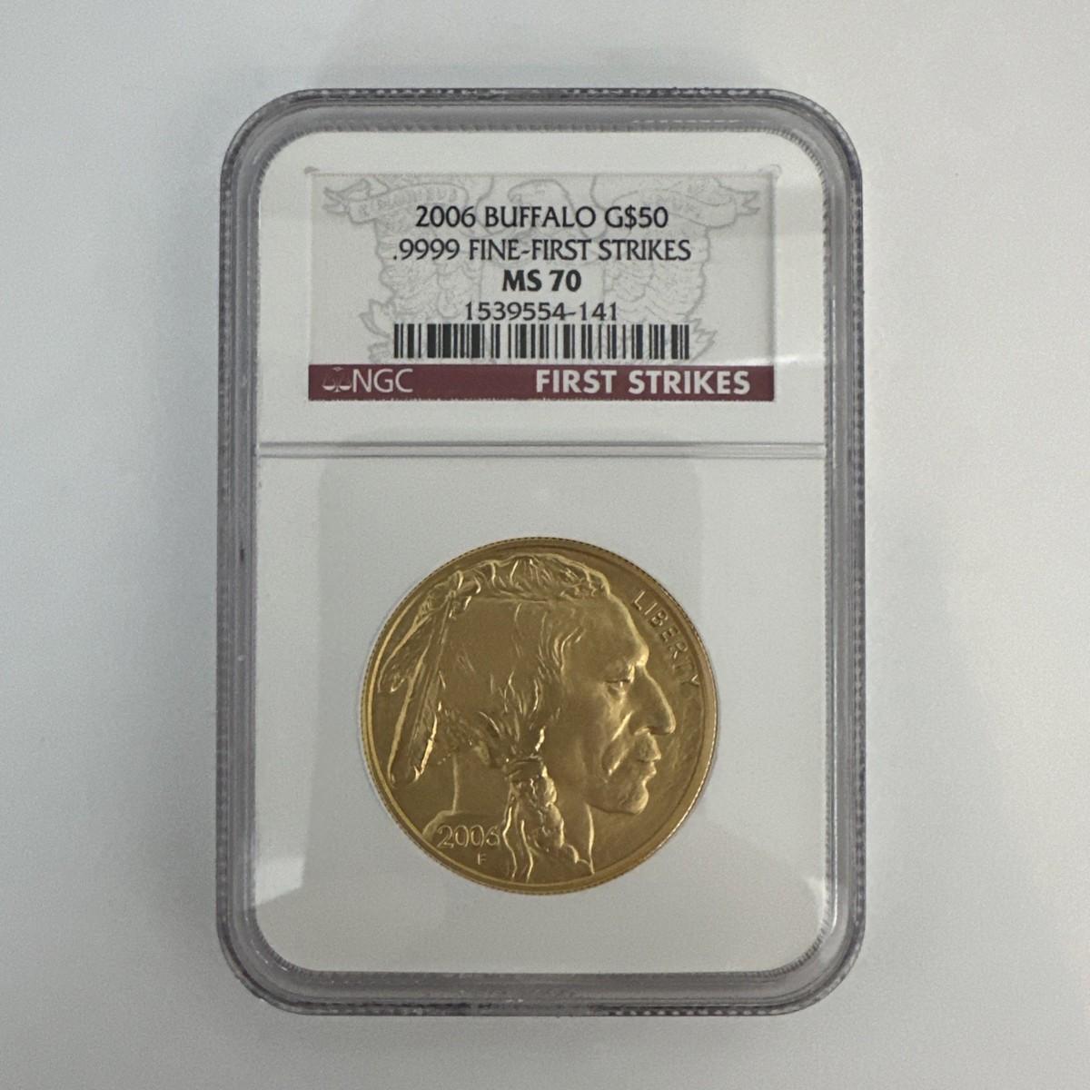 This 2006 1 oz Gold Buffalo Coin is a superb collectible, certified MS-70 by NGC and part of the prestigious First Strike series from the U.S. Mint. Struck in .9999 fine gold with a denomination of $50, this coin exemplifies the iconic American Buffalo design and exceptional craftsmanship. Originating from the United States, it is a premium addition for collectors and investors seeking high-grade, investment-quality American gold coins.