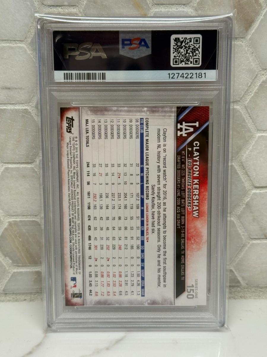 For sale is a 2016 Topps #150 Clayton Kershaw SSP (Short Print) Baseball Card, professionally graded PSA 10 GEM MINT. This highly collectible card features the superstar pitcher of the Los Angeles Dodgers, making it a standout for MLB card collectors, Kershaw fans, and high-grade sports card investors.