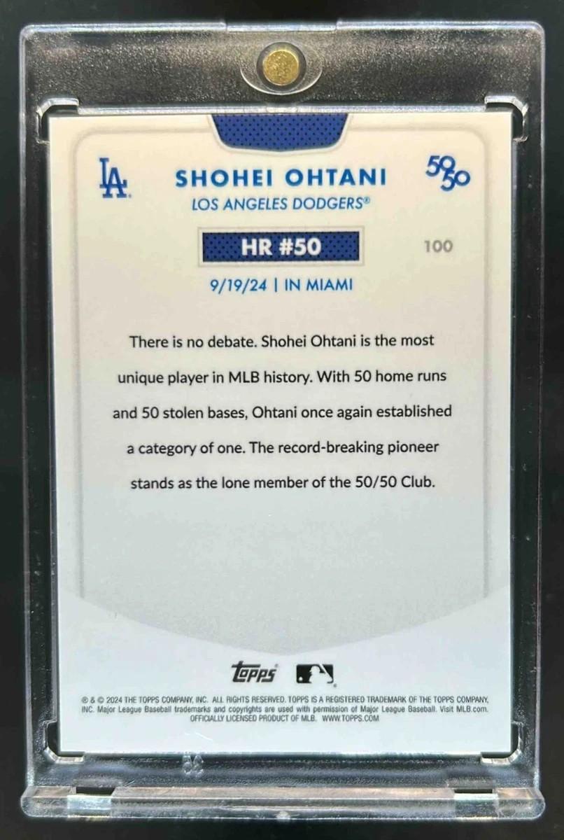 This listing features a Shohei Ohtani trading card from the 2024 Topps 50/50 set, showcasing Ohtani in his Los Angeles Dodgers uniform. This original card, numbered 100, is a Chrome LA Logo Refractor that highlights the player with a vibrant, eye-catching finish.