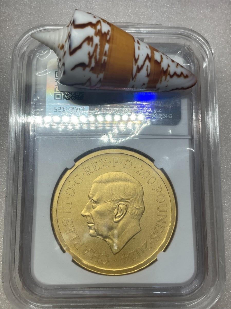 Charles III (2022-), gold matt proof Two Ounces of Two Hundred Pounds, 2024, St. George and the Dragon, struck in 999.9 fine gold, from The Great Engravers Series commemorating the St. George and the Dragon design by Benedetto Pistrucci, portrait head facing left, MJ initials below for designer Martin Jennings, Latin legend and border surrounding, CHARLES III. D. G. REX. F. D. 200 POUNDS. 2024, rev. St George and Dragon right, within garter inscribed with motto HONI SOIT QUI MAL Y PENSE, PISTRUCCI on ground line below horse for designer. DECUS ET TUTAMEN * ANNO REGNI II * in raised edge lettering, 62.42g of 999.9 fine gold. Immaculate Matt proof finish, slabbed and graded by NGC as PF70 Matte, First Day Of Issue