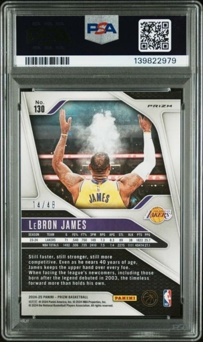 LeBron James is shown in his Los Angeles Lakers uniform, and this card is part of the Base Set with parallel/variety features, combining scarcity and stunning Prizm visuals. Encapsulated and graded by PSA, this card is ready for collectors seeking one of the most valuable limited-run cards of the Panini Prizm 2024-25 series.