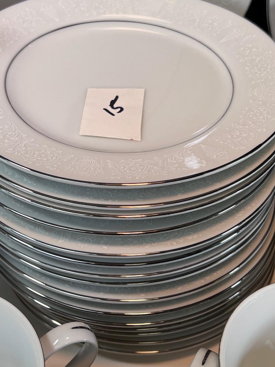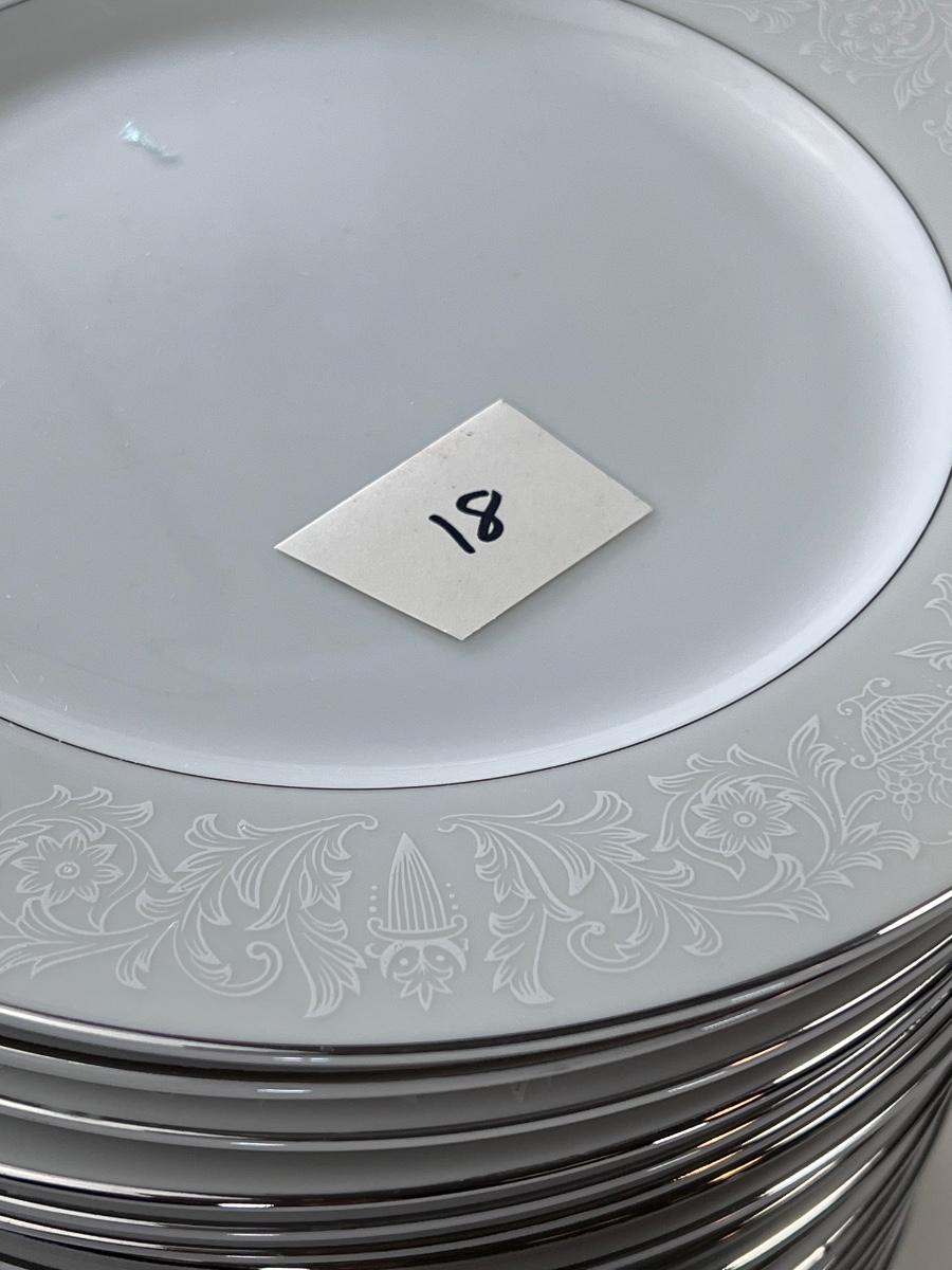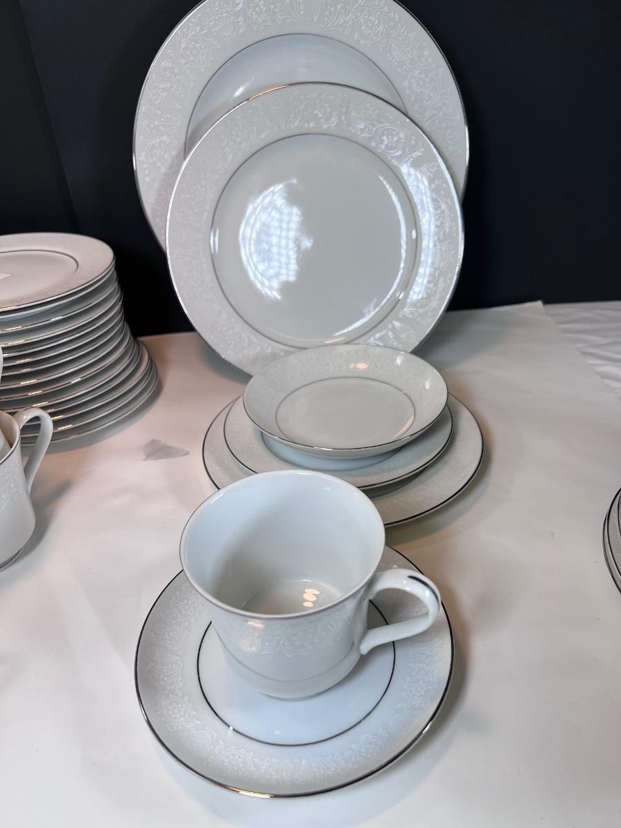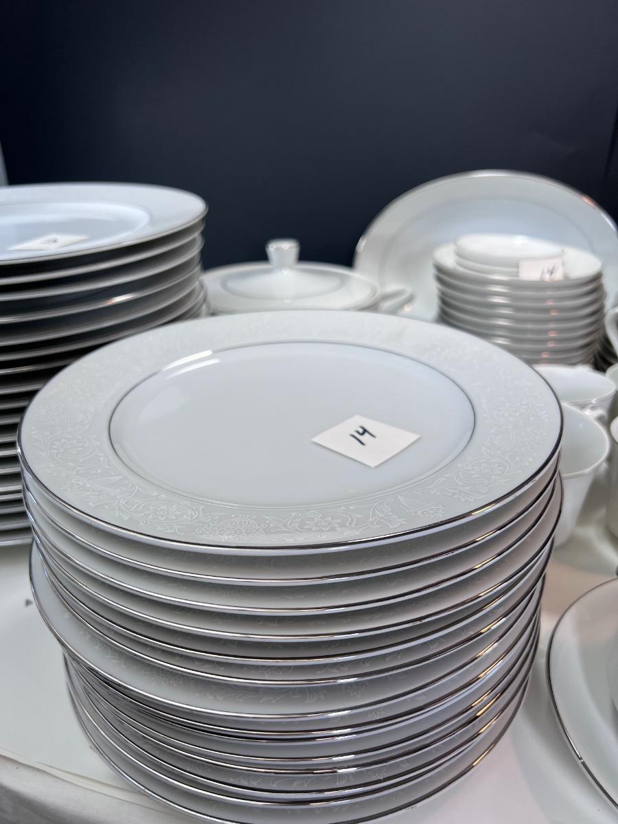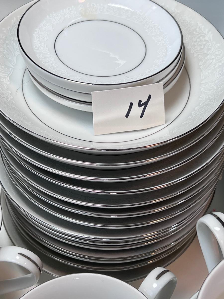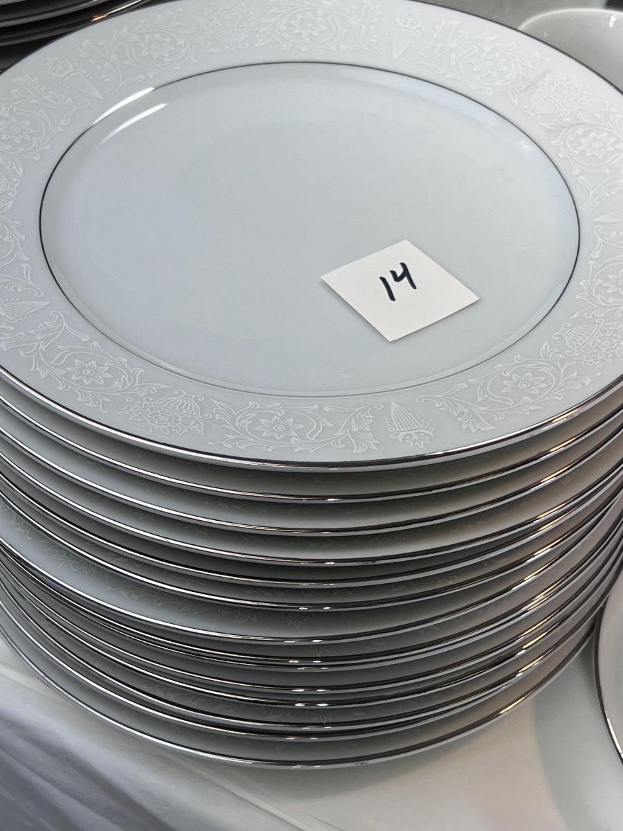 Service for 14-18 Lovelace is a beautiful pattern with a light floral overlay. All pieces have a silver rim which make them not dishwasher safe.