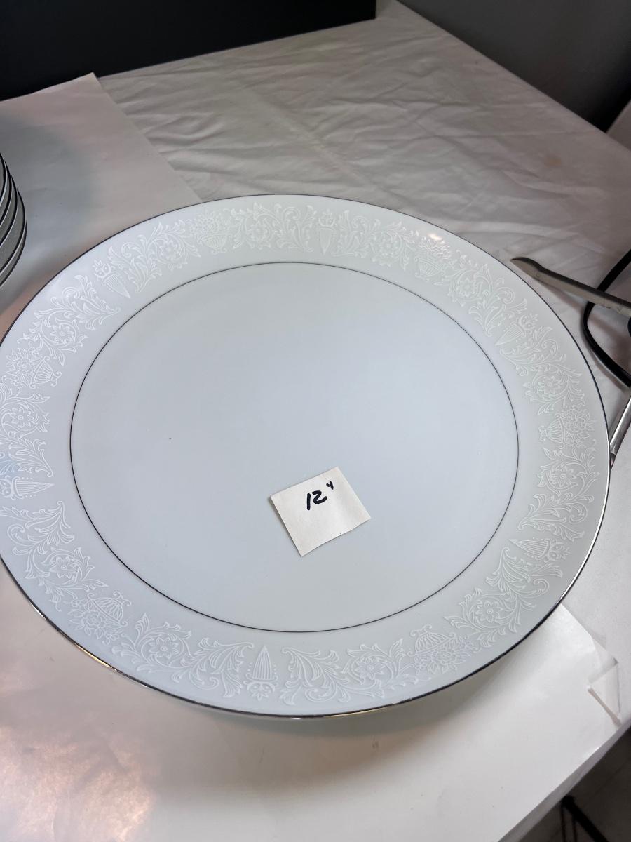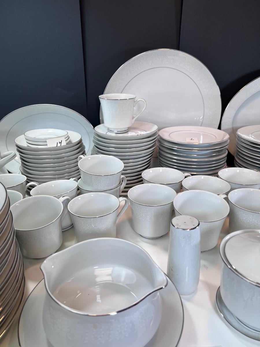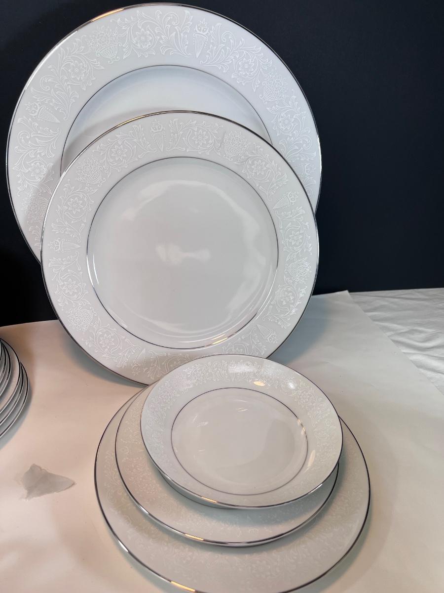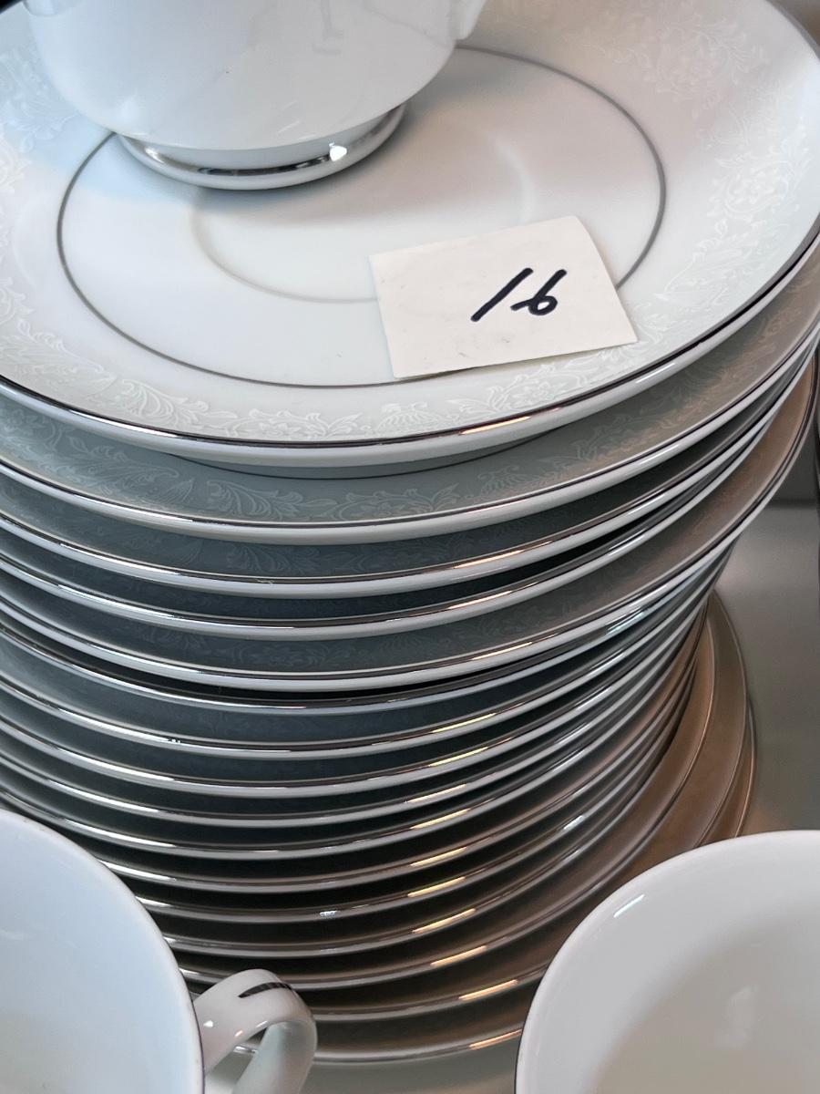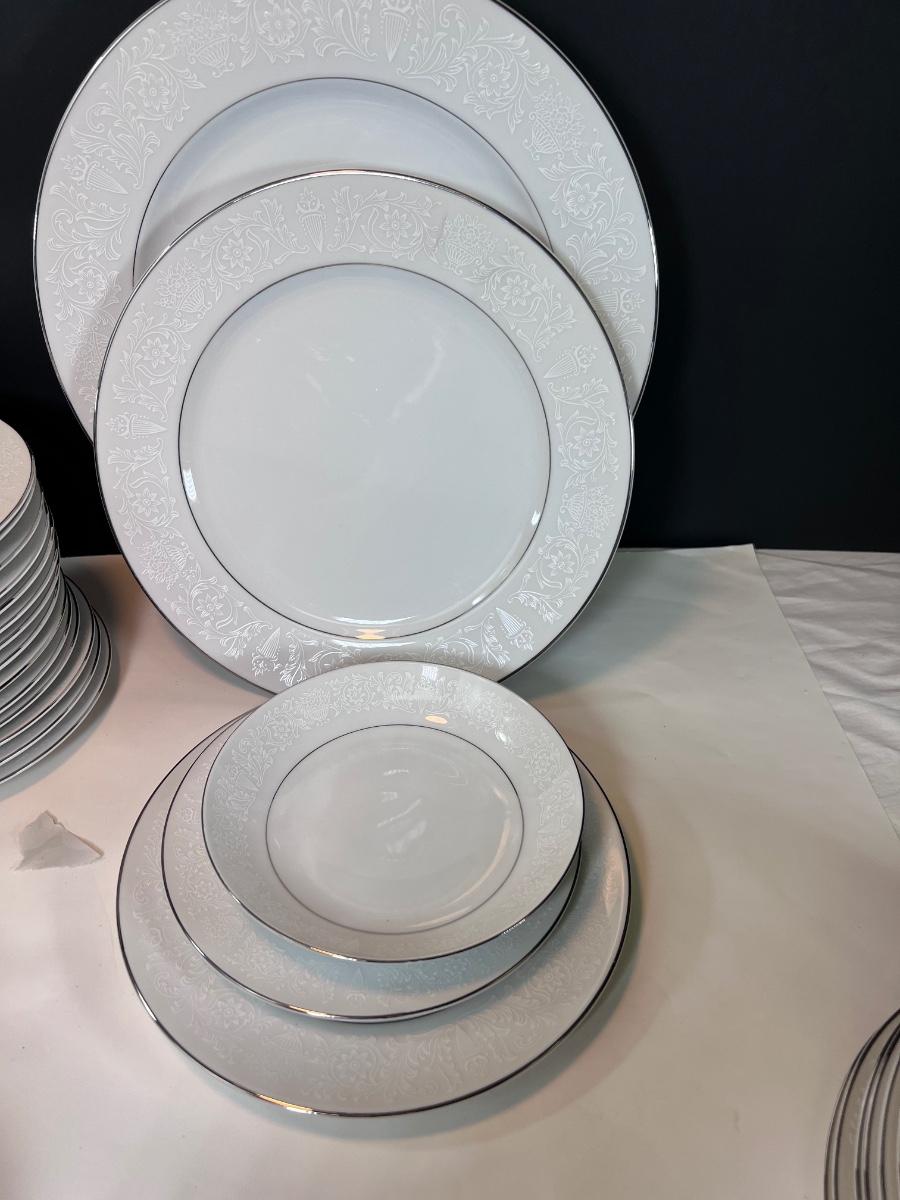 Service for 14-18 Lovelace is a beautiful pattern with a light floral overlay. All pieces have a silver rim which make them not dishwasher safe.