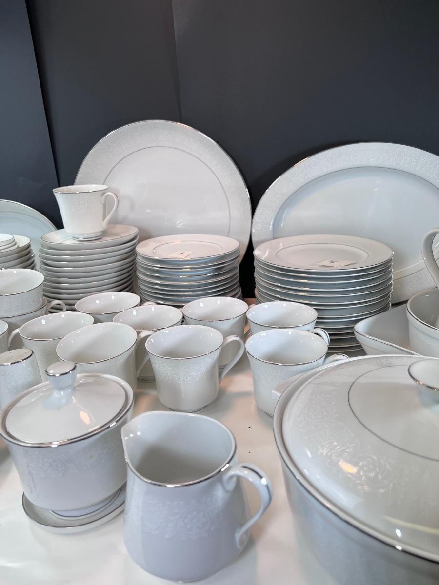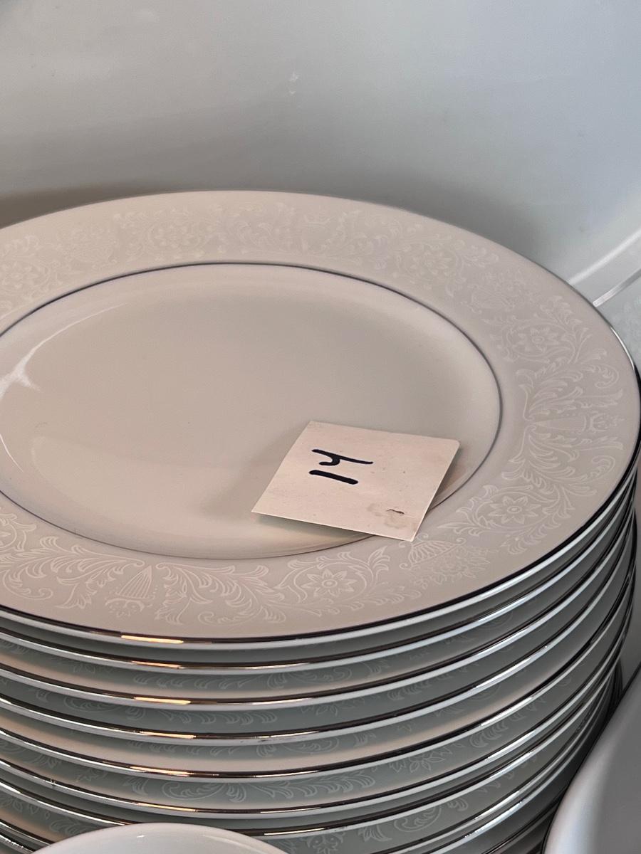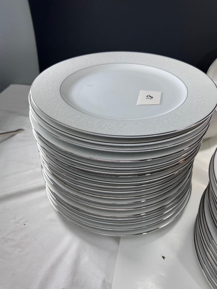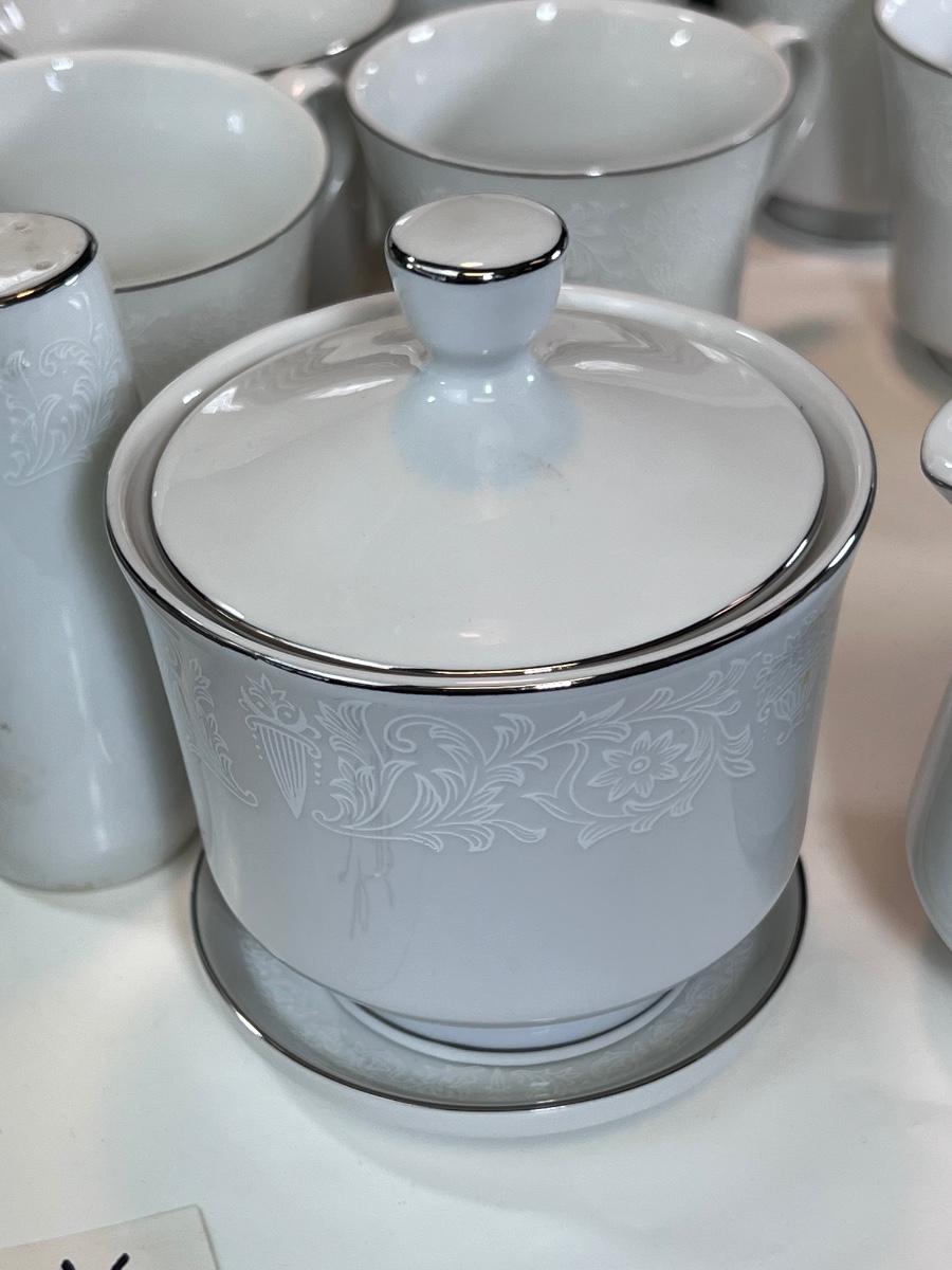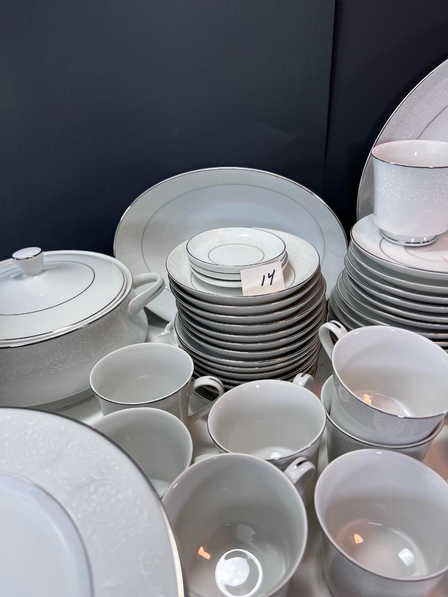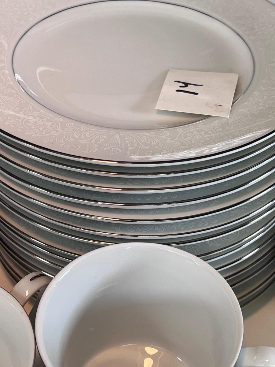 Service for 14-18 Lovelace is a beautiful pattern with a light floral overlay. All pieces have a silver rim which make them not dishwasher safe.