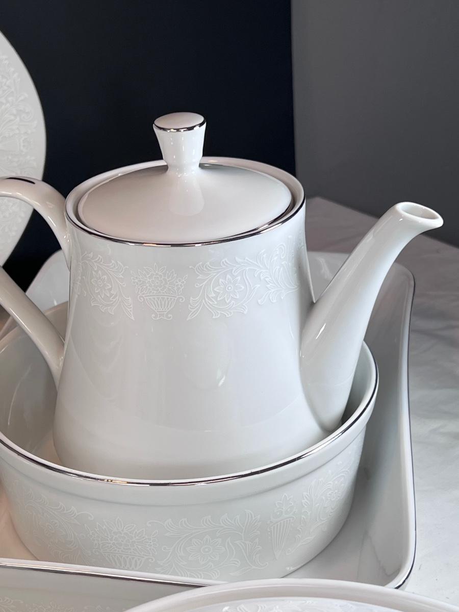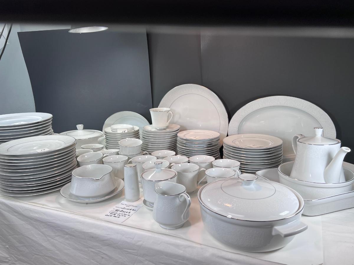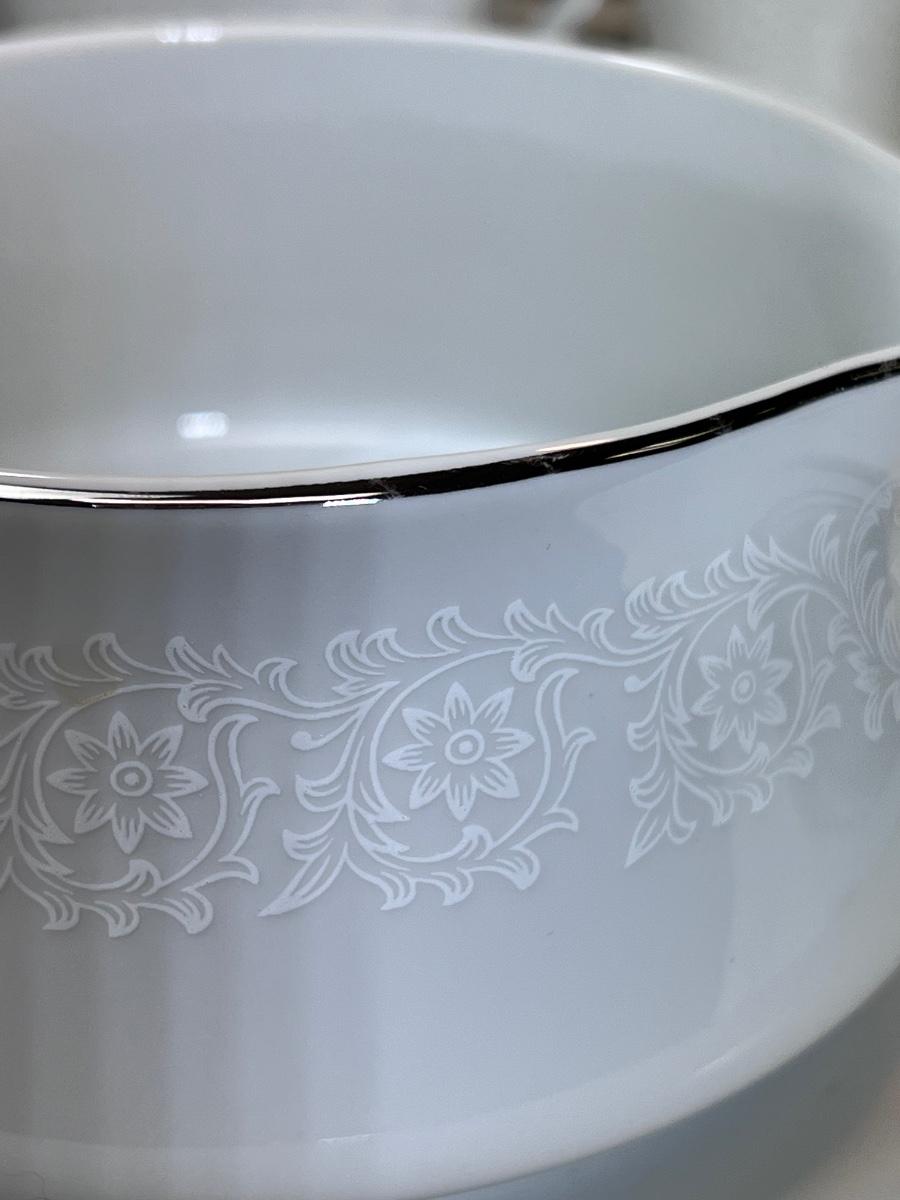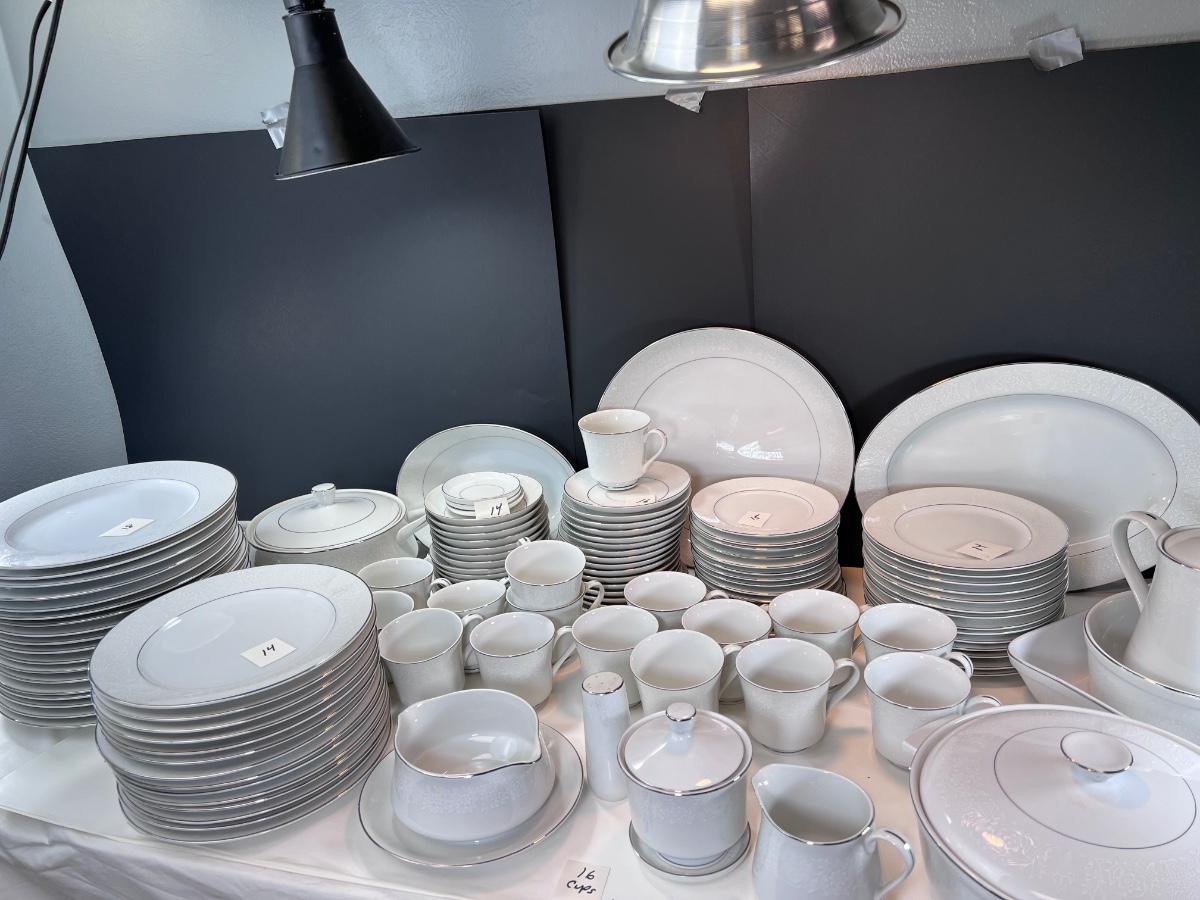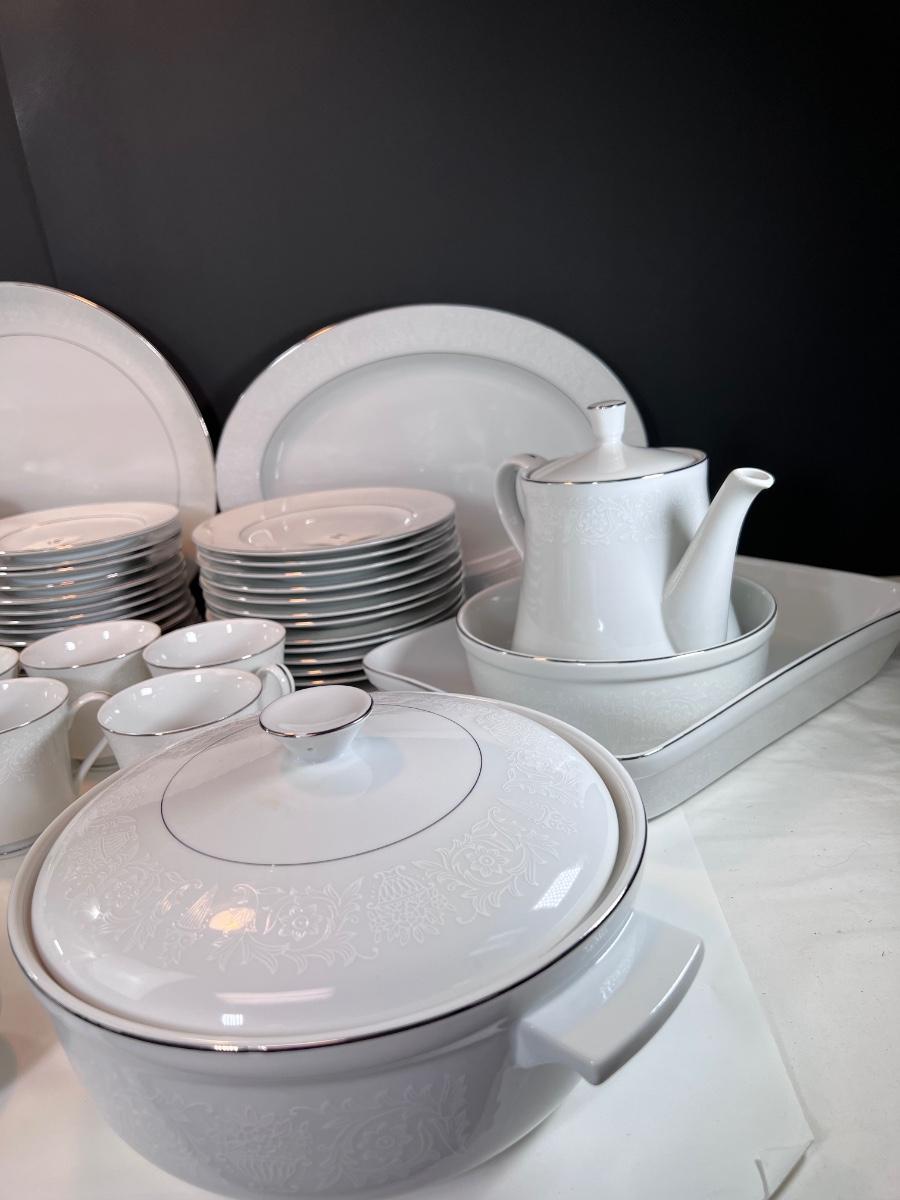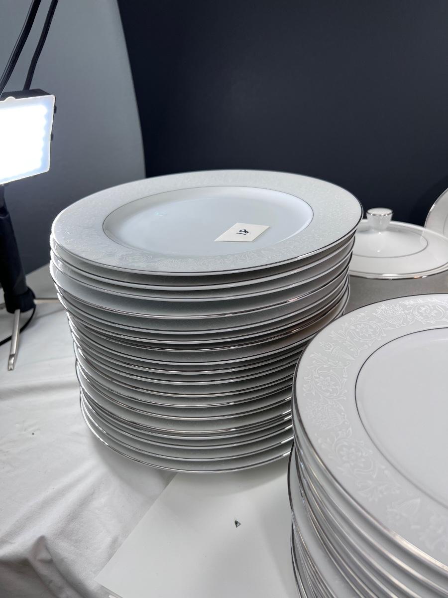 Service for 14-18 Lovelace is a beautiful pattern with a light floral overlay. All pieces have a silver rim which make them not dishwasher safe.