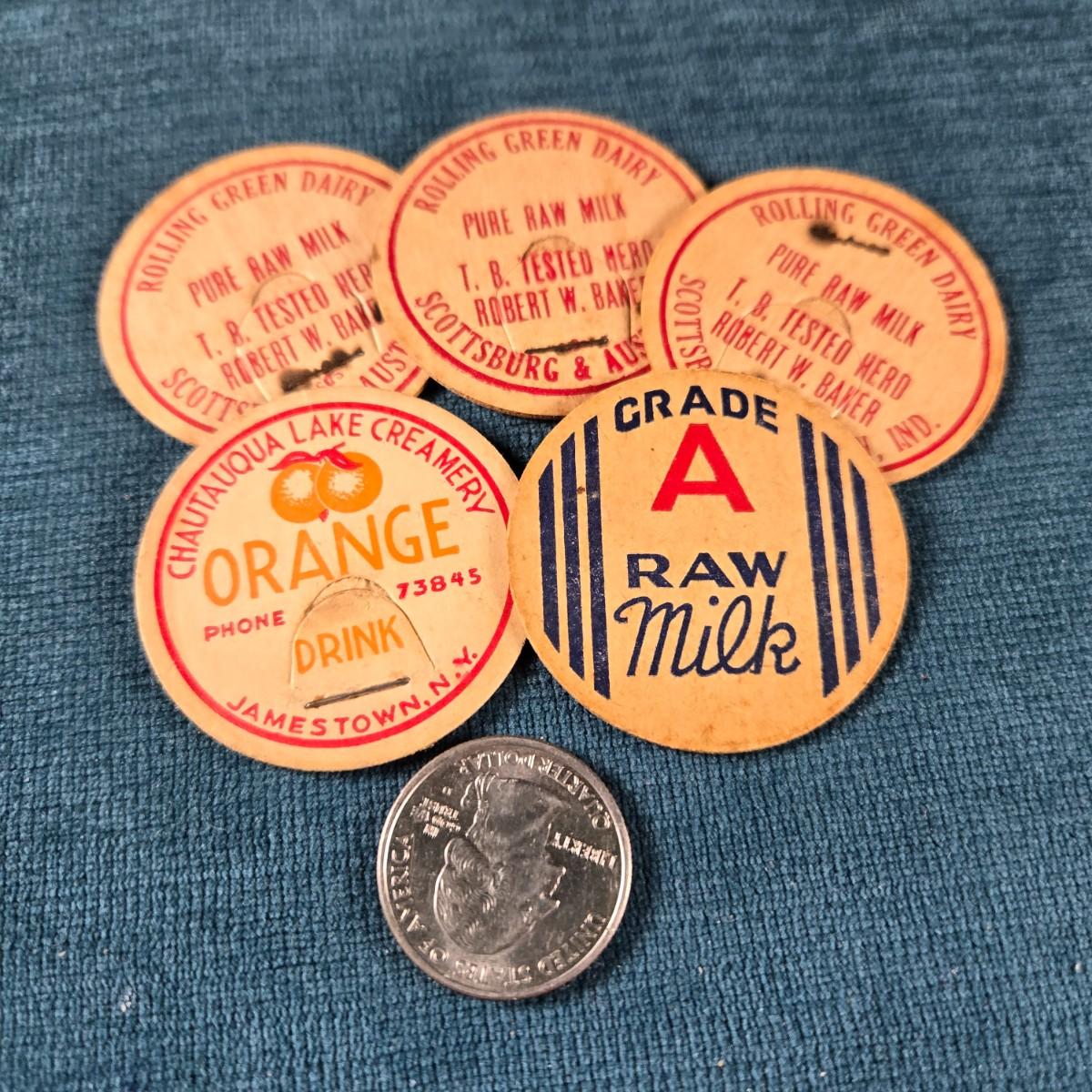 This auction lot is for a grouping of Antique Dairy Milk Bottle Caps. In thiw offer there are 5 Antique Dairy Milk Bottle Caps in very good condition There are 3 Bowling Green Dairy caps, 1 Chautauqua Lake Creamery cap and a Grade A Raw Milk Cap. If you collect old milk bottles or dairy items, this is a must for you.
