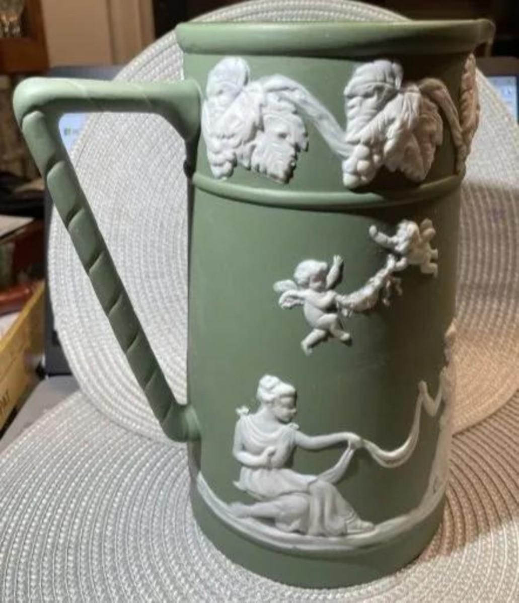 Antique Sage Green Unmarked Base Jasperware Large Pitcher 9" Tall in VG Preowned Condition.