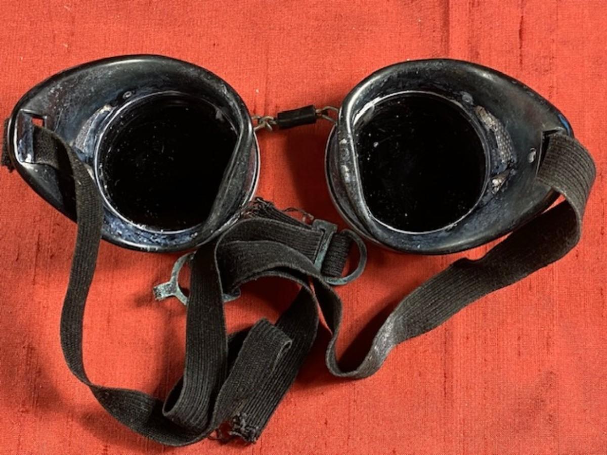 A pair of Antique Welding Goggles - Steam Punk Look. This is a pair of very old welders' glasses. the dark olive lenses are marked " WWSH or HSMM". The rubber has areas of white debris and the elastic traps have lost some spring but seem complete. They are in good condition for the age and use. Strong Steam Punk Vibe.