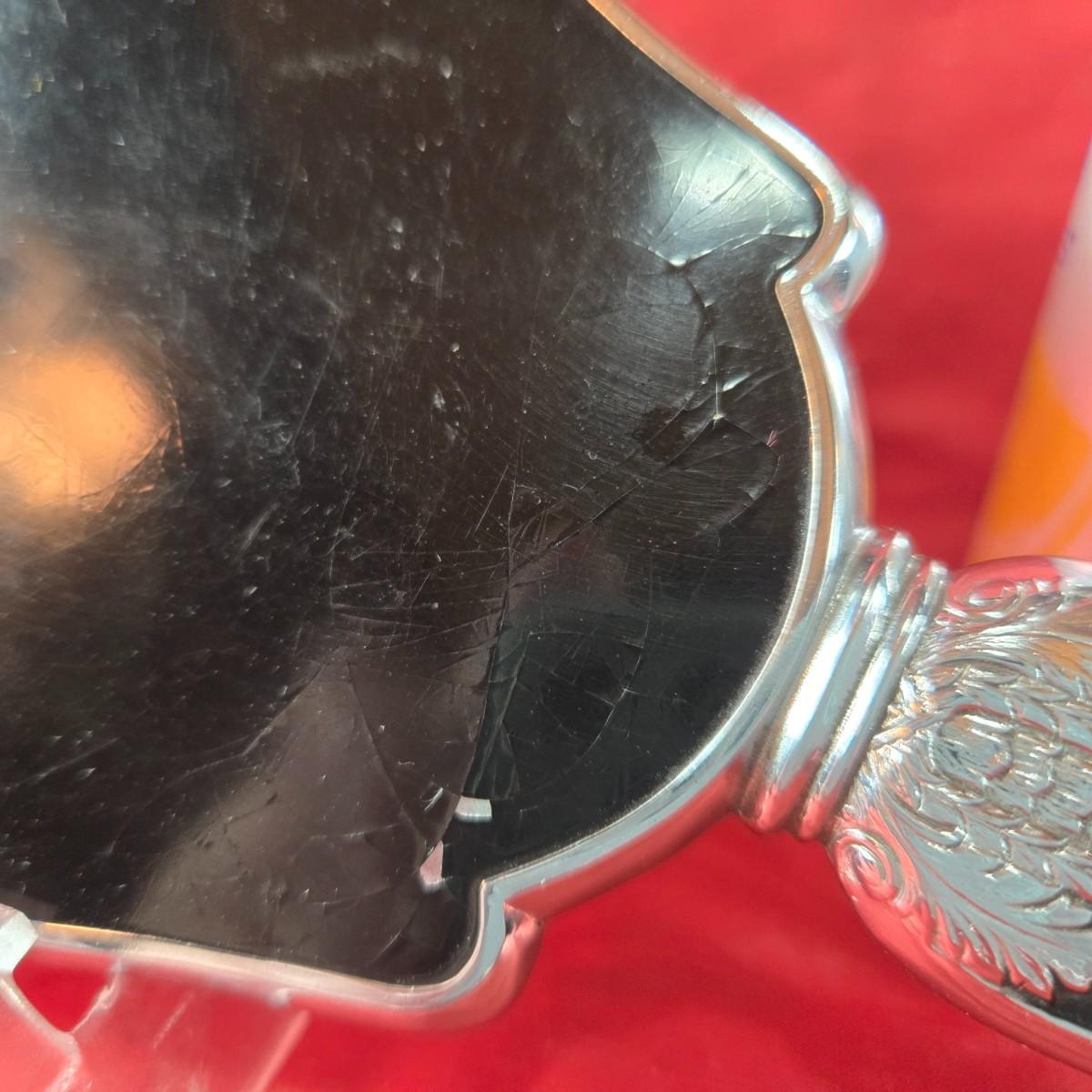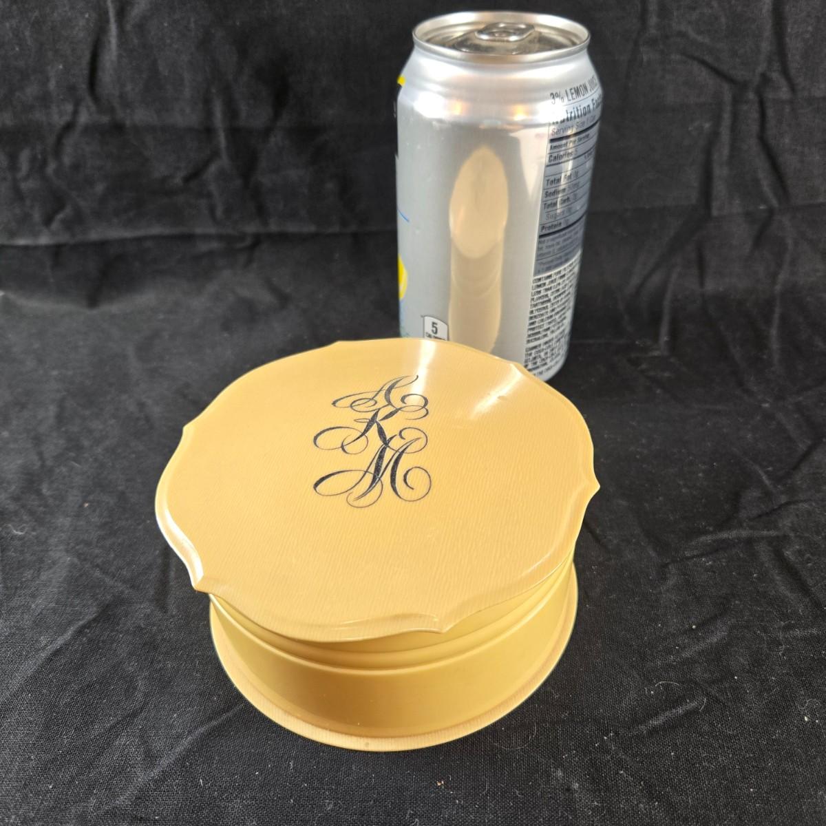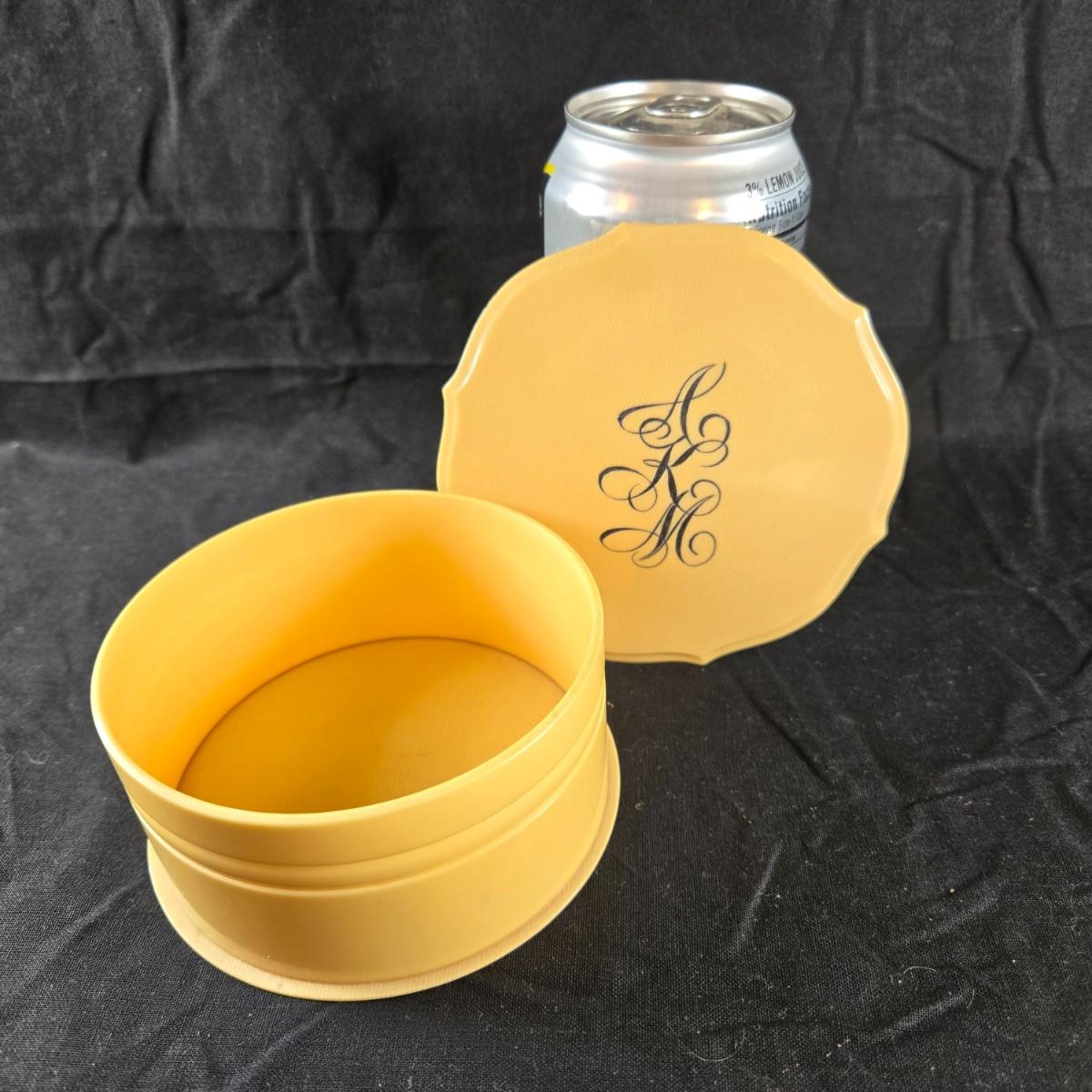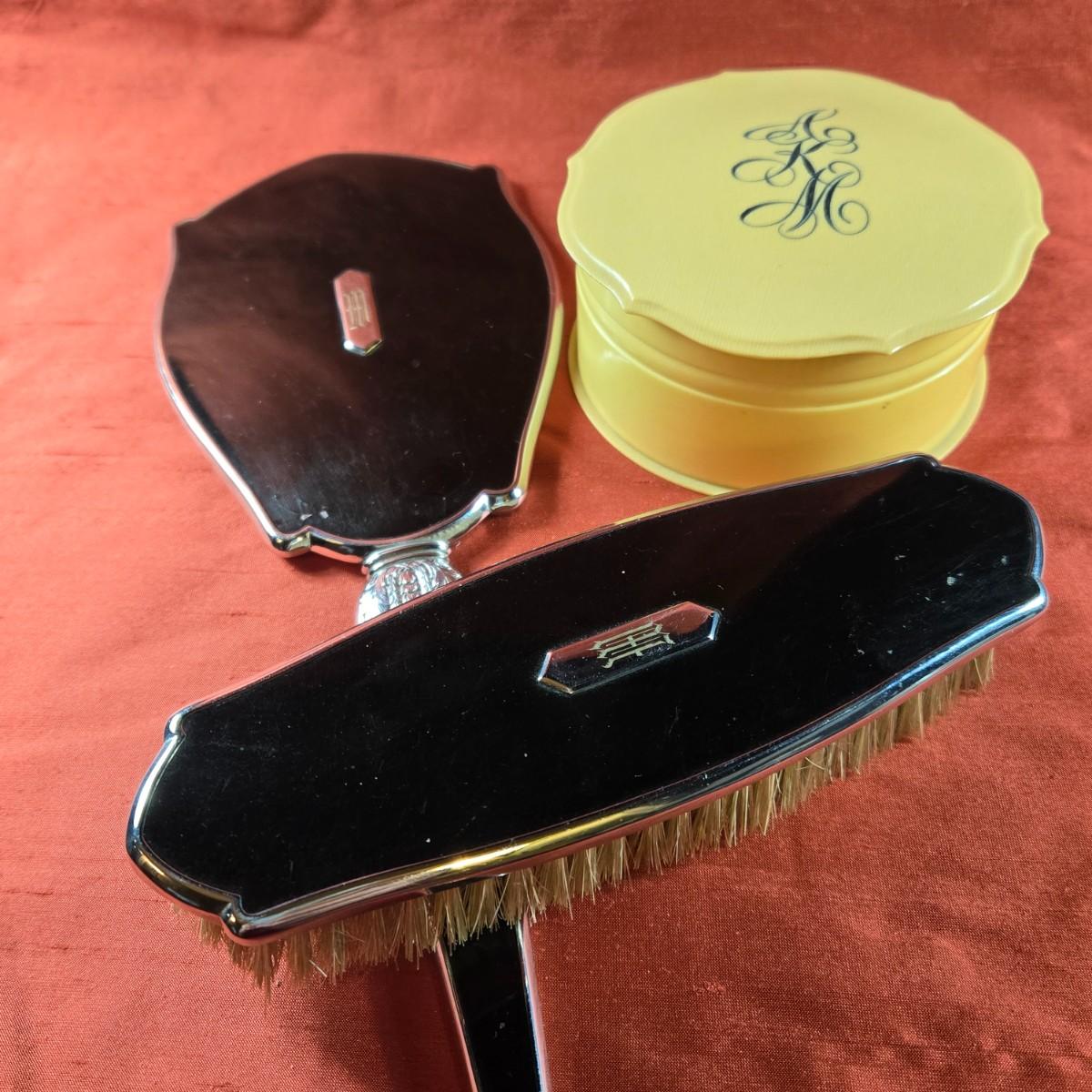This auction lot is for a Art Deco Hand Mirror and Brush Set and a Vintage Powder Box. This item is a black and silver hand mirror and clothes brush set. It is monogramed with the letter "M". There is some age crazing and a paint chip on the mirror back (see picture). The mirror shows slight age fogging. Mirror is about 13-inches long, the brush is about 7-inches long. Both items are good for their age. This also include a vintage powder box. This is a vintage item - it is monogramed with the initials AKM. We think the powder box is celluloid?. It is in very nice condition for its age. The box measures about 4.5-inches diameter X 2-inches tall.