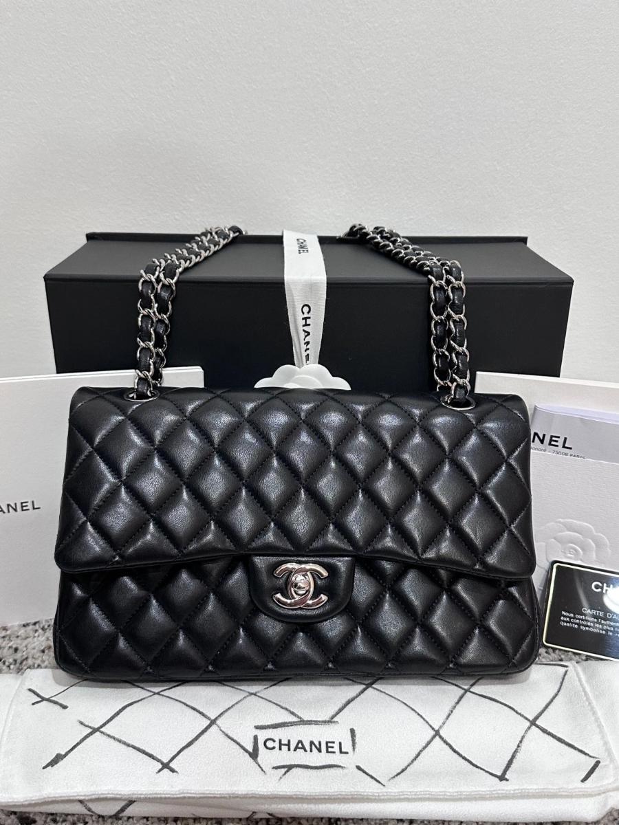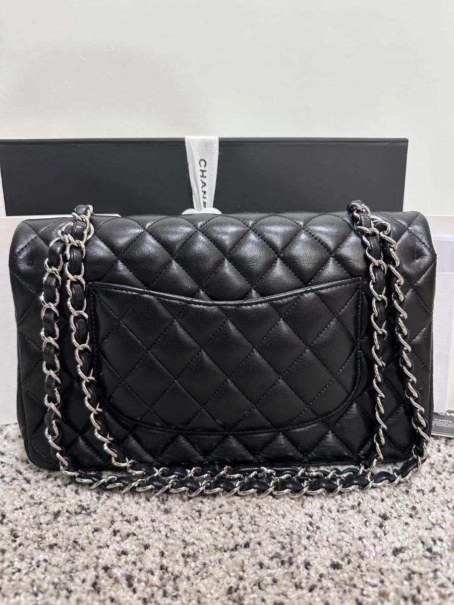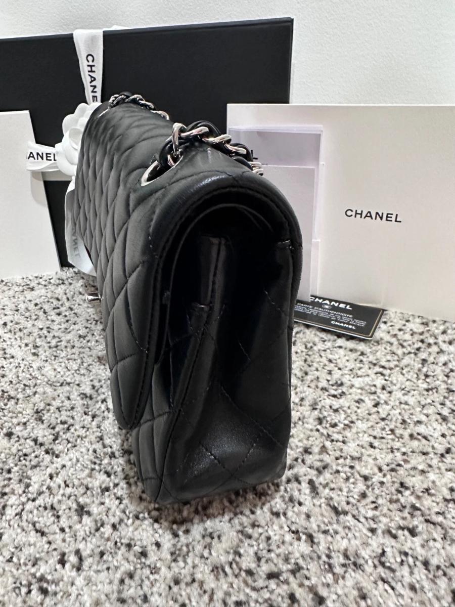 Authentic Chanel Classic Medium Double Flap – Black Lambskin – Silver Hardware – 2019 Full Set with Receipt