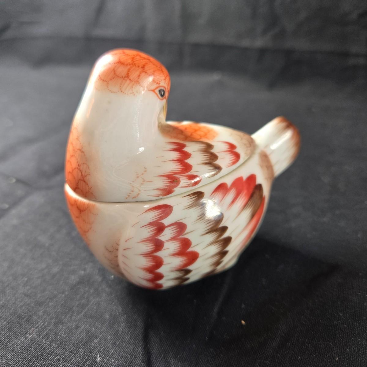 Bird Trinket Box by Herend Porcelains of Hungary. This sweet little bird trinket box is a great example of Herend work.. It has a pressed number of 6075 on the bottom. Condition is very good - no chips or cracks. The bird measures about 3-inches long x 2.75- inches tall. Since Herend was founded in 1826, famous customers bought it’s porcelain. In the 19th Century Queen Victoria was one of the first Herend porcelain customers. These days Herend figurines are still beloved. Lady Diana was a collector of Herend, but also Arnold Schwarzenegger has a large collection of Herend Animal Figurines.