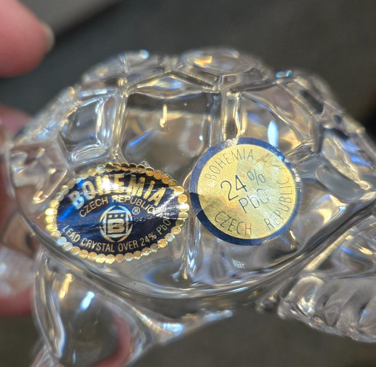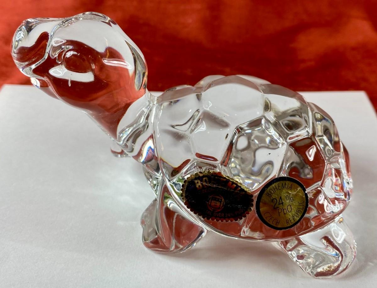 Bohemian Crystal Turtle. He is heavy - enough for a paper weight, but is also great as just an added object for a glass collection. He is about 4-inches long x 2.25 inches tall. Appears new with original stickers stating Bohemia Czech Republic and 24% Lead Crystal.