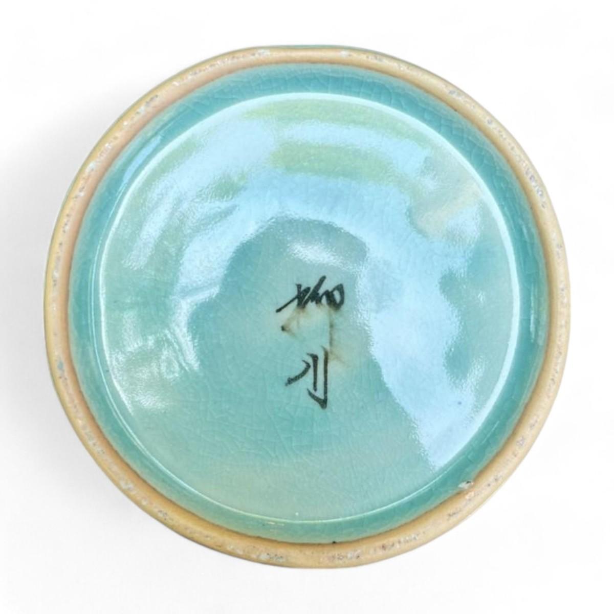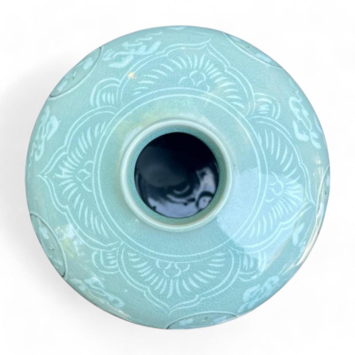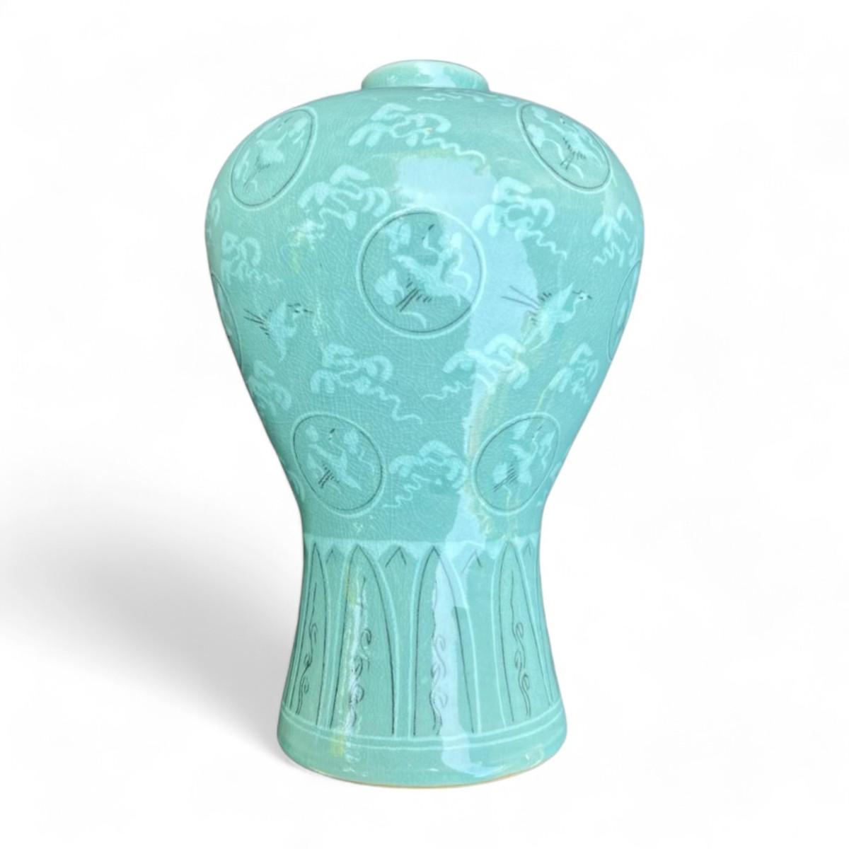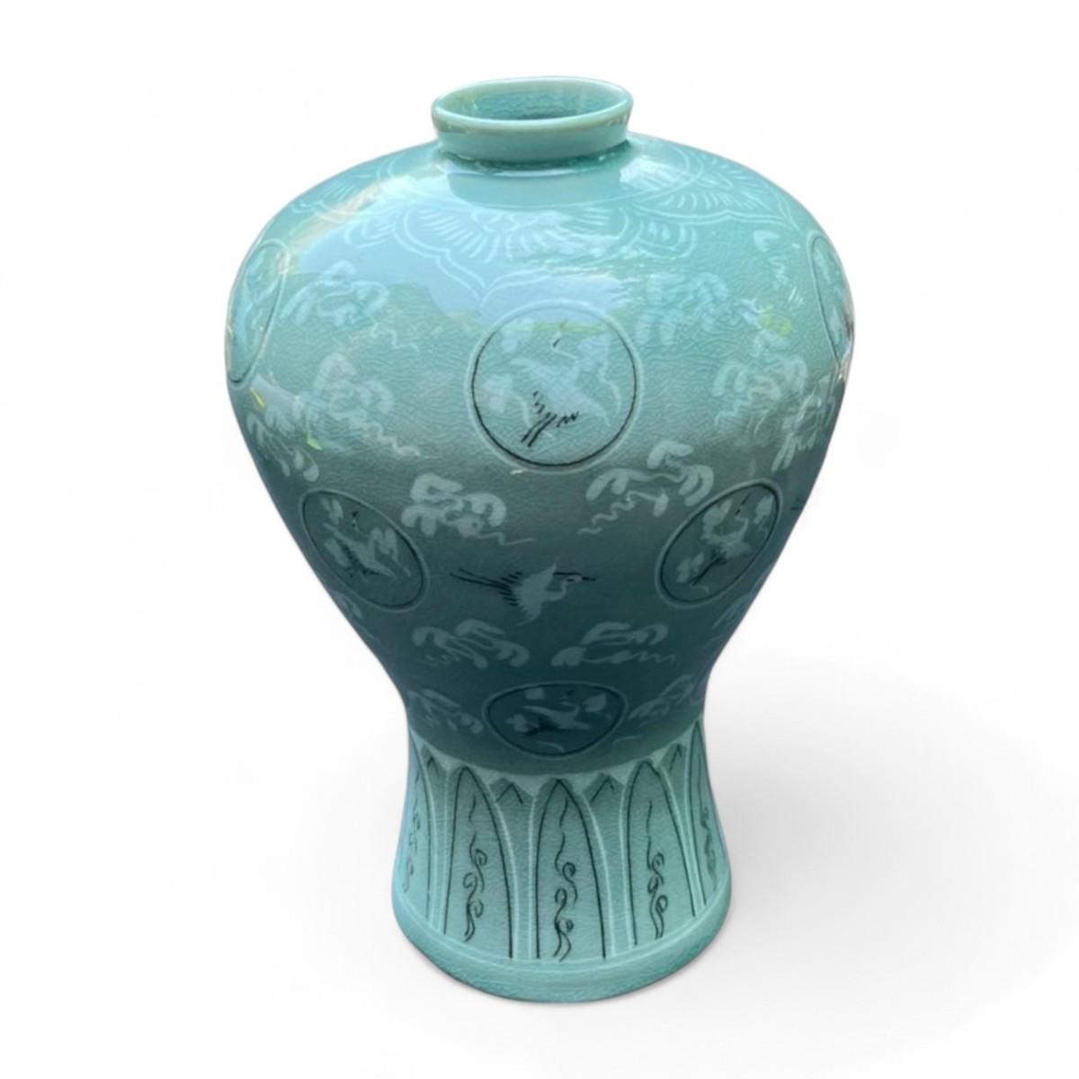Design Features: This exquisite celadon vessel features detailed stork and cloud designs beautifully crafted to enhance its serene and elegant appearance. The light green glaze typical of celadon ceramics provides a soft calming effect while the intricate designs add a layer of sophistication. The vessel's smooth glossy finish highlights its high-quality craftsmanship.