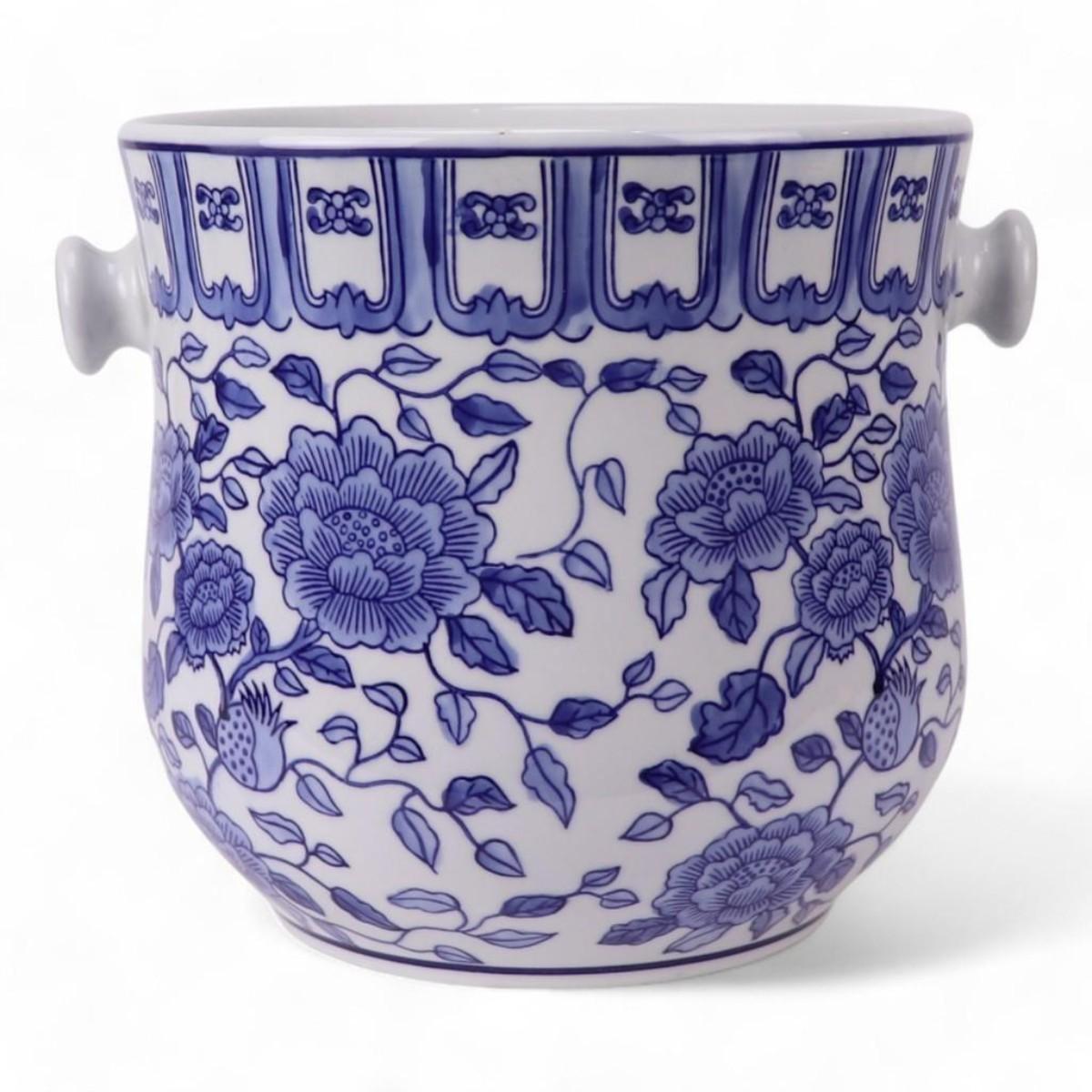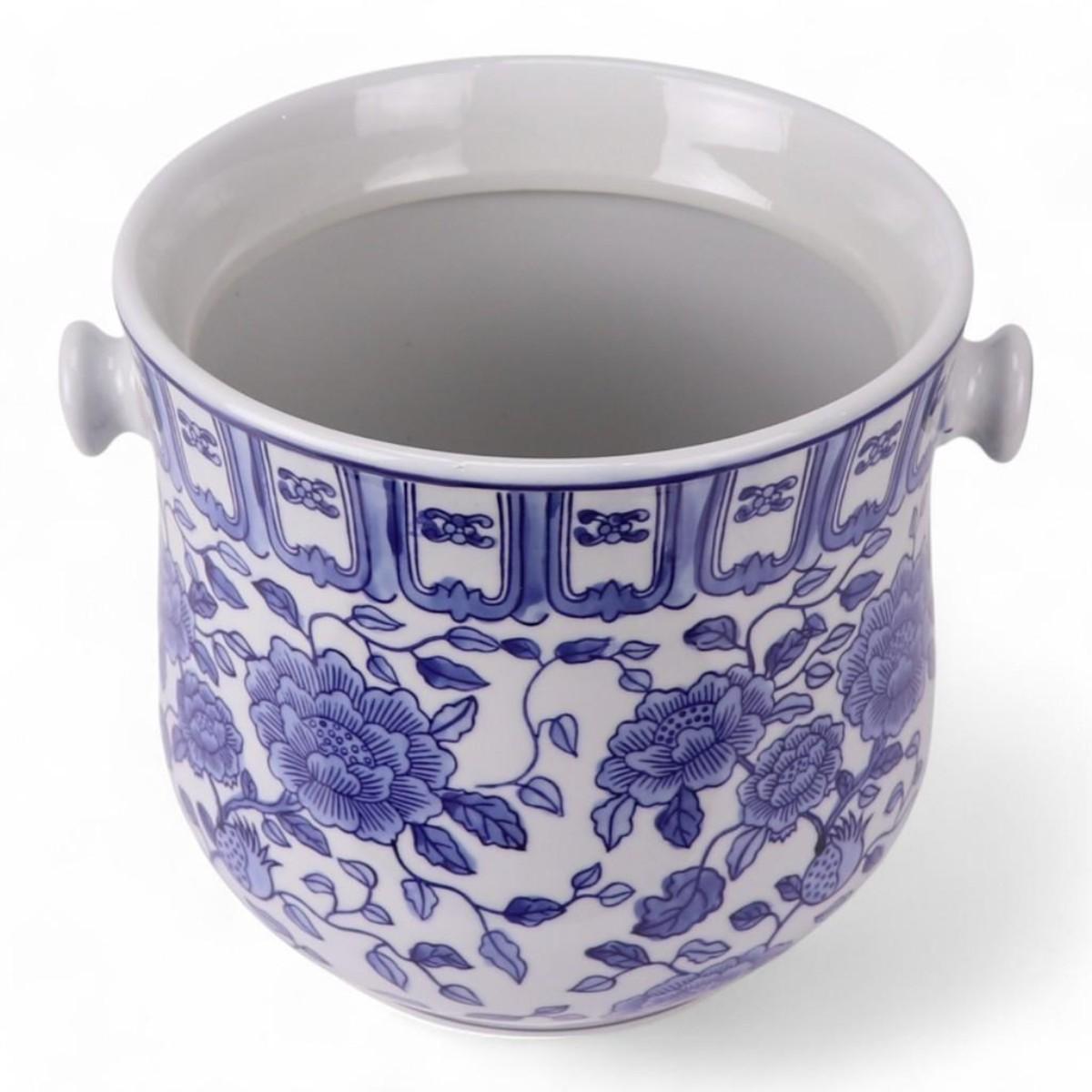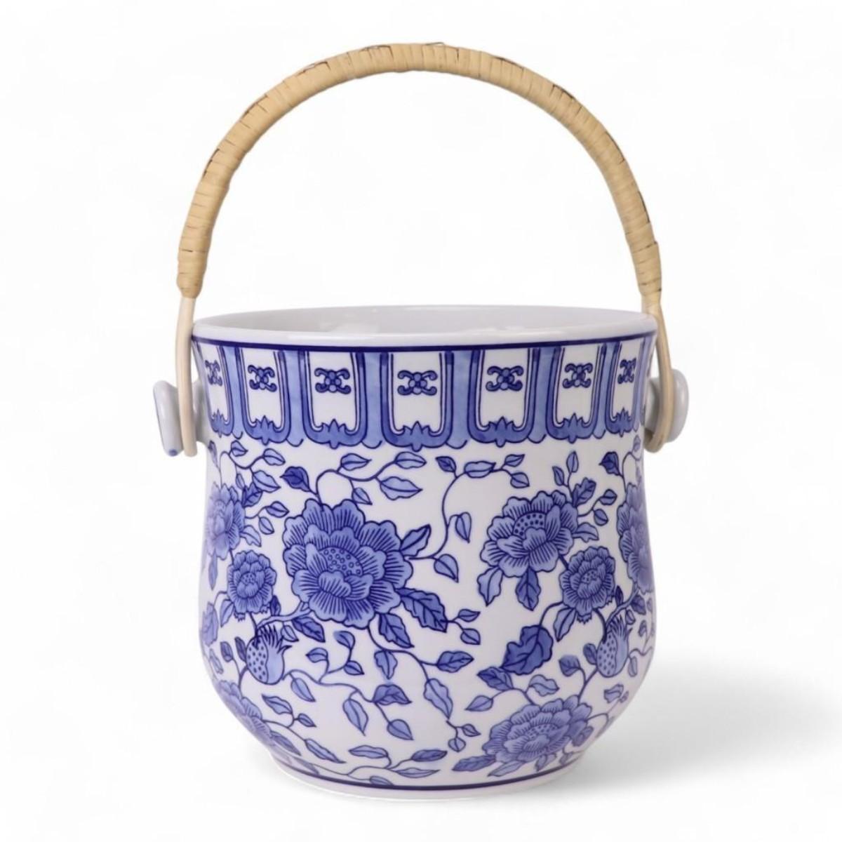Blue and white chinoiserie floral motif, hand painted on a white porcelain champagne or ice bucket with rattan handle.    Great for entertaining and gifting!  <br /> <br /> Hand painted and manufactured in the Jingdezhen province of China, often called the &#34;Porcelain Capital of the World&#34; for its important role in the domestic and international ceramic industry. Renowned for its ancient porcelain production that stretches back more than 1,700 years.<br /> <br /> <strong>Dimensions</strong>: 11&#34;D x 11&#34;H<br /> <br /> <strong>Shipping Information<br /> Weight: </strong>9lbs<br /> <strong>Carton Size</strong>: 14&#34;W x 14&#34;L x 14&#34;H<br /> <br />