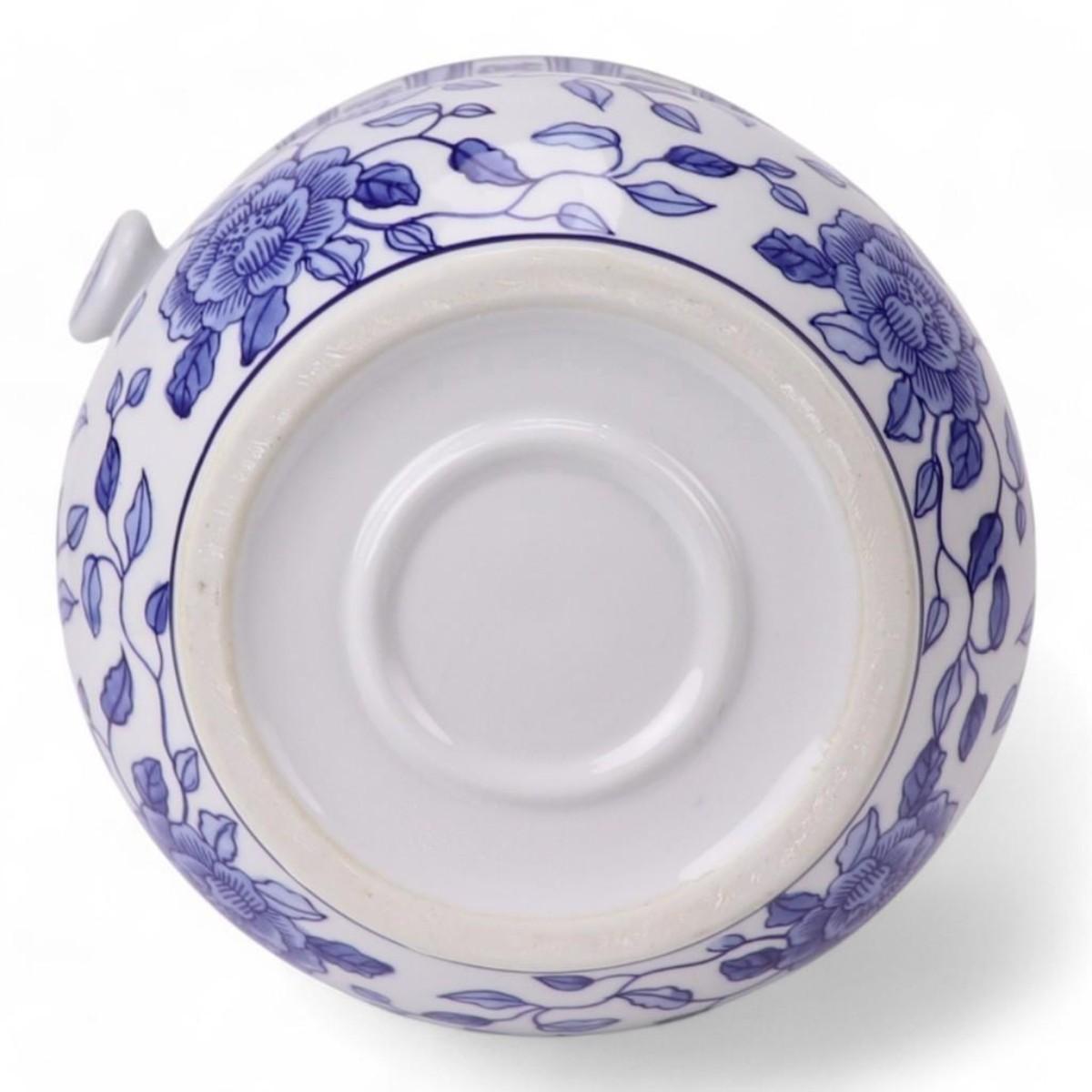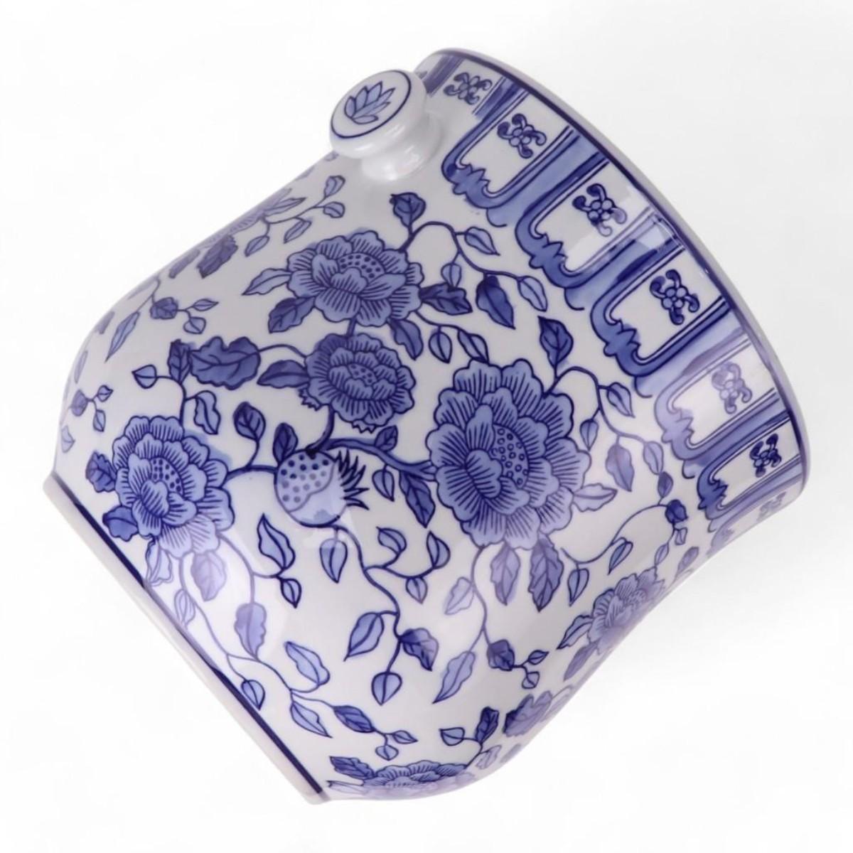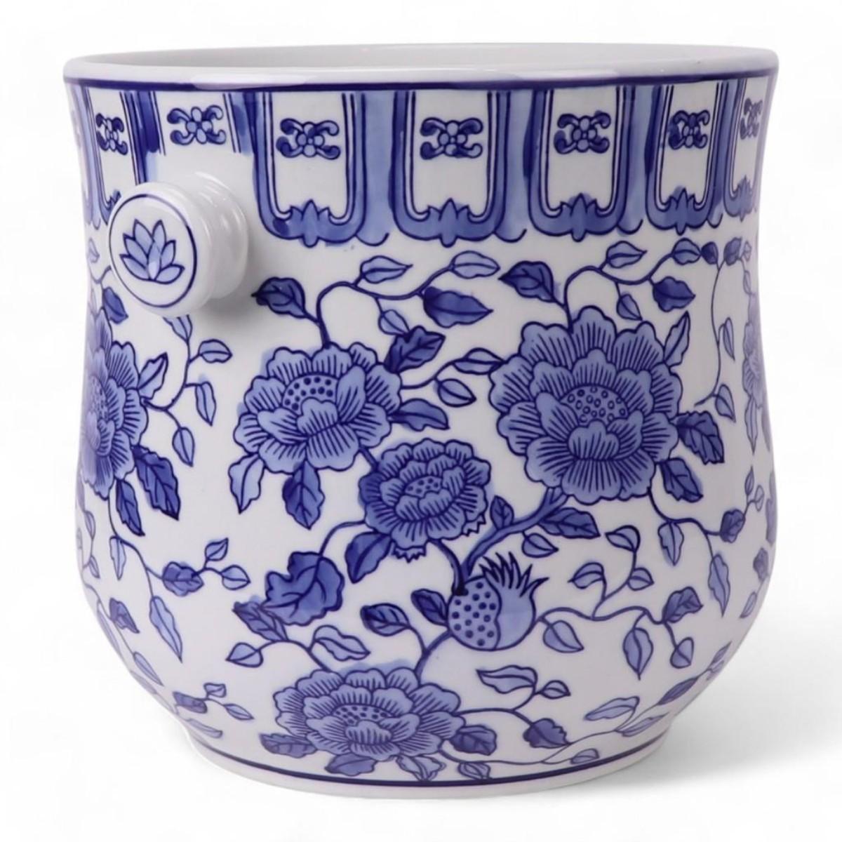 Blue and white chinoiserie floral motif, hand painted on a white porcelain champagne or ice bucket with rattan handle.    Great for entertaining and gifting!  <br /> <br /> Hand painted and manufactured in the Jingdezhen province of China, often called the &#34;Porcelain Capital of the World&#34; for its important role in the domestic and international ceramic industry. Renowned for its ancient porcelain production that stretches back more than 1,700 years.<br /> <br /> <strong>Dimensions</strong>: 11&#34;D x 11&#34;H<br /> <br /> <strong>Shipping Information<br /> Weight: </strong>9lbs<br /> <strong>Carton Size</strong>: 14&#34;W x 14&#34;L x 14&#34;H<br /> <br />