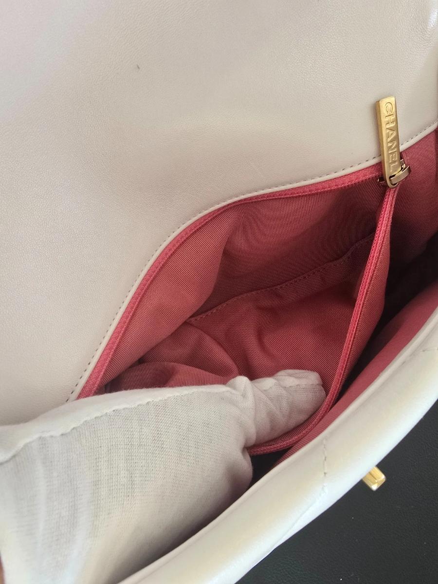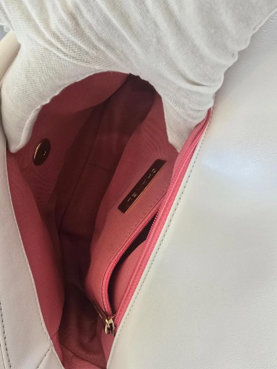 The Ultimate Modern Icon: CHANEL 19 Medium Flap Bag Elevate your collection with this breathtaking Chanel 19 Medium Flap Bag in pristine white. Known as the "modern classic," the Chanel 19 seamlessly blends the heritage of the 2.55 with a bold, contemporary edge. This specific piece is a rare "seasonal gem," featuring a crisp, pure white quilted leather exterior beautifully contrasted by a playful and vibrant pink interior lining.