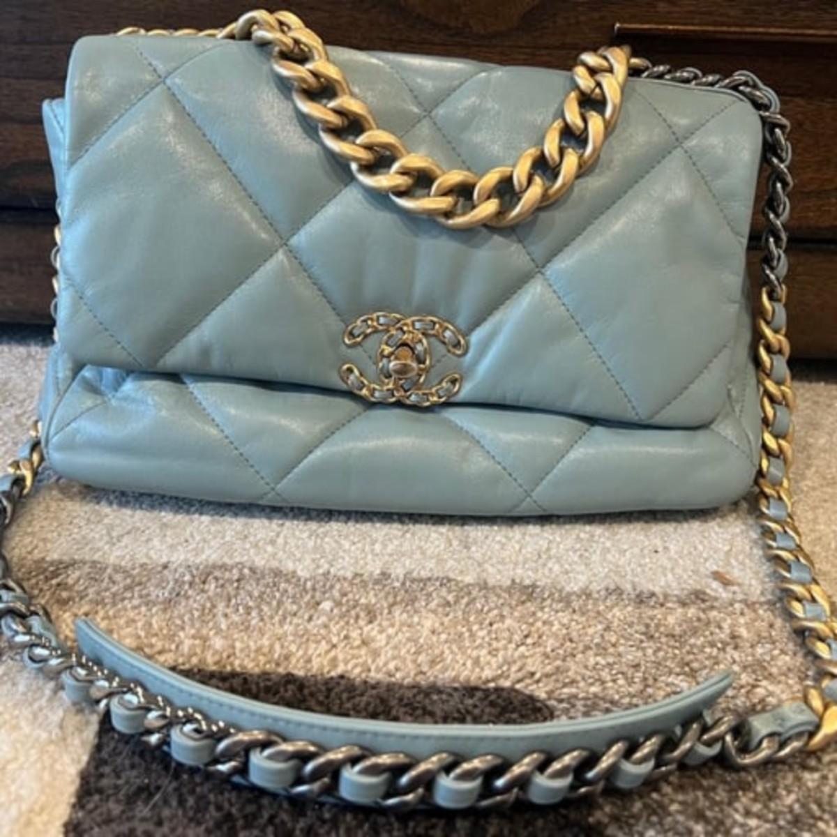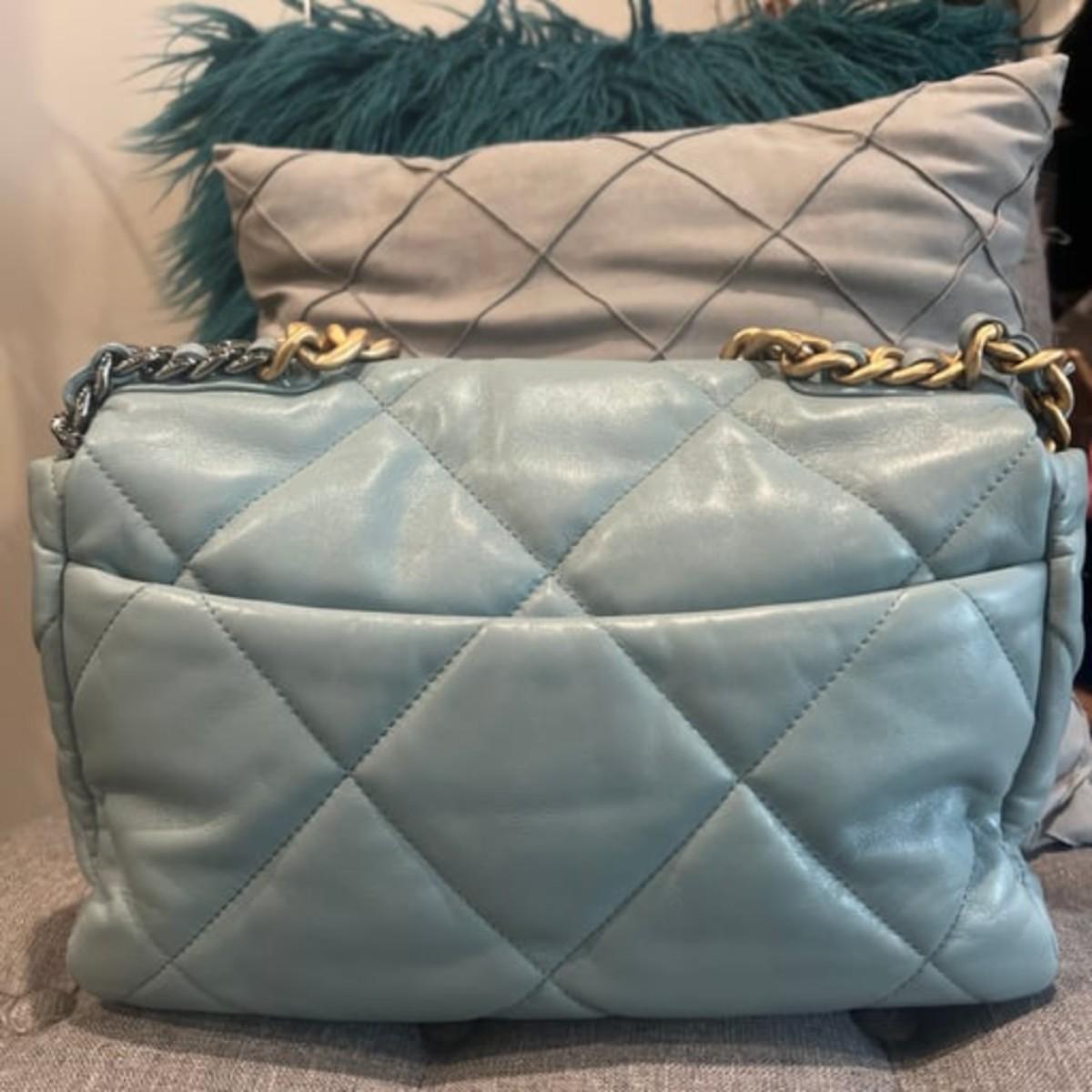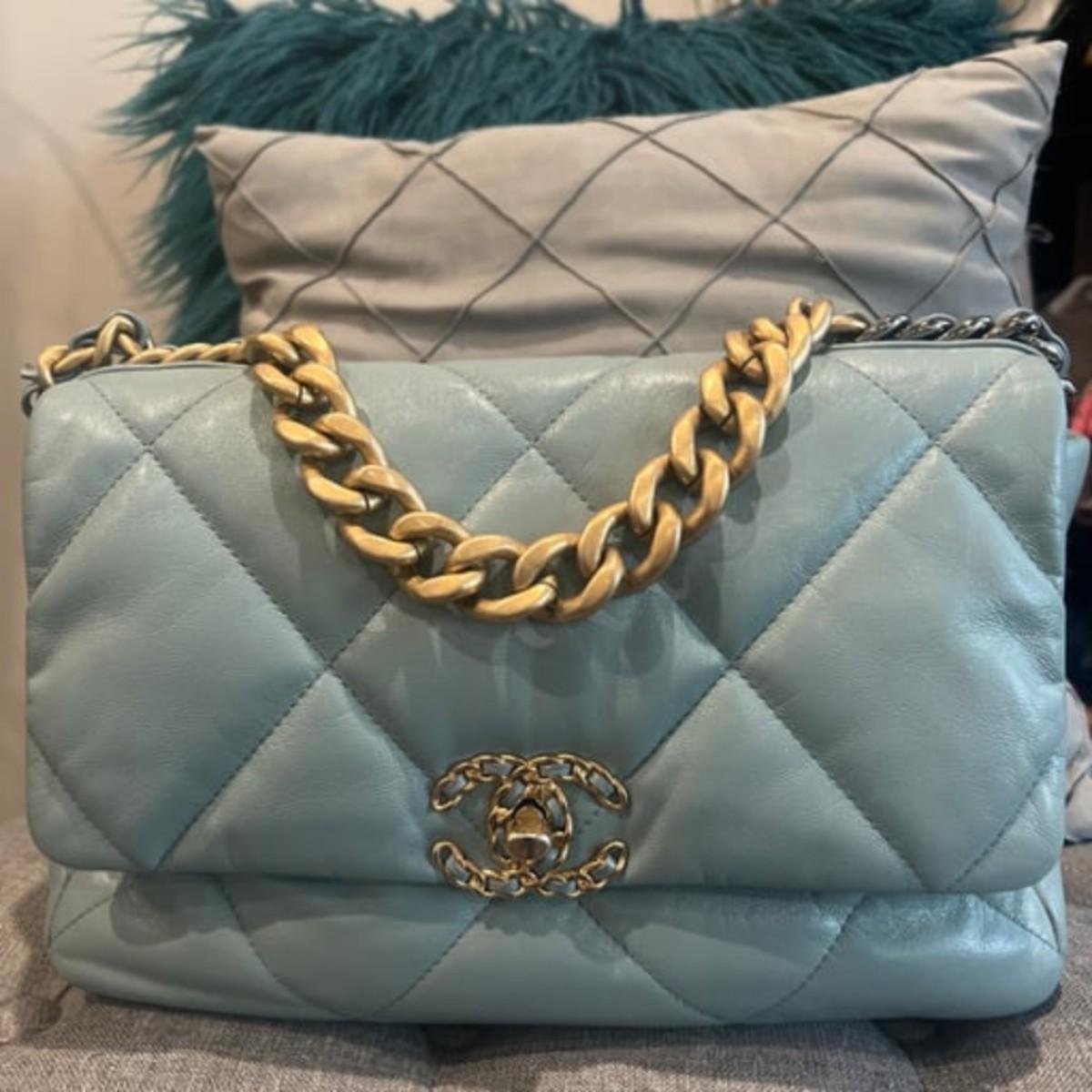 Chanel 19 large quilted goat skin flap bag (in a RARE and BEAUTIFUL blue/grey color!) LIKE-NEW condition with no flaws, smells or stains- I only wore it out 2-3 times! Comes with the FULL SET including original box, Chanel dust bag, tissue paper, ribbon, and original receipt from the Chanel boutique at Newport Beach. Serial #30535025 I’m happy to send additional photos upon request. Price is FIRM.