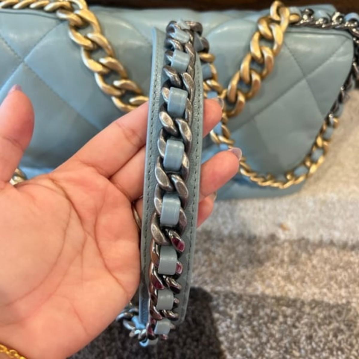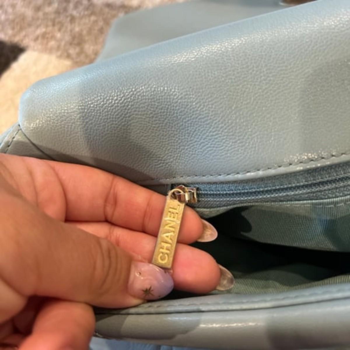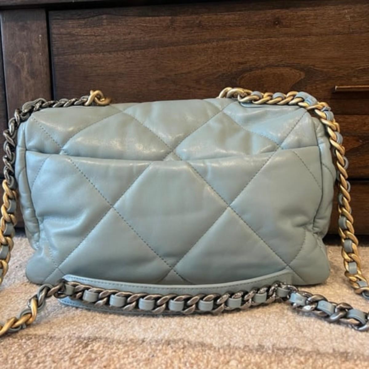Chanel 19 large quilted goat skin flap bag (in a RARE and BEAUTIFUL blue/grey color!) LIKE-NEW condition with no flaws, smells or stains- I only wore it out 2-3 times! Comes with the FULL SET including original box, Chanel dust bag, tissue paper, ribbon, and original receipt from the Chanel boutique at Newport Beach. Serial #30535025 I’m happy to send additional photos upon request. Price is FIRM.