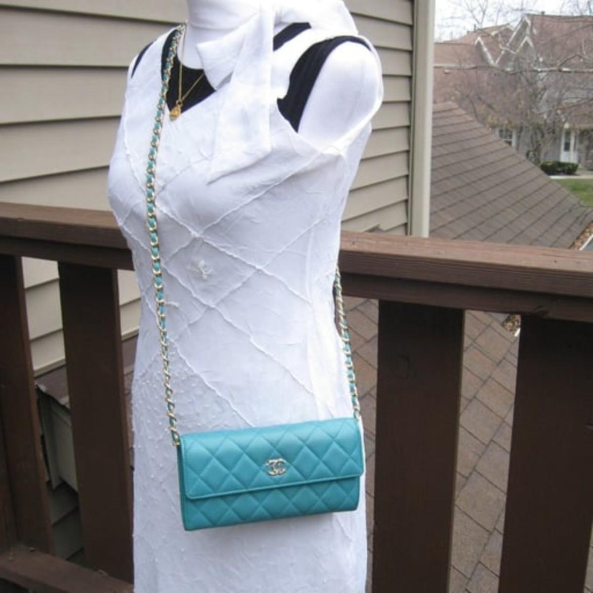 A beautiful authentic Chanel Turquoise Lambskin Leather CC Flap Wallet in good condition. Outside leather has scratches, dis-coloration, some stain marks around top corners but not too visible, a little wears at corner edges and along the edges. A very special beautiful CC logo decorates impressively in front. Generally, the purse is still in beautiful condition and extremely gorgeous! Inside leather has very good condition with scratches, some tiny stains around button. It has 5 different size pockets and 12 card lots for you to arrange stuffs. All of them are in good clean condition, except the one with zipper has a little bit dust stain. Appr. Dim.: L 7.5", H 4.25", single strap drop about 21", double strap drop about 10.5". It can fit iPhone X and will come with storage box. You can wear it cross body with the unbranded chain which was added after market.