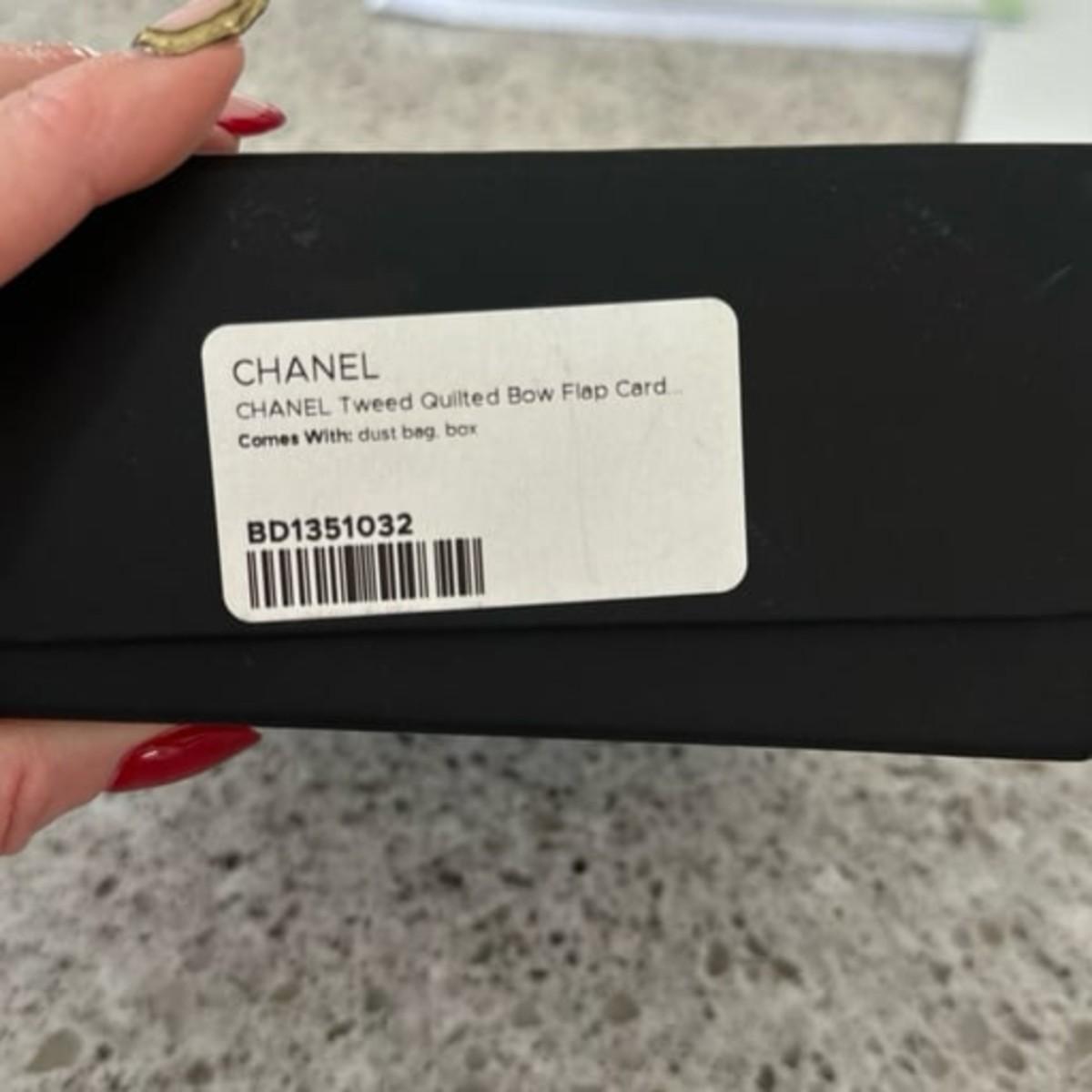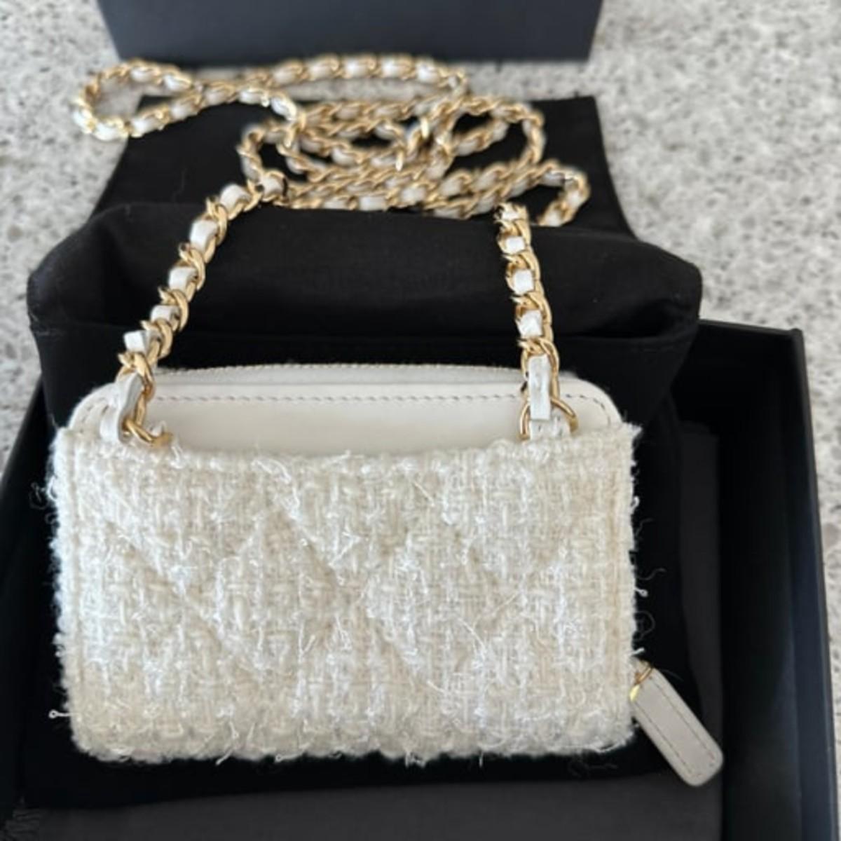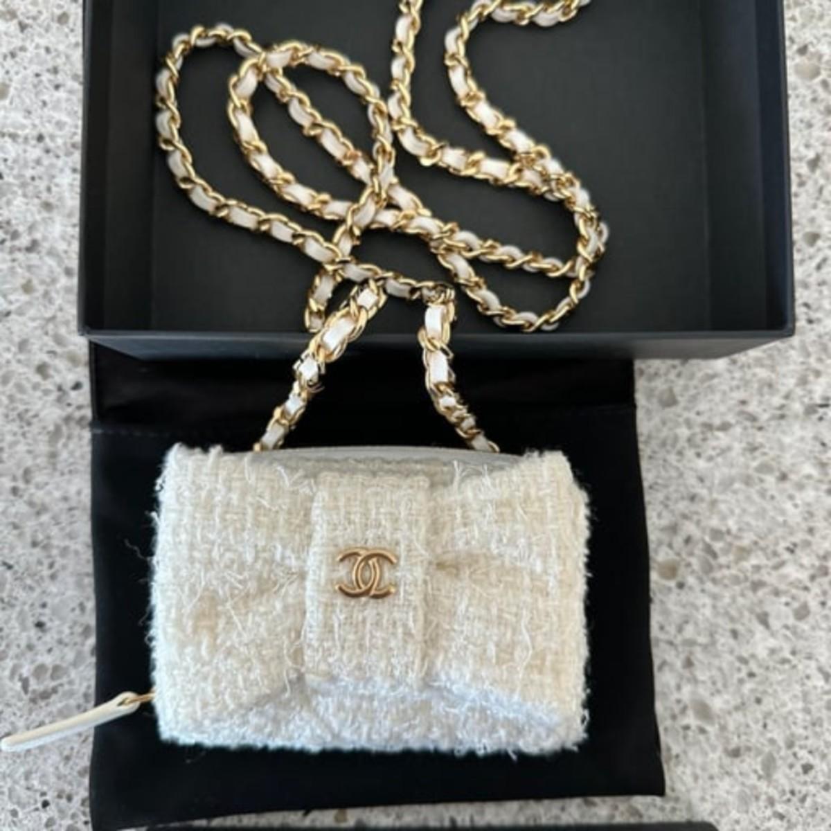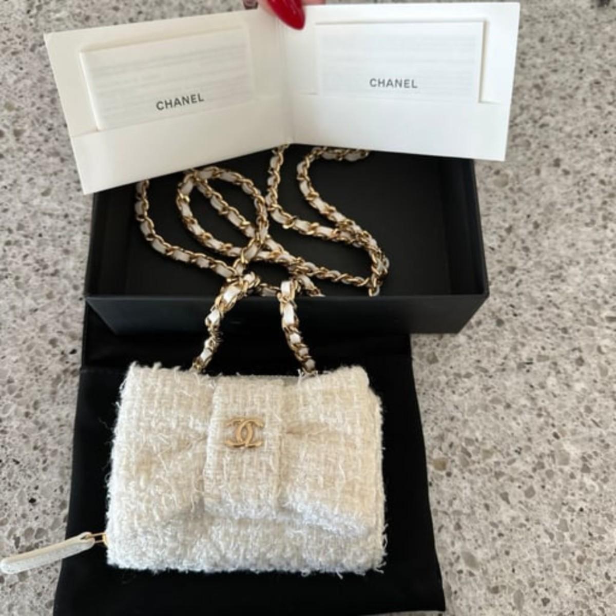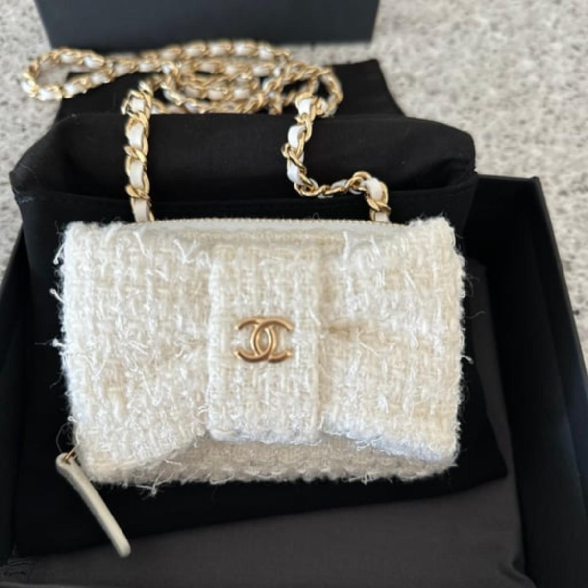 Chanel Tweed Quilted Bow Flap Card Holder On Chain White