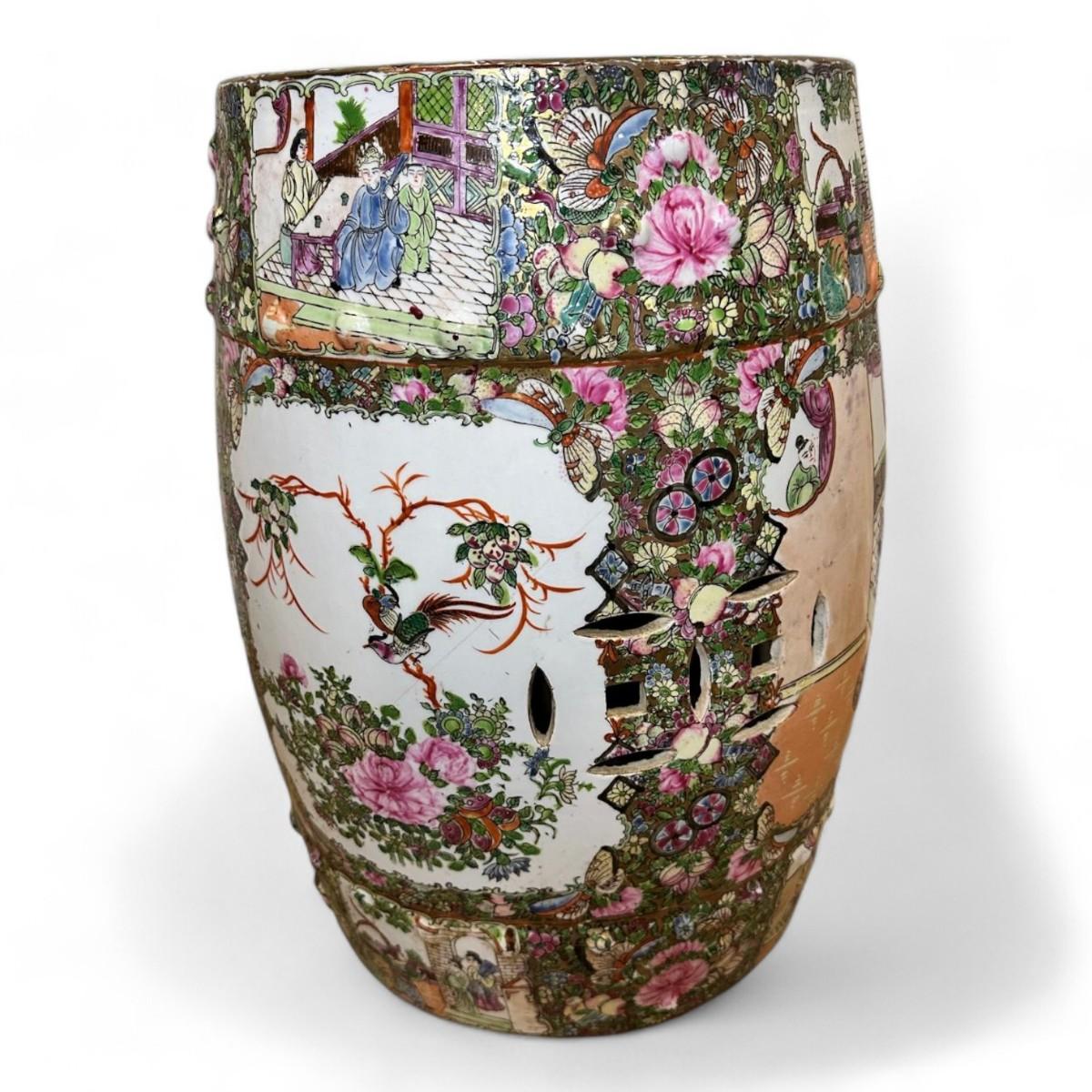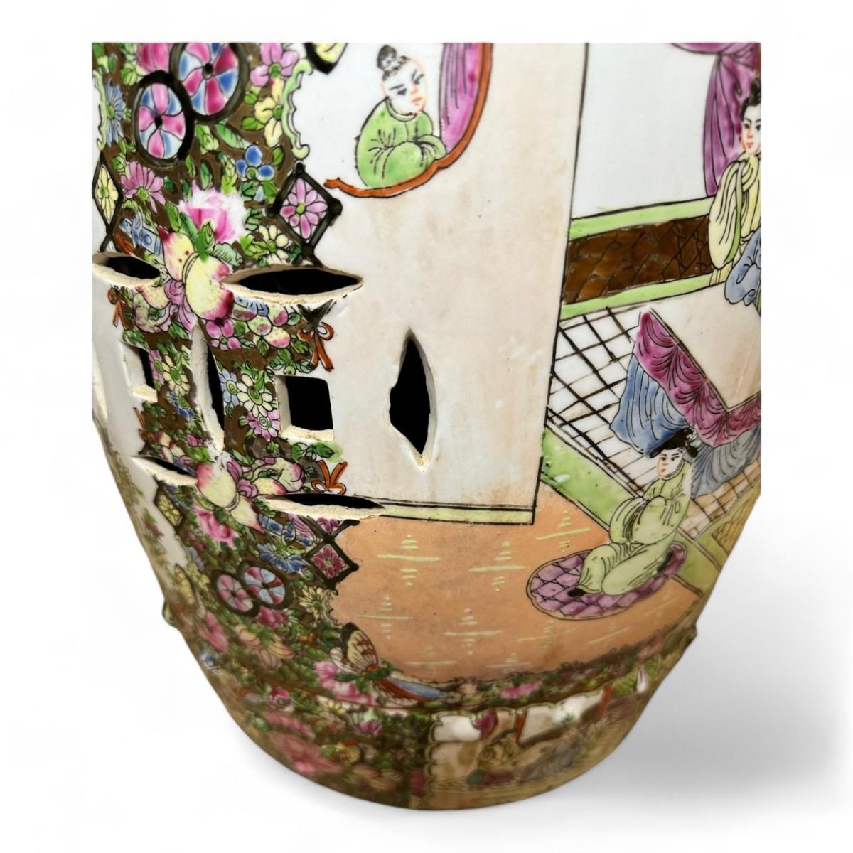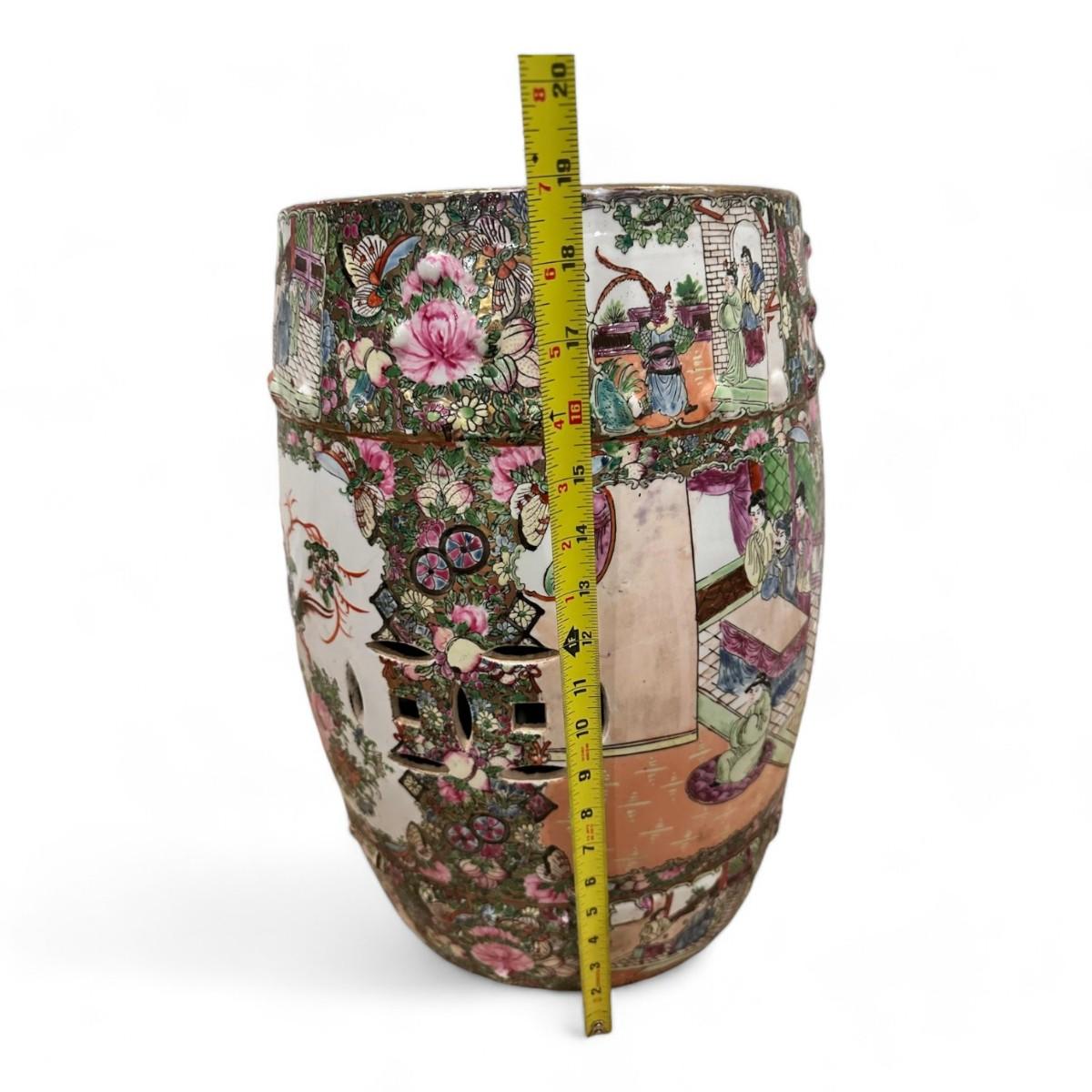 The Chinoiserie Rose Medallion Garden Stool is a stunning example of intricate Asian-inspired design featuring a vibrant hand-painted tableau of elegant figures and lush foliage. The medallion motif is adorned with colorful depictions of people amidst delicate plants and a charming bird all set against a harmonious backdrop of pastel hues. This garden stool combines artistic flair with practical functionality making it a captivating addition to any garden or interior space.