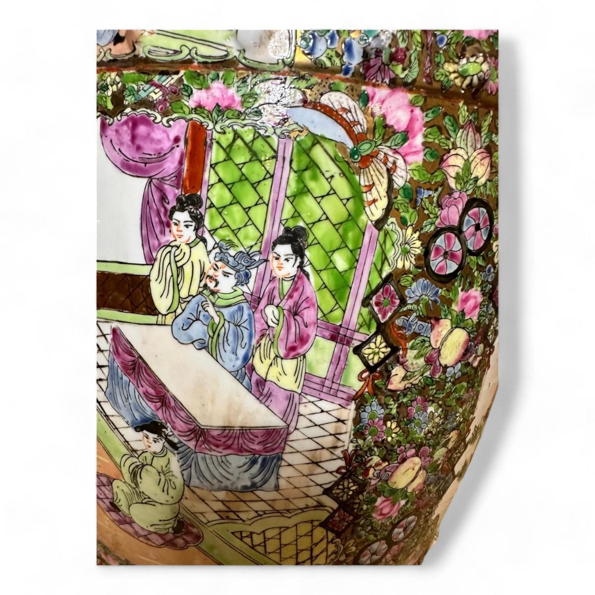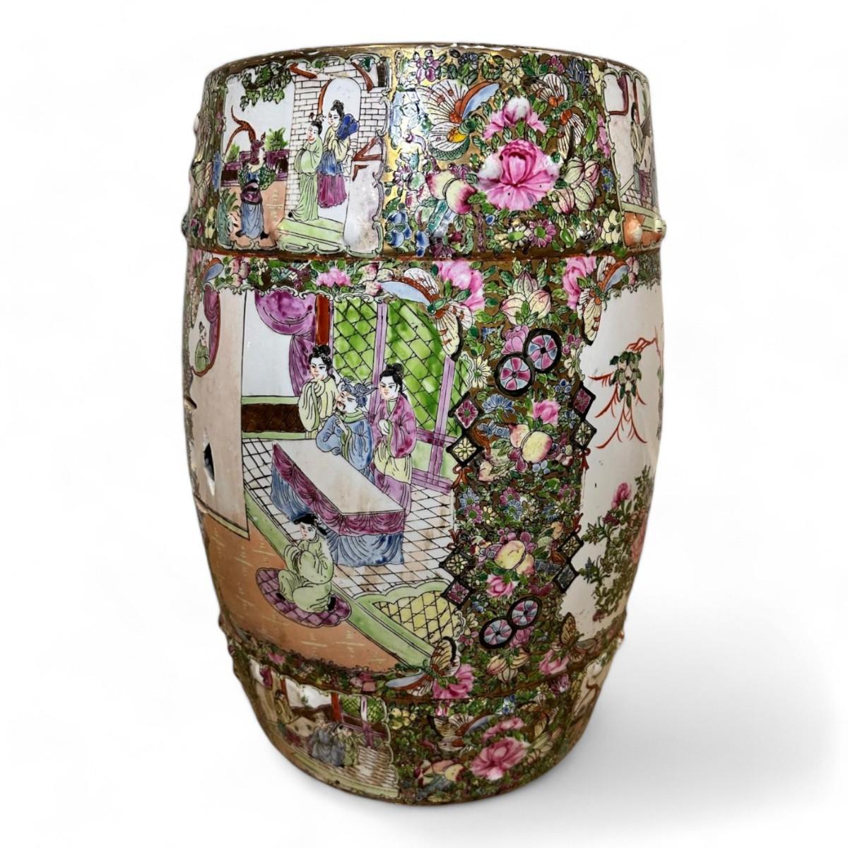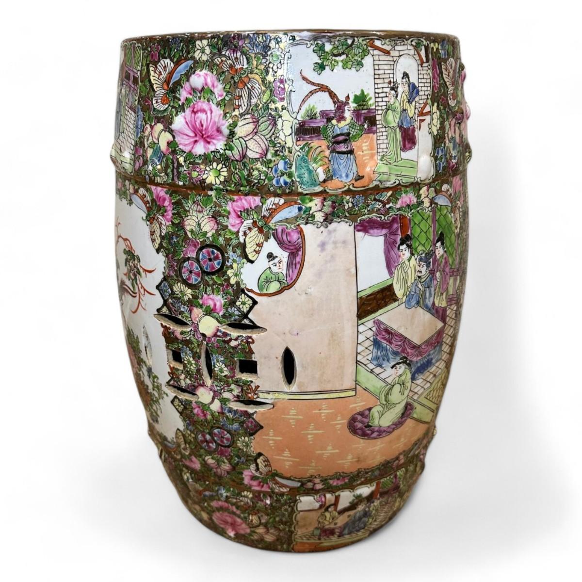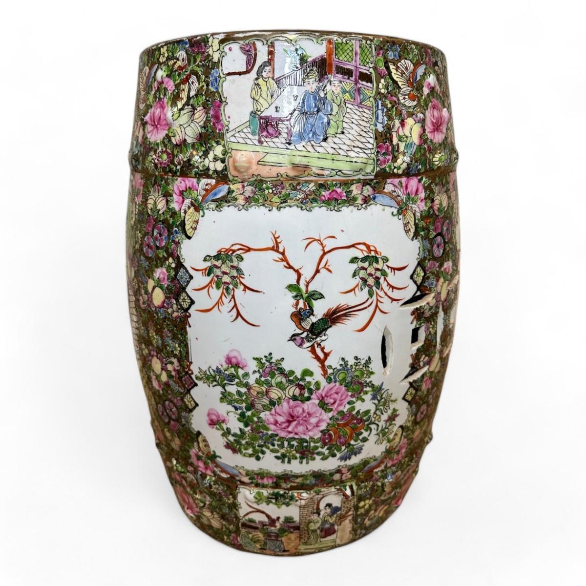 The Chinoiserie Rose Medallion Garden Stool is a stunning example of intricate Asian-inspired design featuring a vibrant hand-painted tableau of elegant figures and lush foliage. The medallion motif is adorned with colorful depictions of people amidst delicate plants and a charming bird all set against a harmonious backdrop of pastel hues. This garden stool combines artistic flair with practical functionality making it a captivating addition to any garden or interior space.