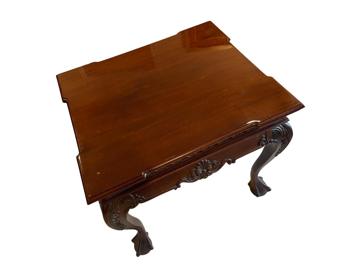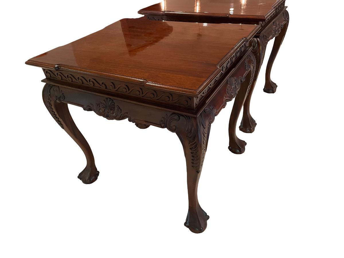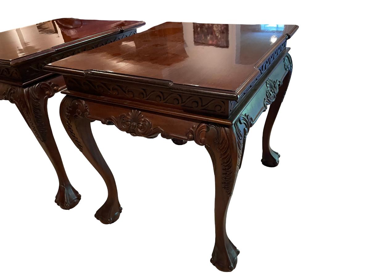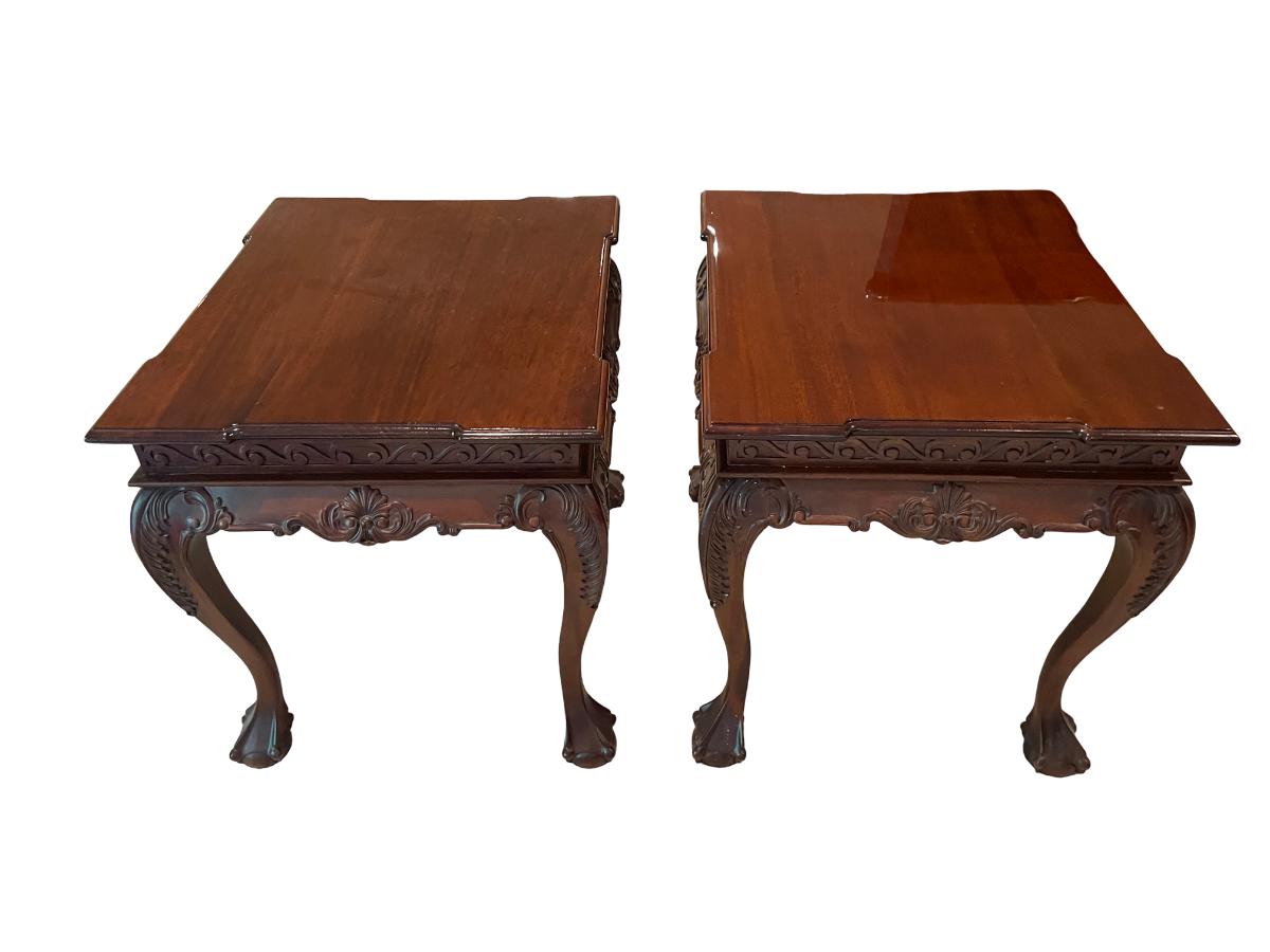 This pair of matching side tables are study, heavy and beautifully maintained. Each table has been crafted featuring intricate carving details along the apron and sides, including scrolling flourishes and floral motifs. Each table is supported by cabriole legs with clawed feet. The rectangular tops have gently curved edges. Surfaces include a polished finish. 24h x 22 x 26 1/2d.