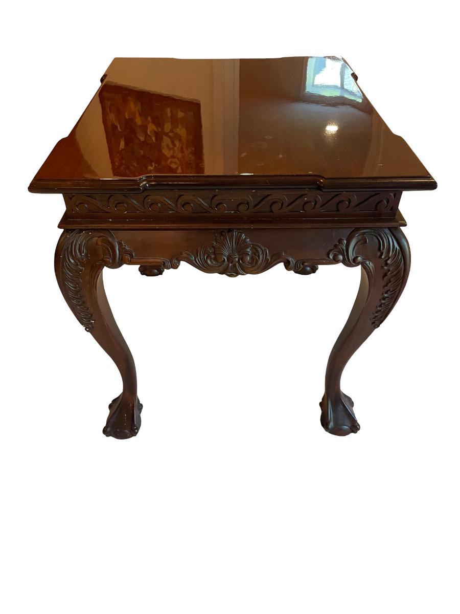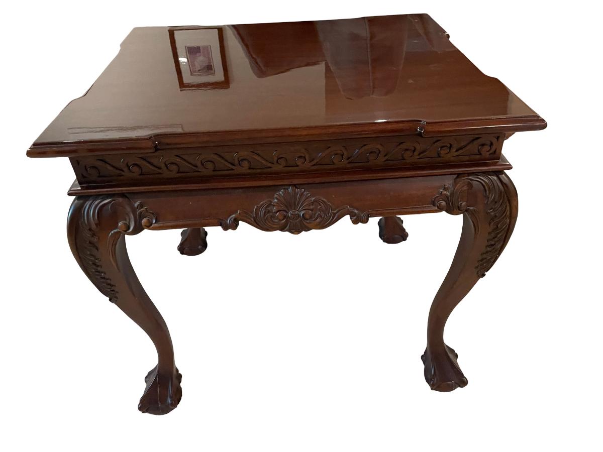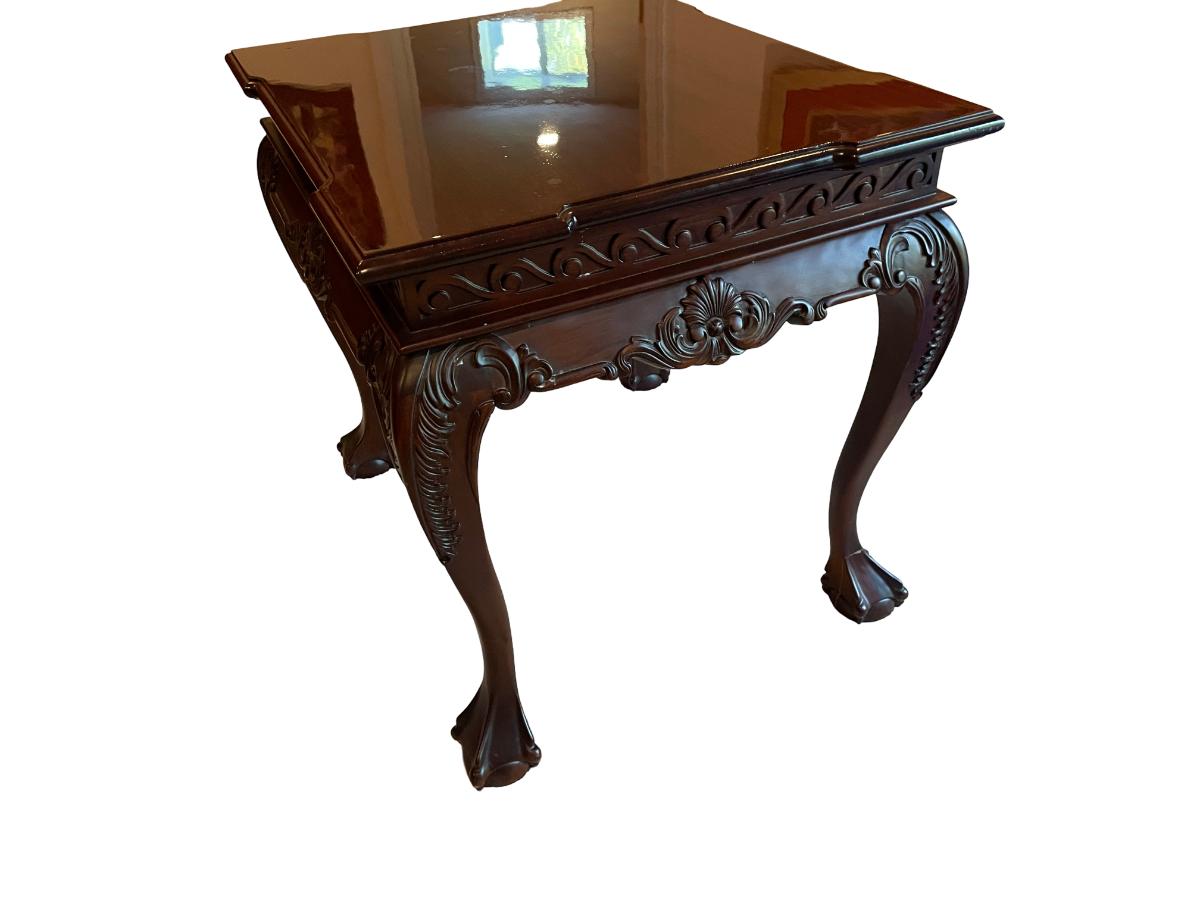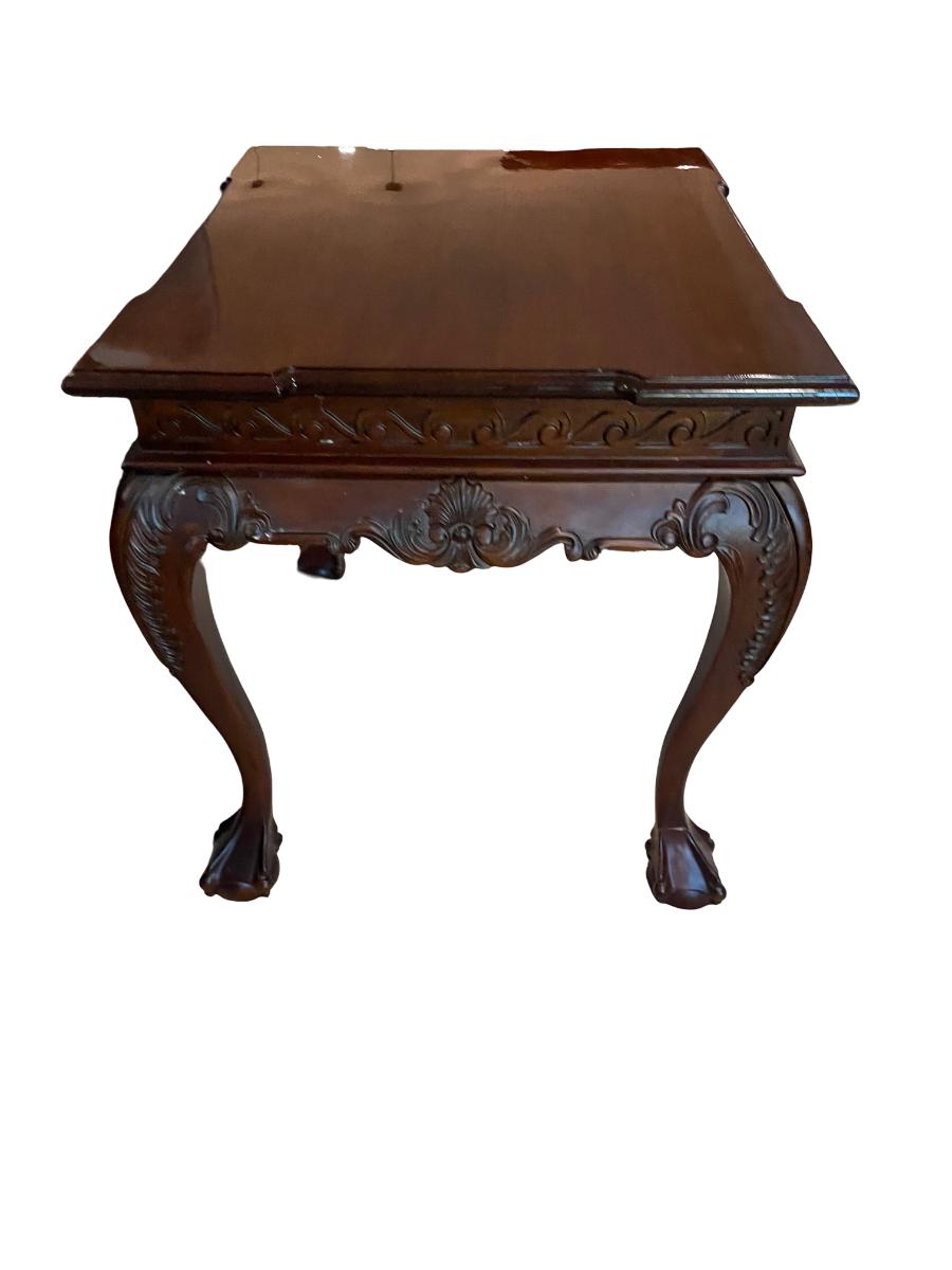 This pair of matching side tables are study, heavy and beautifully maintained. Each table has been crafted featuring intricate carving details along the apron and sides, including scrolling flourishes and floral motifs. Each table is supported by cabriole legs with clawed feet. The rectangular tops have gently curved edges. Surfaces include a polished finish. 24h x 22 x 26 1/2d.
