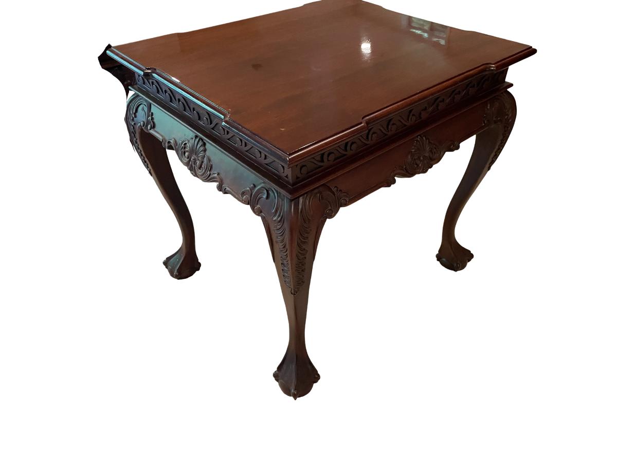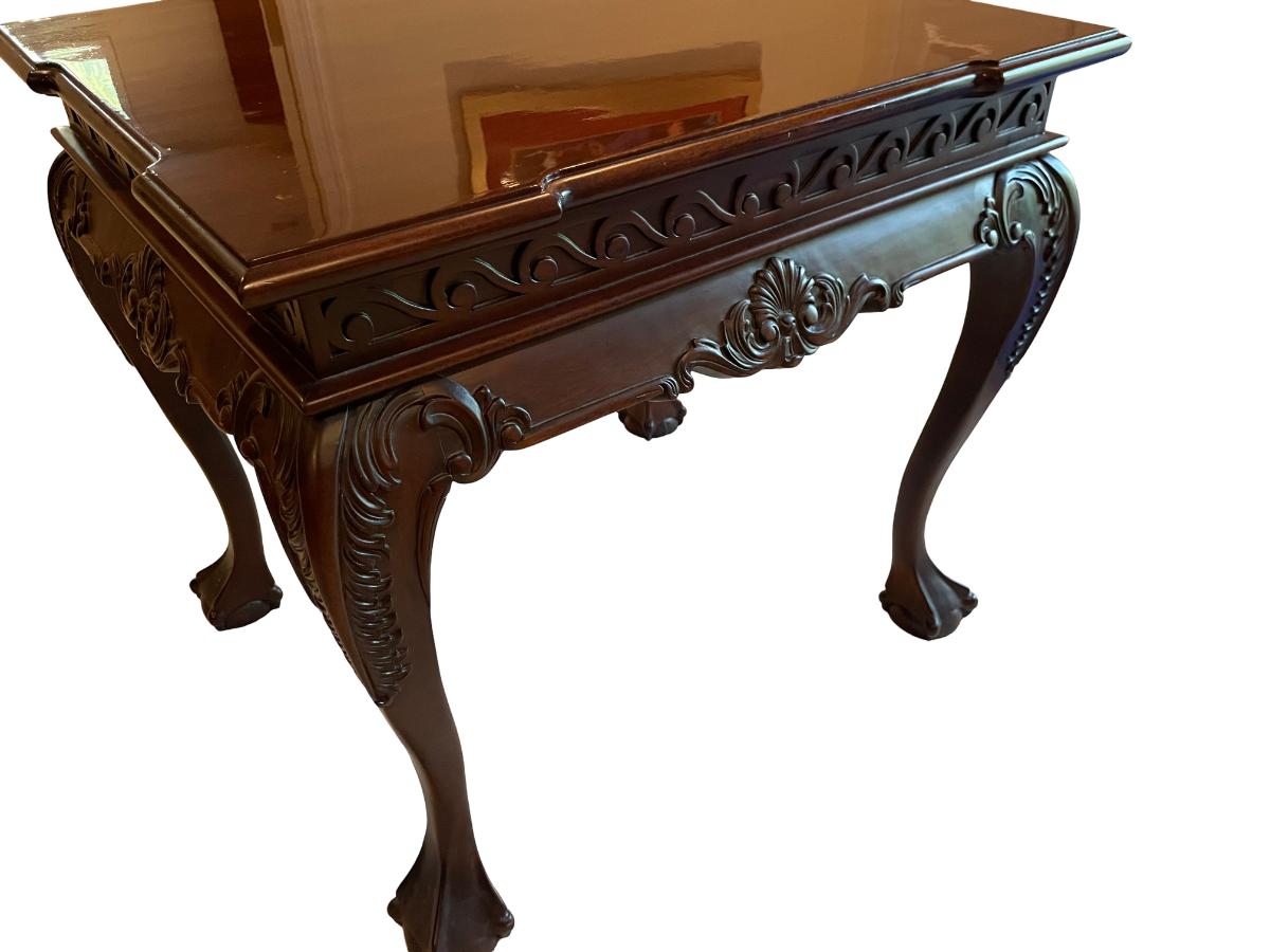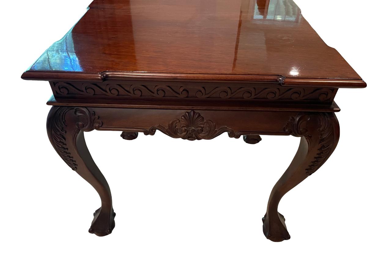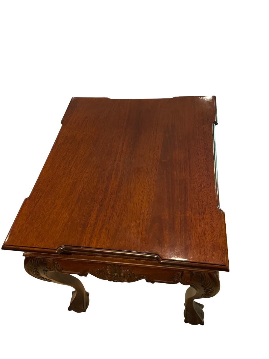This pair of matching side tables are study, heavy and beautifully maintained. Each table has been crafted featuring intricate carving details along the apron and sides, including scrolling flourishes and floral motifs. Each table is supported by cabriole legs with clawed feet. The rectangular tops have gently curved edges. Surfaces include a polished finish. 24h x 22 x 26 1/2d.