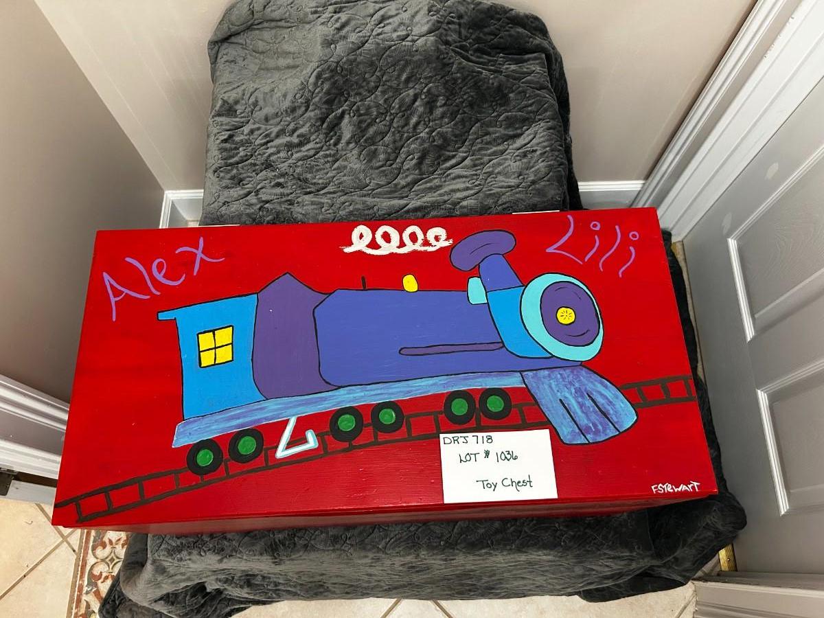 This vintage toy box is hand painted with a choo choo train theme! If you happen to have kids or grandkids with the same names on the box, you're in luck but if not, you could repaint of course!