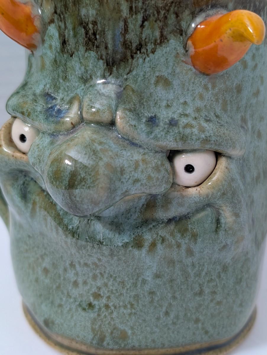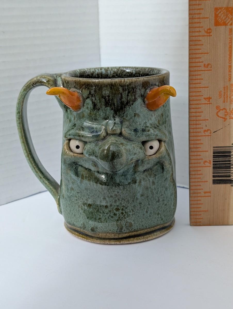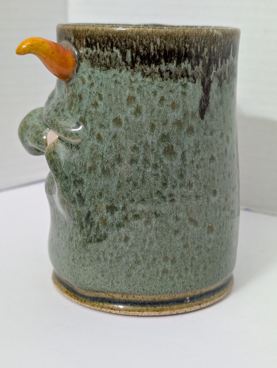 Clay Monster Handcrafted Stoneware Monster Face Mug Figural Green Glaze Studio Pottery