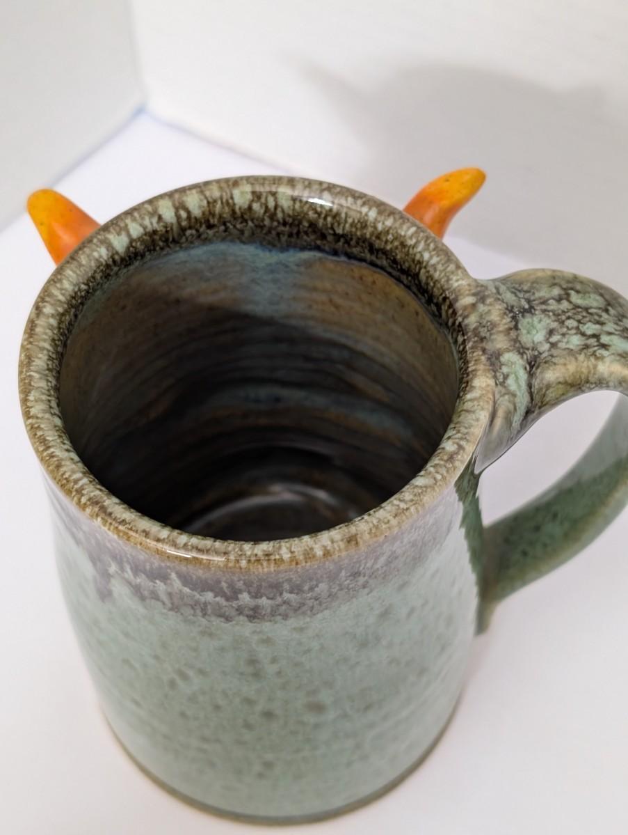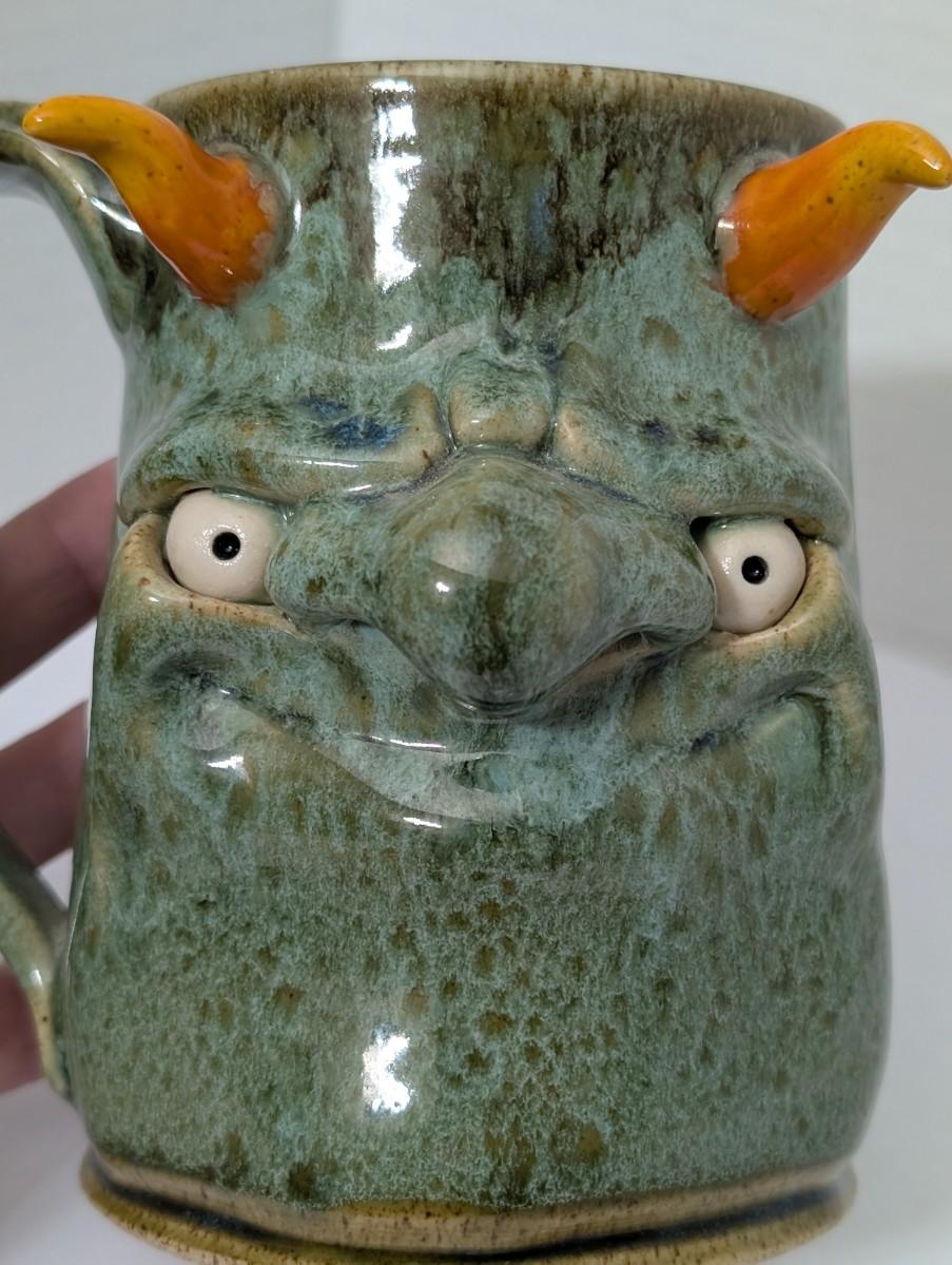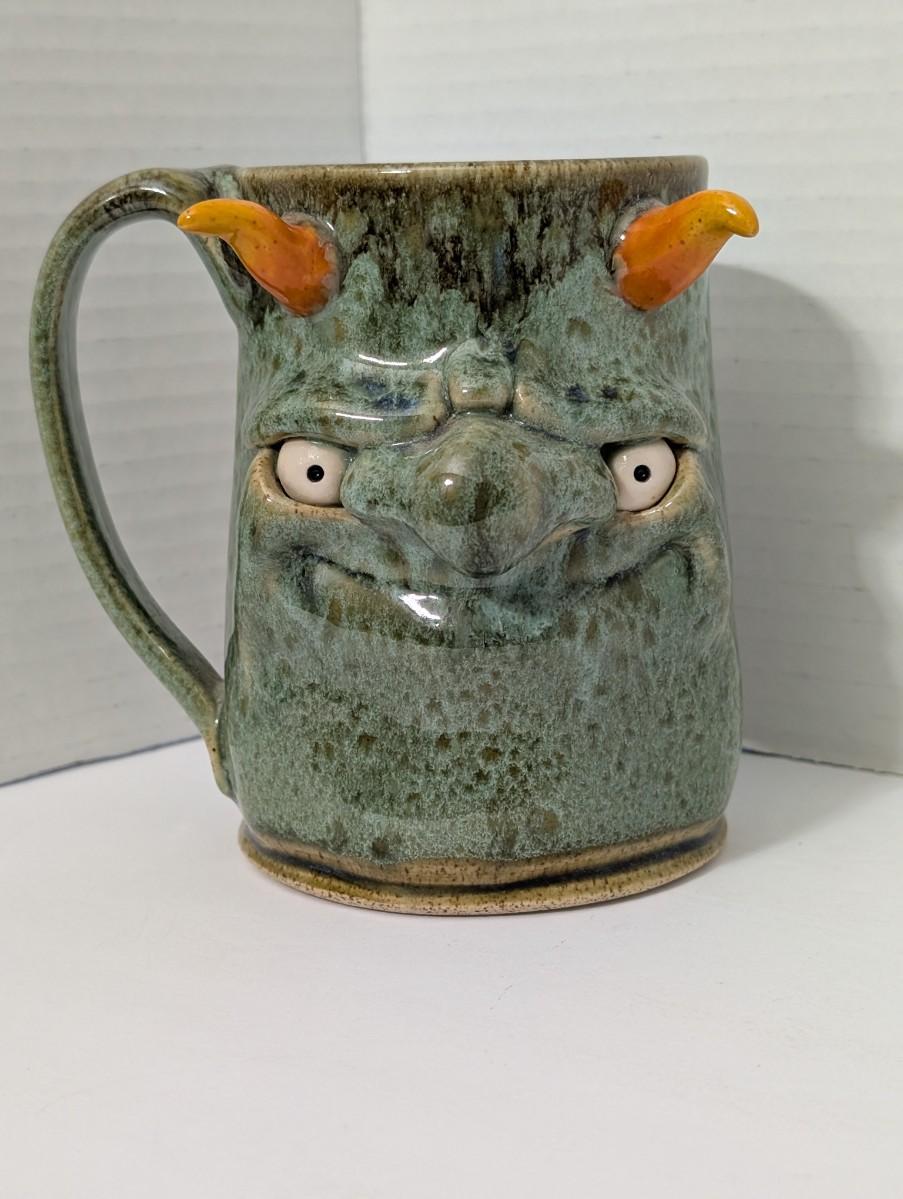 Clay Monster, monster mug, stoneware mug, figural mug, studio pottery, handmade ceramic, novelty mug, green glaze, horned monster, collectible mug, art pottery, whimsical pottery