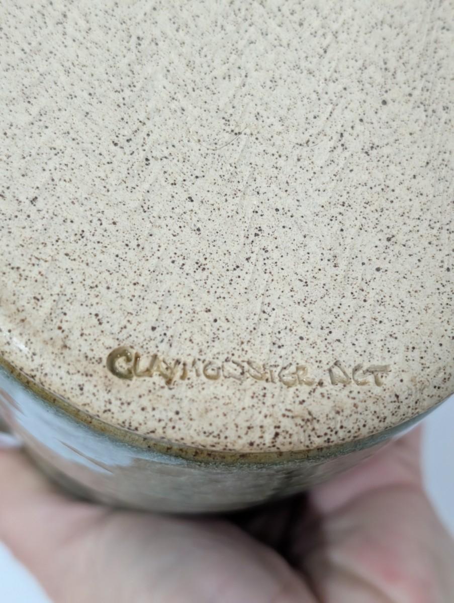 Handcrafted stoneware mug stamped Clay Monster on the base. Features a sculpted monster face with exaggerated eyes, expressive facial detailing, and raised orange horn accents along the rim. Finished in a mottled green glaze with earthy brown undertones and natural speckling, consistent with studio pottery production. Heavy ceramic construction with an attached handle, created as a novelty figural mug and collectible art pottery piece. Designed for functional use or display, appealing to collectors of handmade ceramics, monster themed mugs, and whimsical studio pottery.