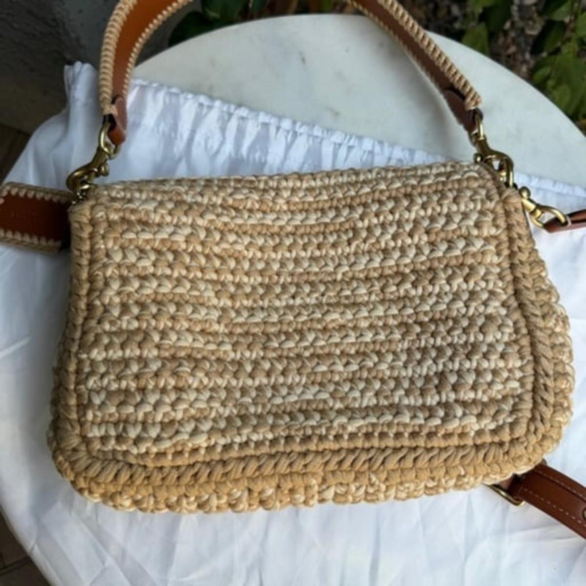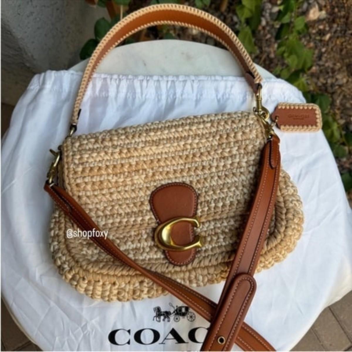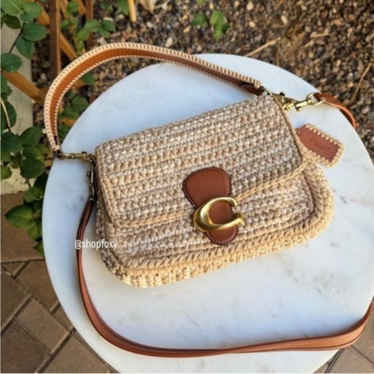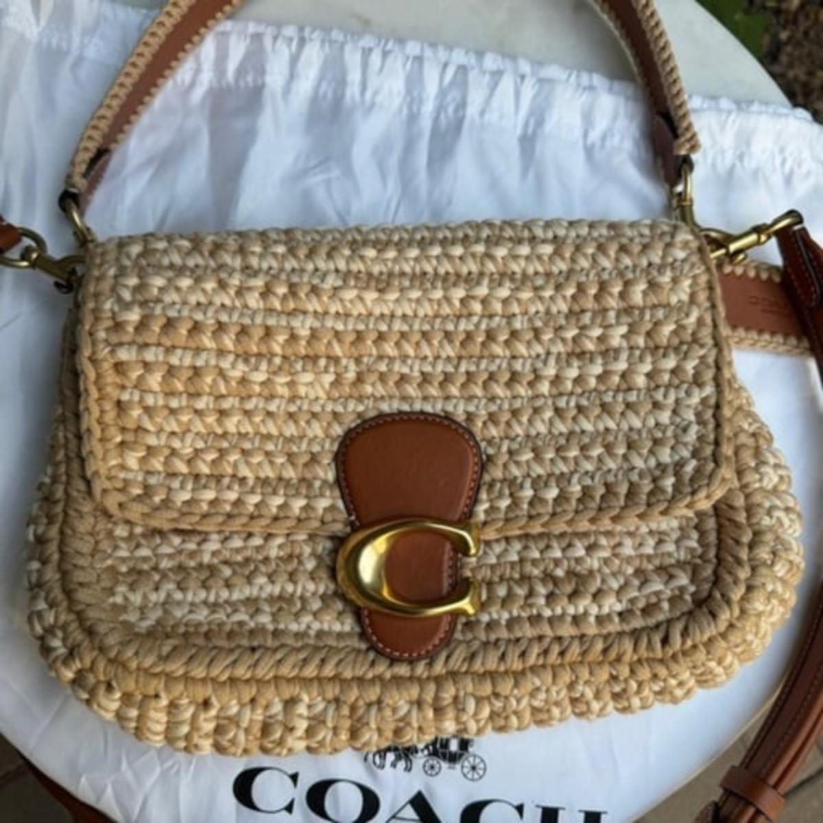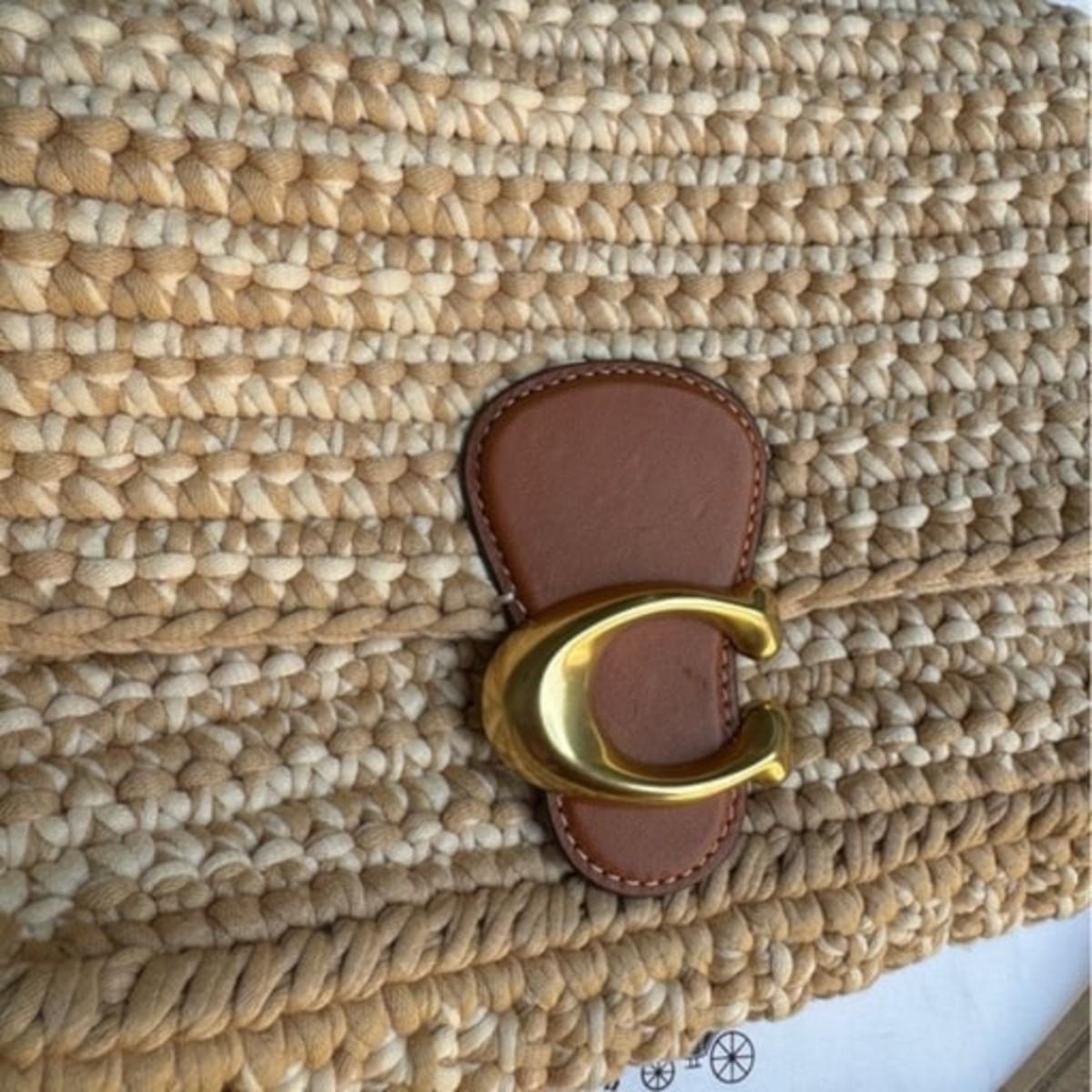 Coach Crochet Soft Tabby Shoulder Bag brown tan leather and crochet fabric gold tone hardware removable top handle and removable adjustable shoulder strap magnetic flap closure ships with dust bag new without tags never carried no wear to note no longer available online
