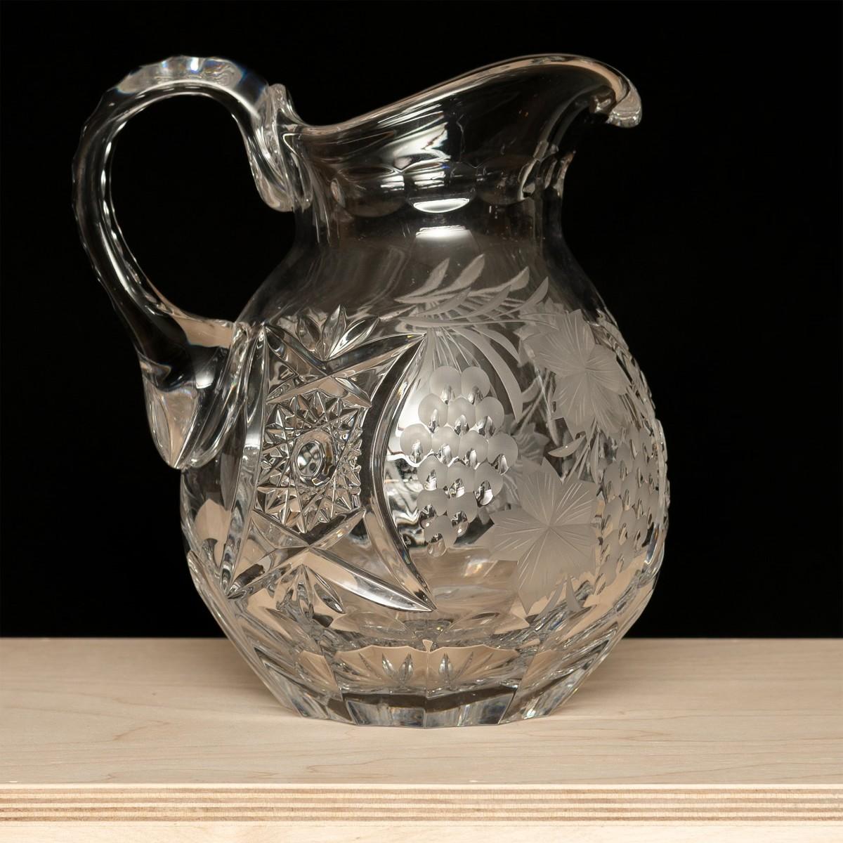Vintage Cut Crystal Pitcher with etched design all around. No chips or cracks.